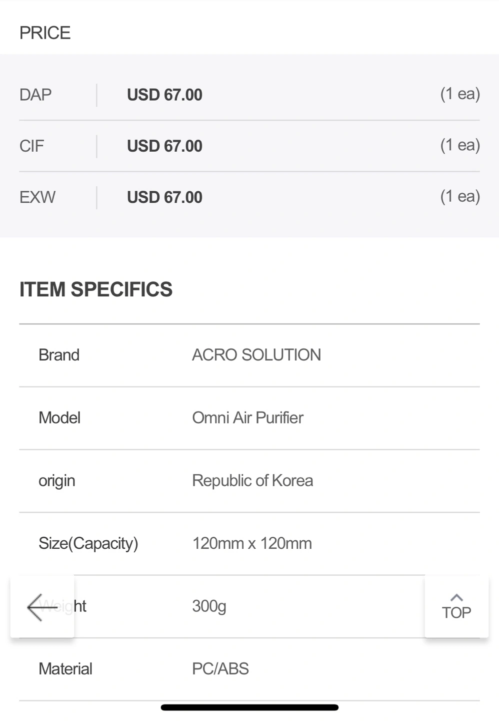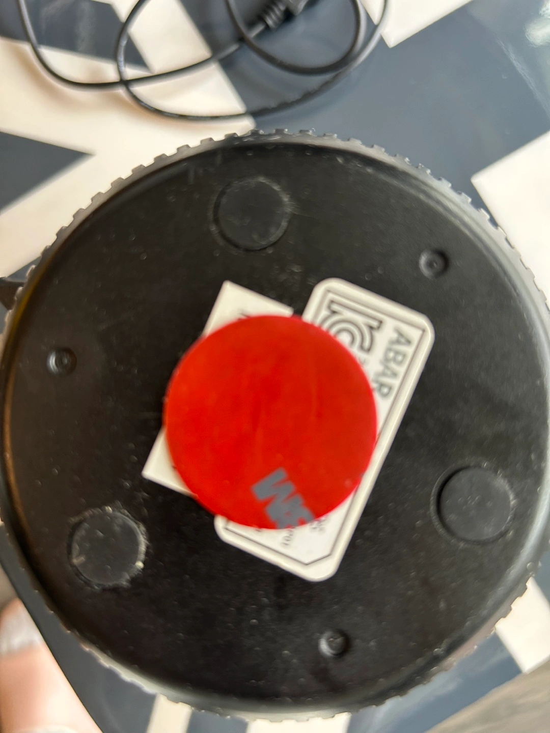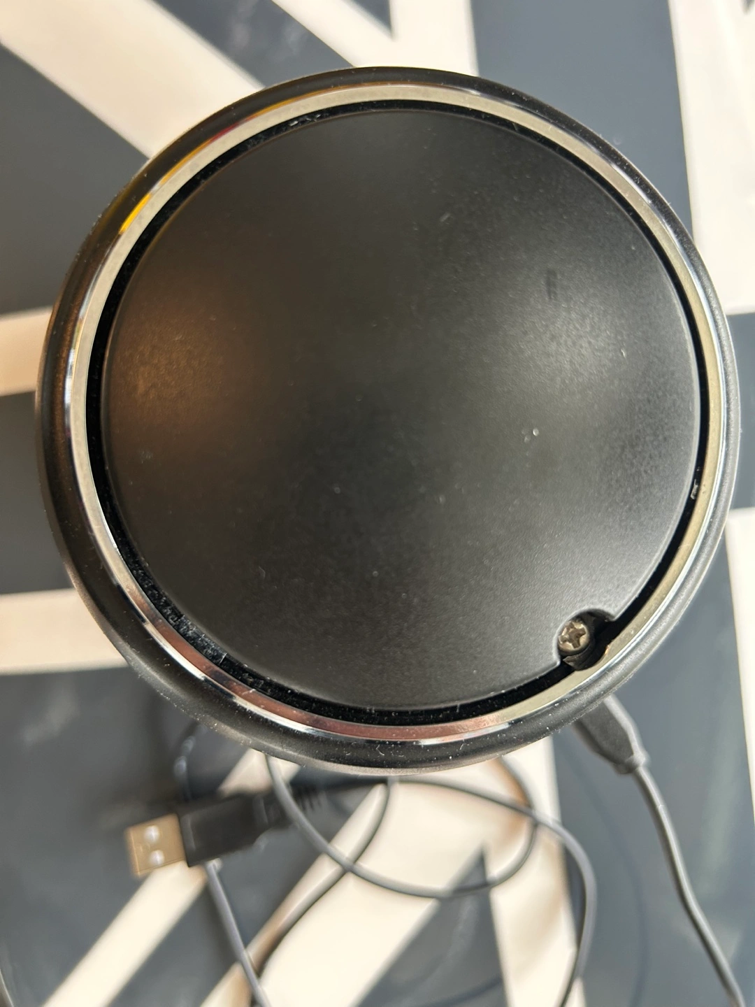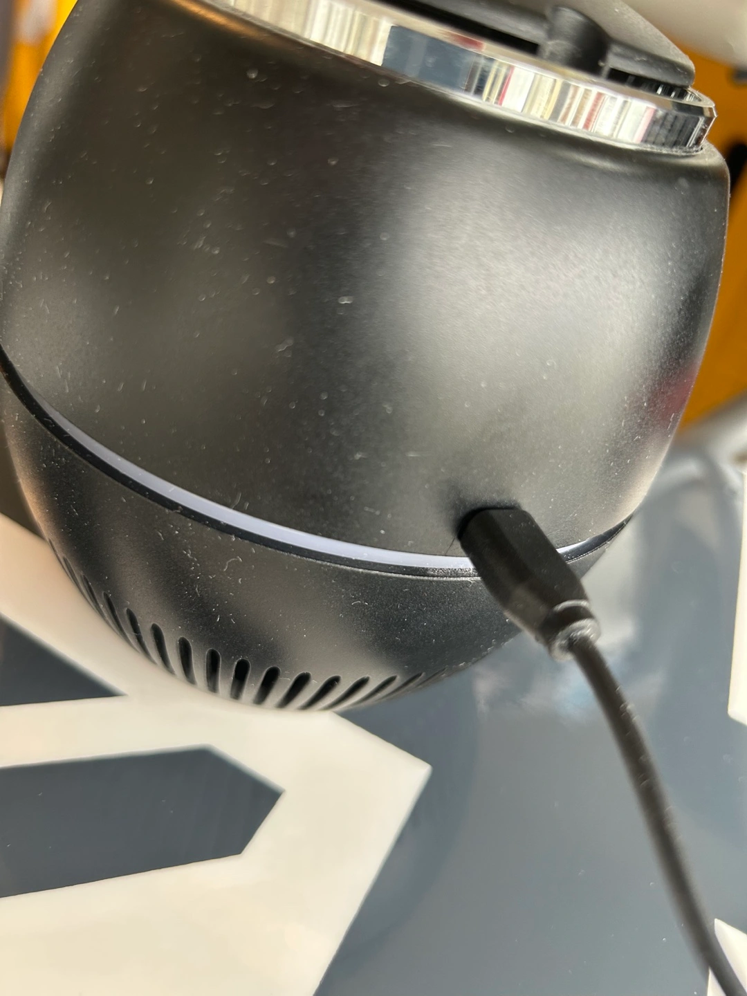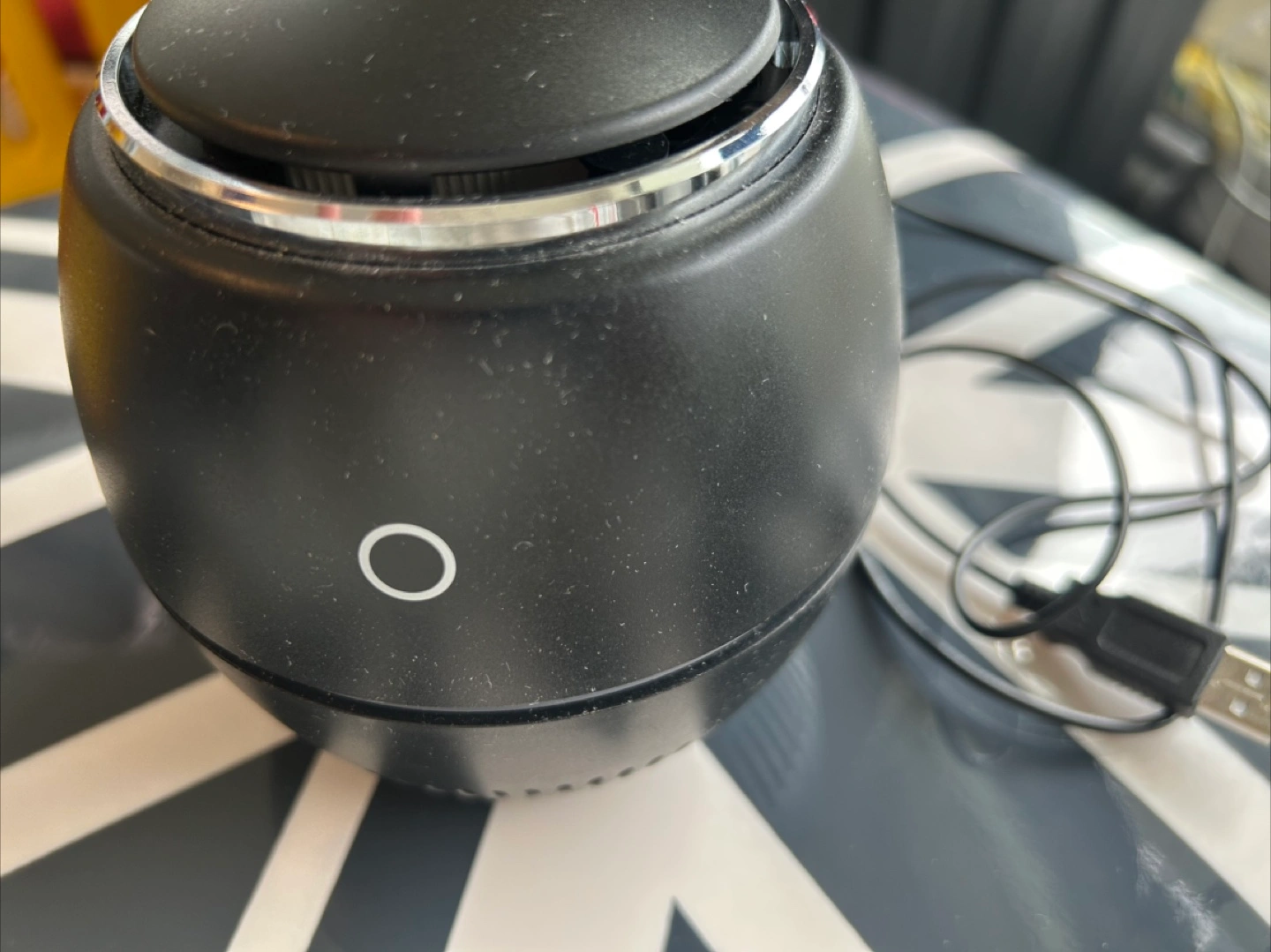 Small, portable air purifier. Black, round design. USB powered. Good for office and home.