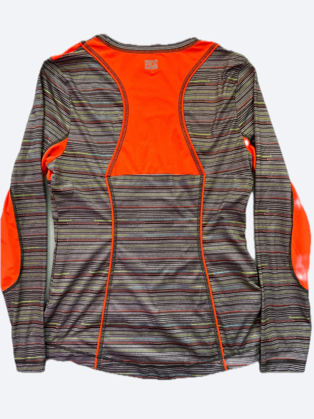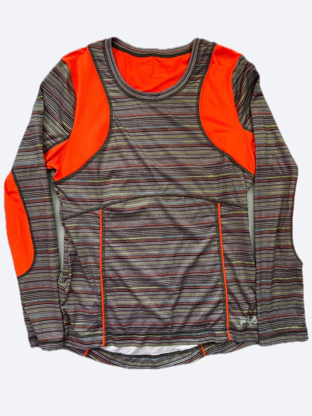 Long sleeve athletic shirt. Grey and orange. Moisture-wicking fabric. Great for running or working out.