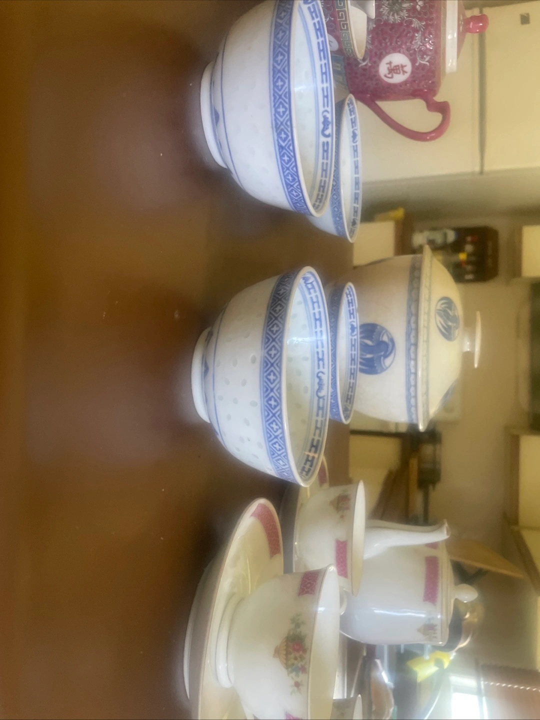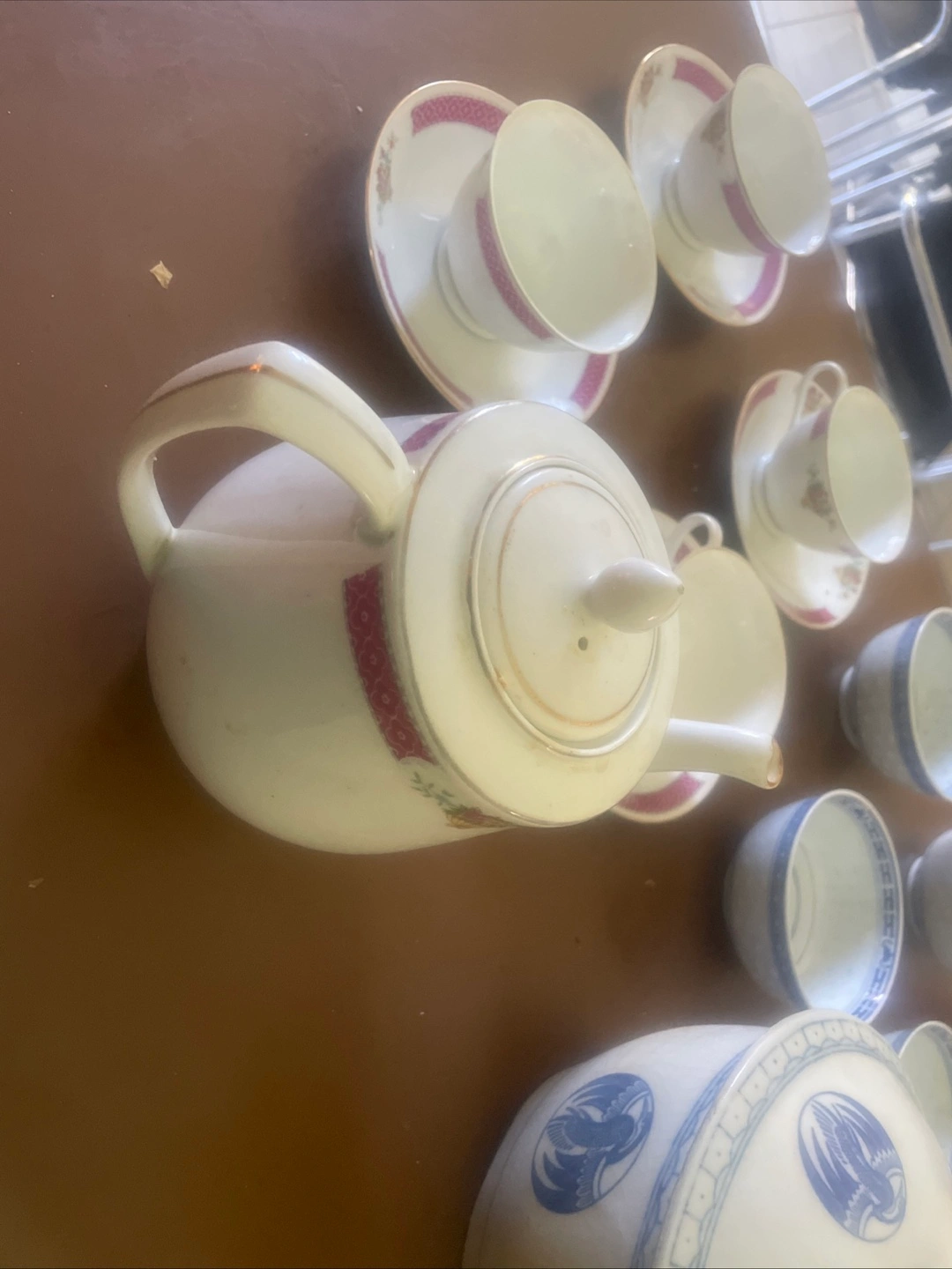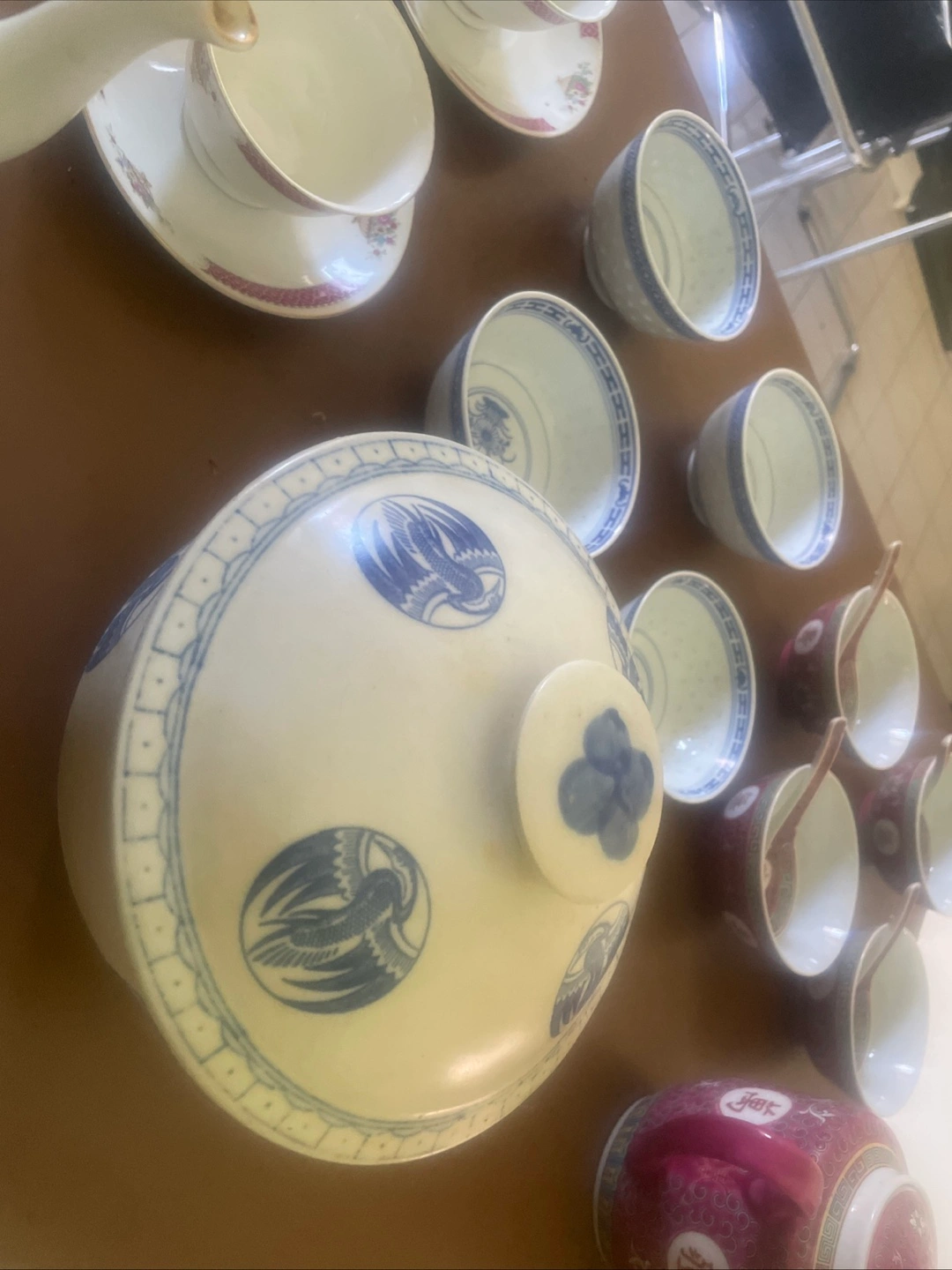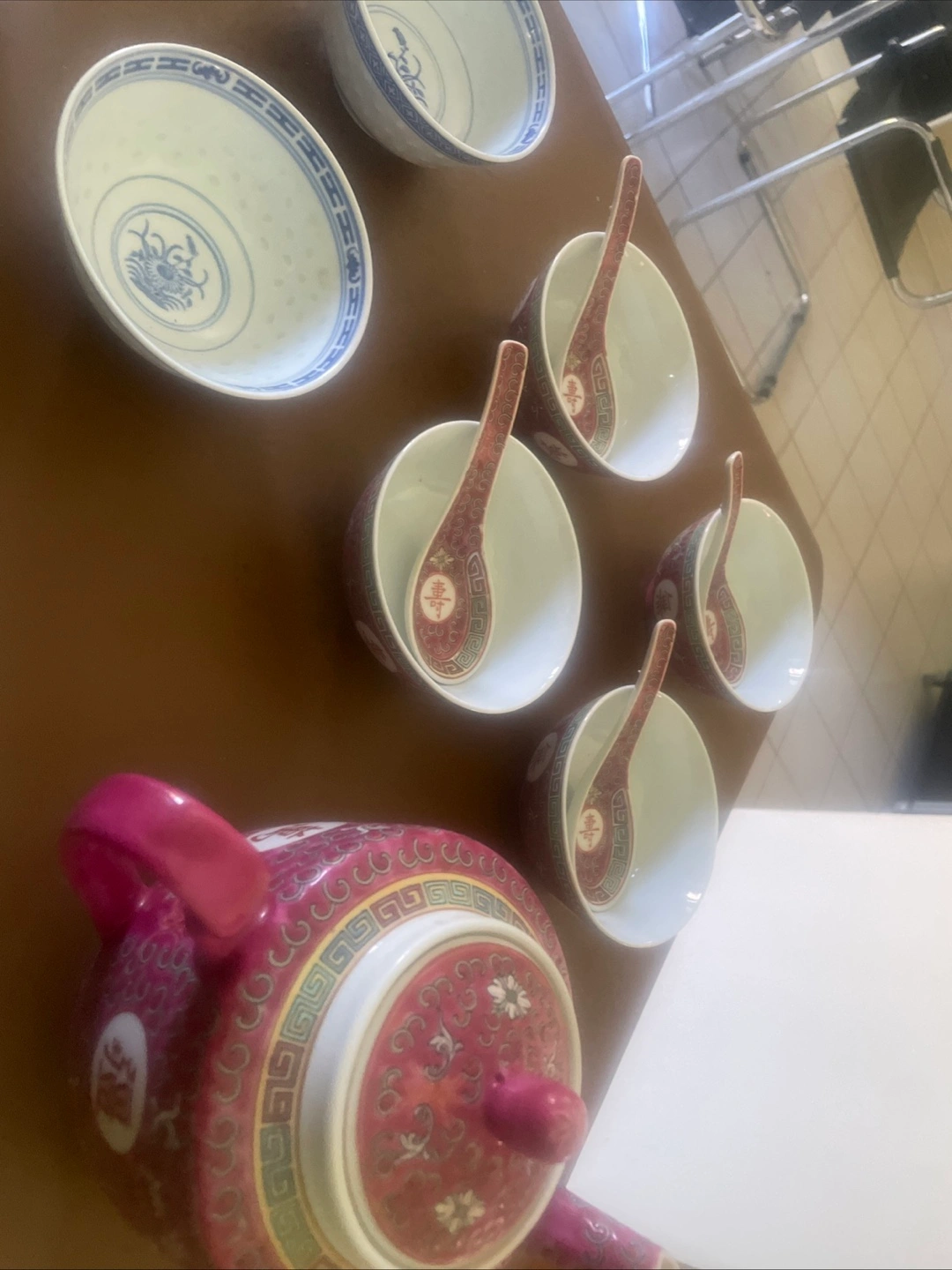 Collection of vintage porcelain Asian tea and rice bowls. Includes teapot, cups, saucers, and rice bowls. Various colours and patterns. Great for collectors or enthusiasts. $80 for set. $3 for bowl and spoon individually $10 for set of 4 bowl and spoon.
