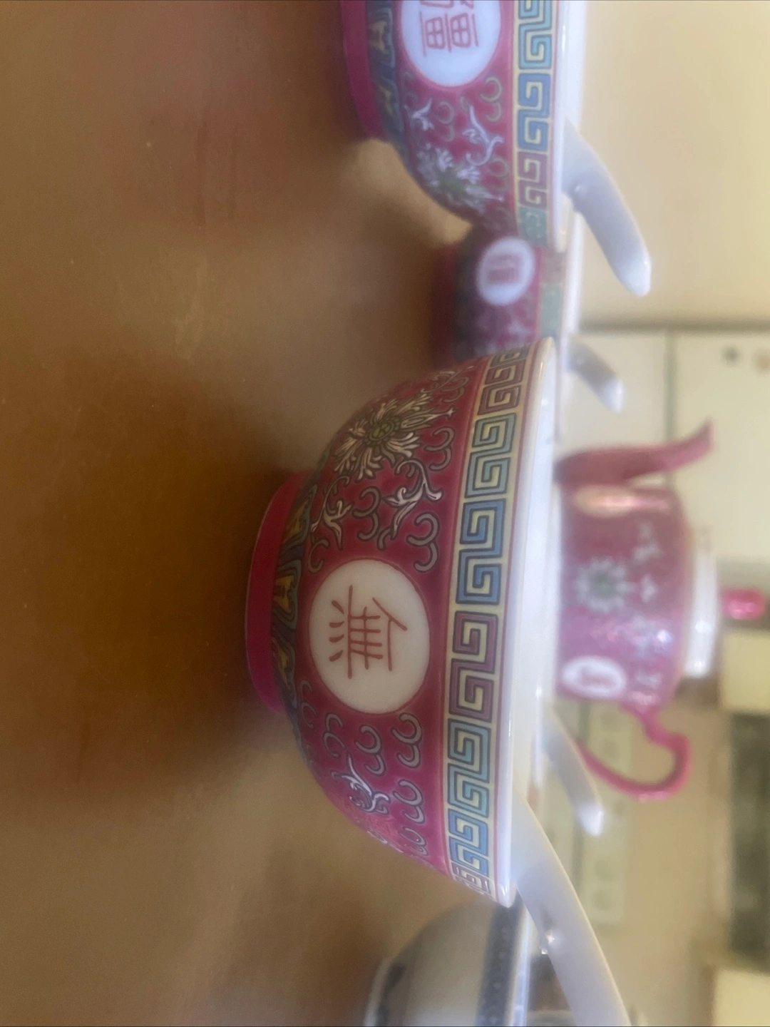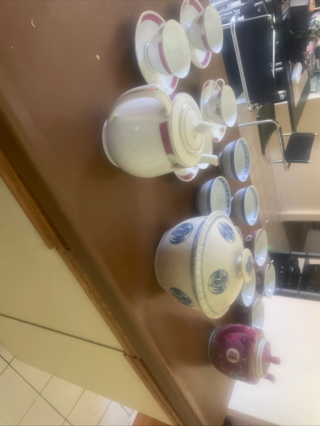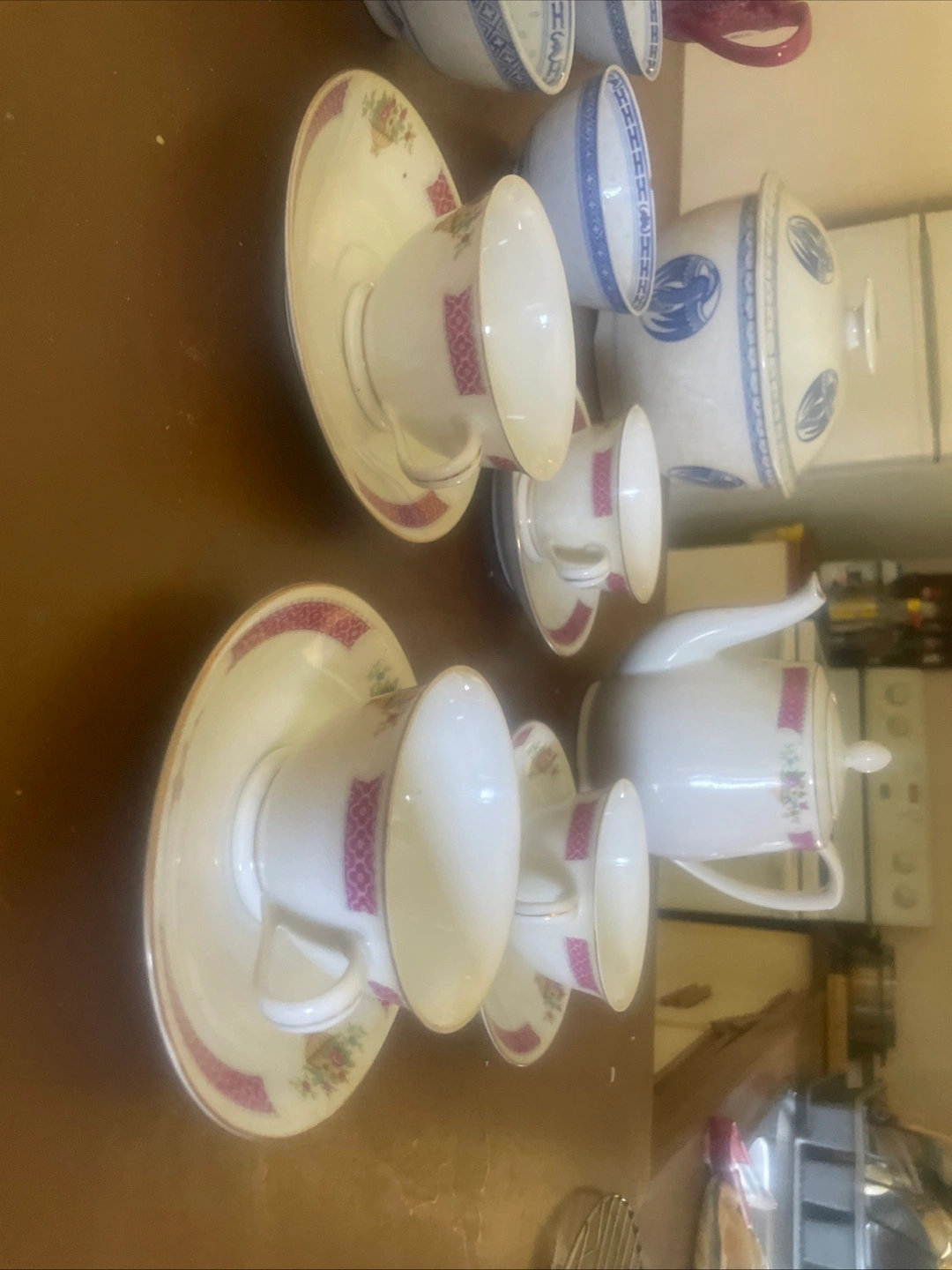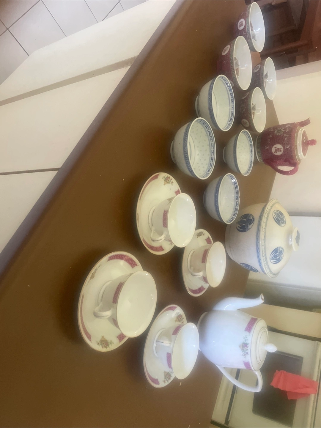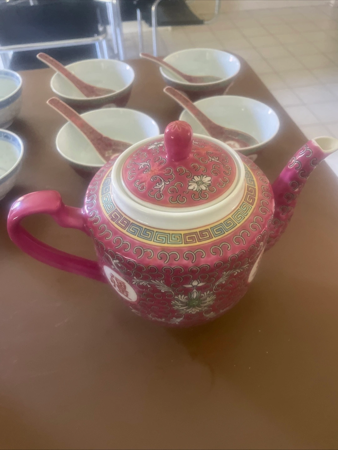 Collection of vintage porcelain Asian tea and rice bowls. Includes teapot, cups, saucers, and rice bowls. Various colours and patterns. Great for collectors or enthusiasts. $80 for set. $3 for bowl and spoon individually $10 for set of 4 bowl and spoon.