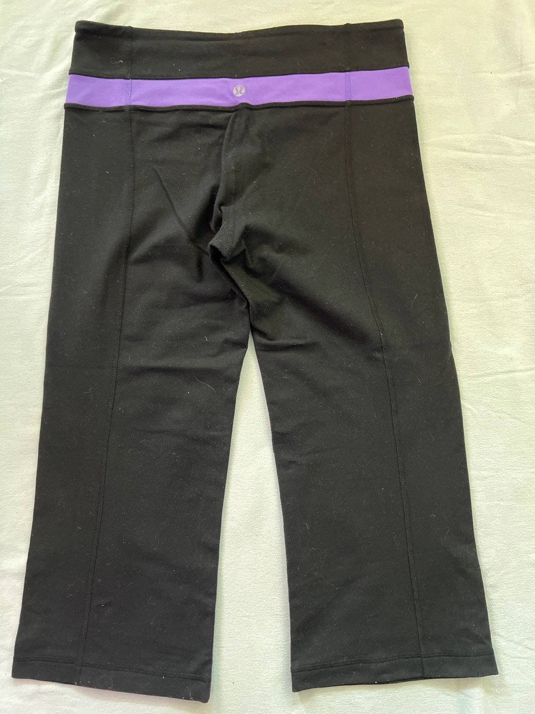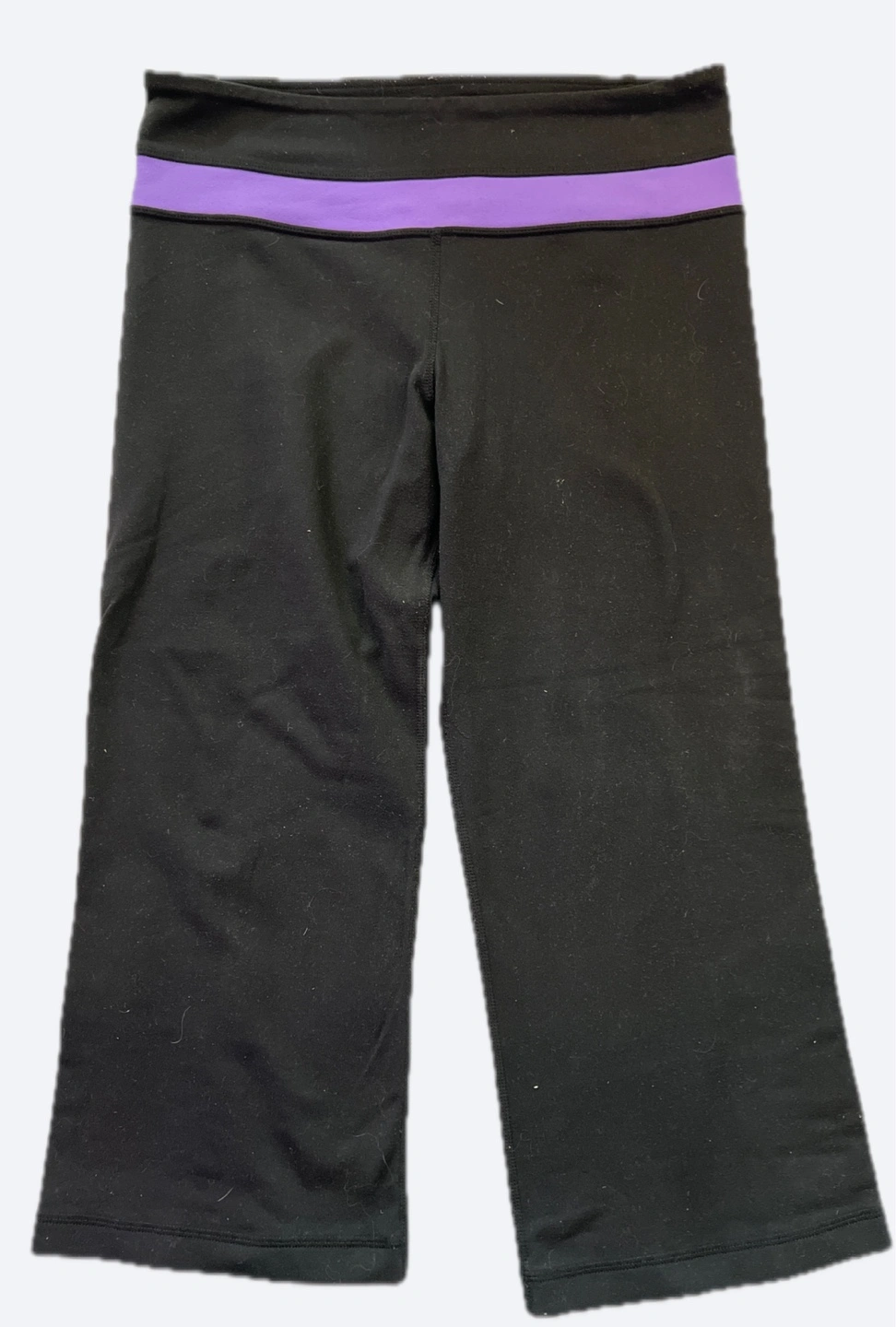 Black cropped yoga pants. Reversible . Purple waistband. Size 6. Great for yoga or casual wear.