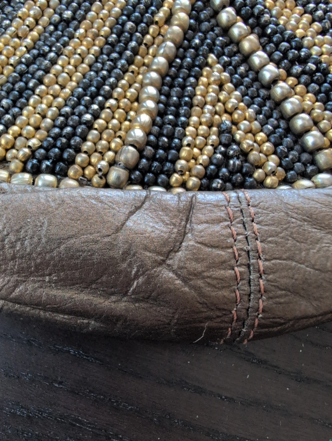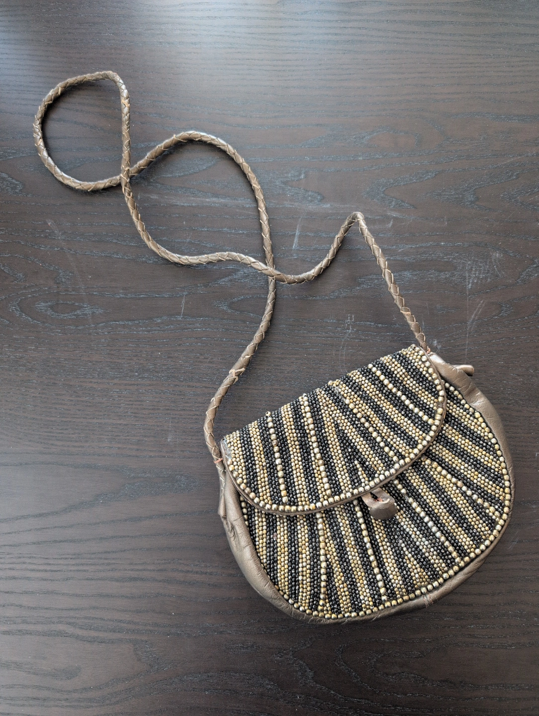 Crossbody beaded purse. Features a braided leather strap and is covered in black and gold/brassy beads. Unique design. Lined interior. beautiful leather and quality beading. purse is slightly heavier than most because of the gorgeous bead work. some very minor wear. pick up at CityPlace. $30
