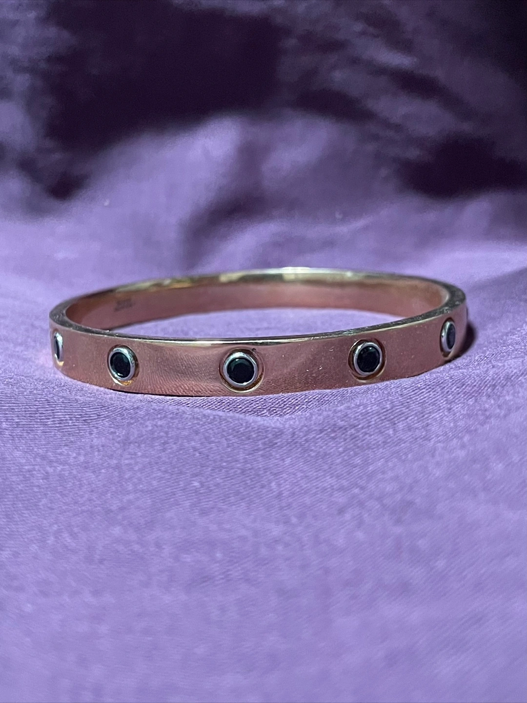 Beautiful rose gold bangle bracelet. Features small black stones. Simple and elegant design. Perfect for everyday wear.