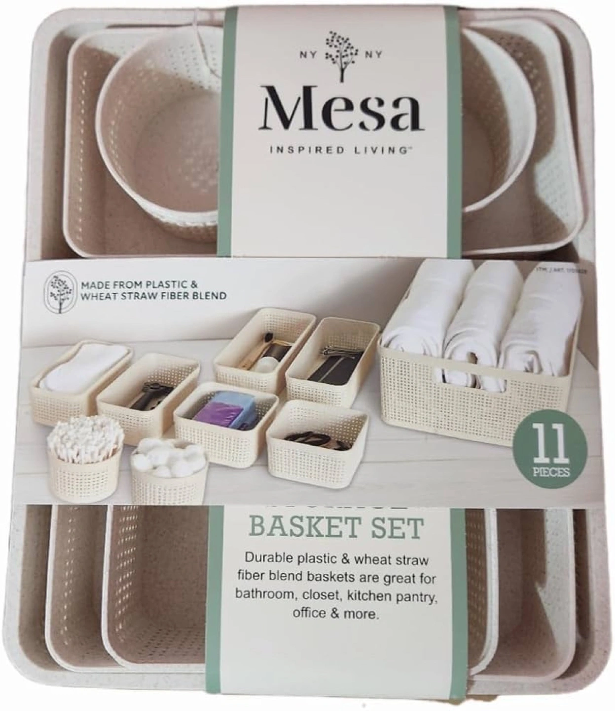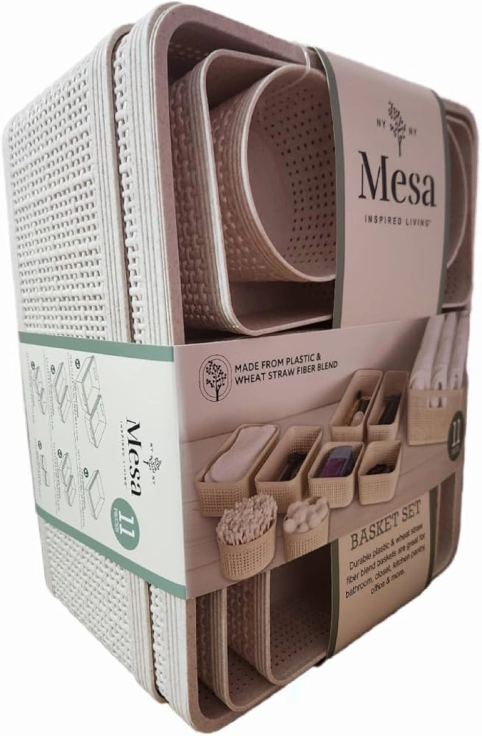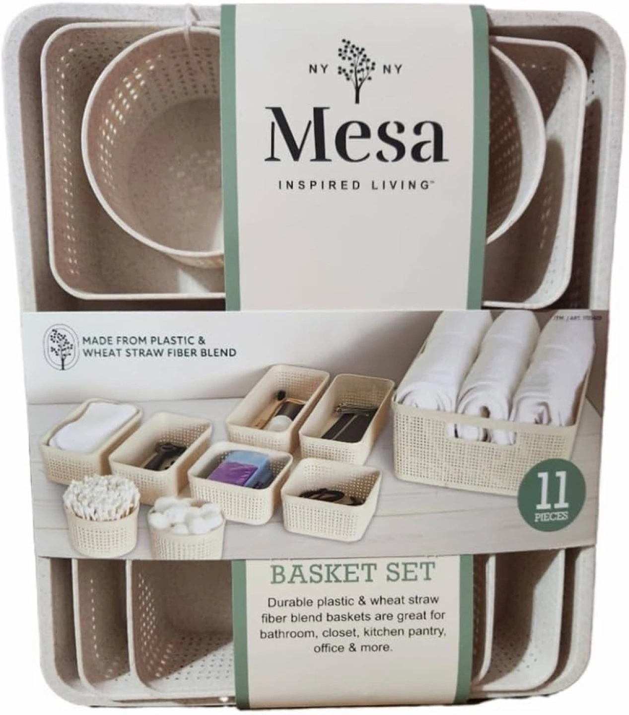 Eleven-piece beige storage basket set. Durable plastic and wheat straw fiber blend. Great for bathroom, closet, kitchen pantry, office, and more. I bought them for my nursery but won’t have space to use it $55 before taxes and delivery Smoke, pet, children free home Cash only. Pick up: Tyndall Avenue and Thorburn Avenue All sells are final