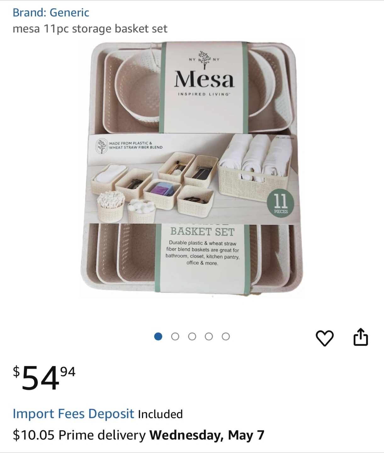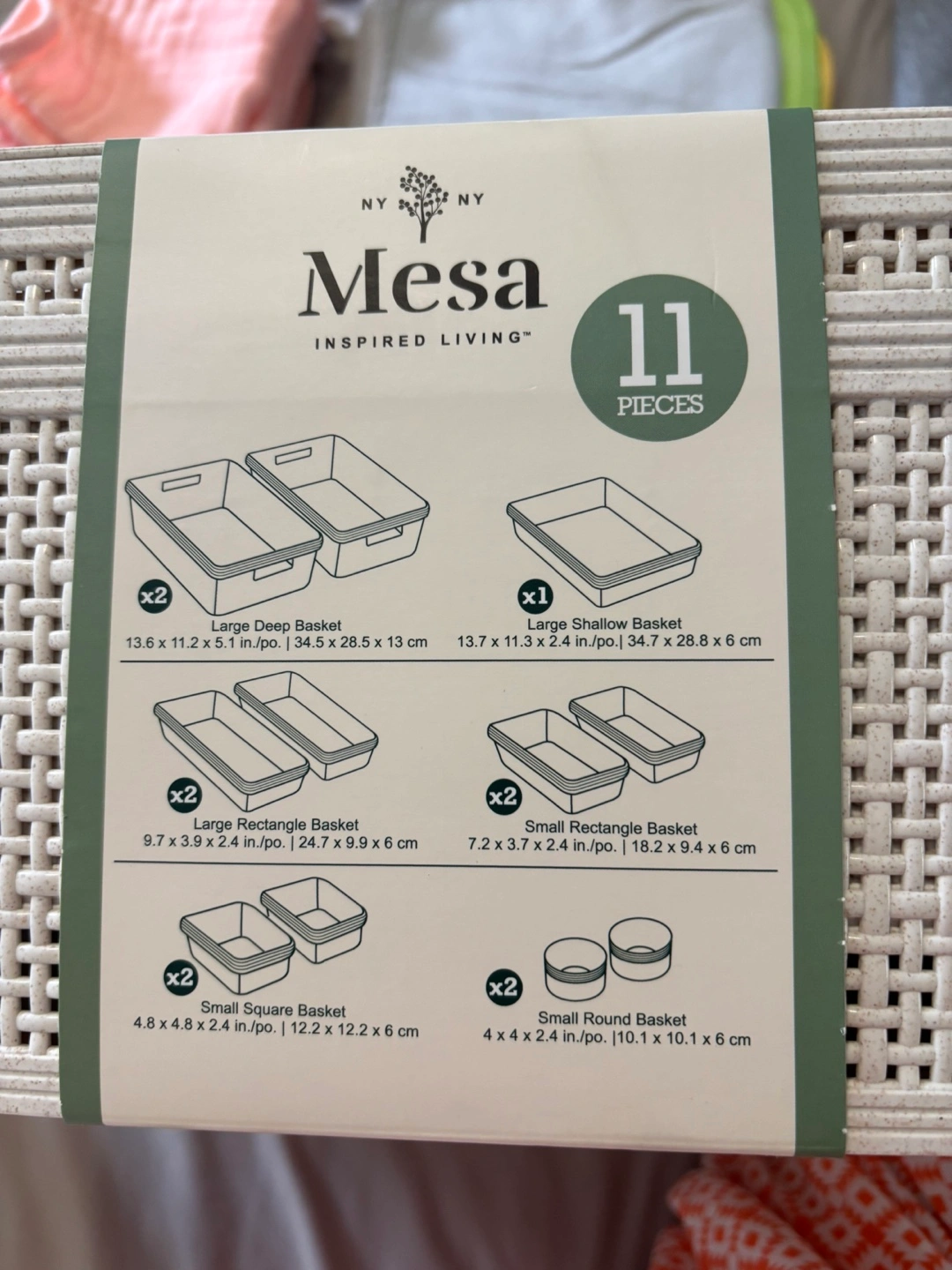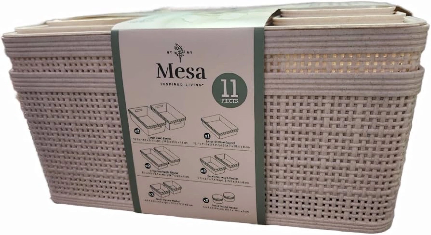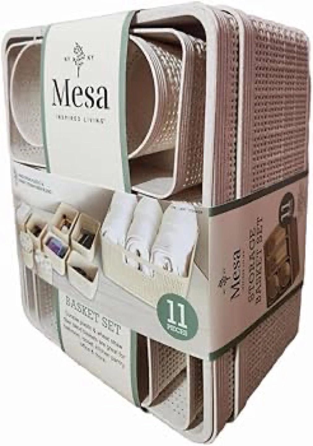 Eleven-piece beige storage basket set. Durable plastic and wheat straw fiber blend. Great for bathroom, closet, kitchen pantry, office, and more. I bought them for my nursery but won’t have space to use it $55 before taxes and delivery Smoke, pet, children free home Cash only. Pick up: Tyndall Avenue and Thorburn Avenue All sells are final