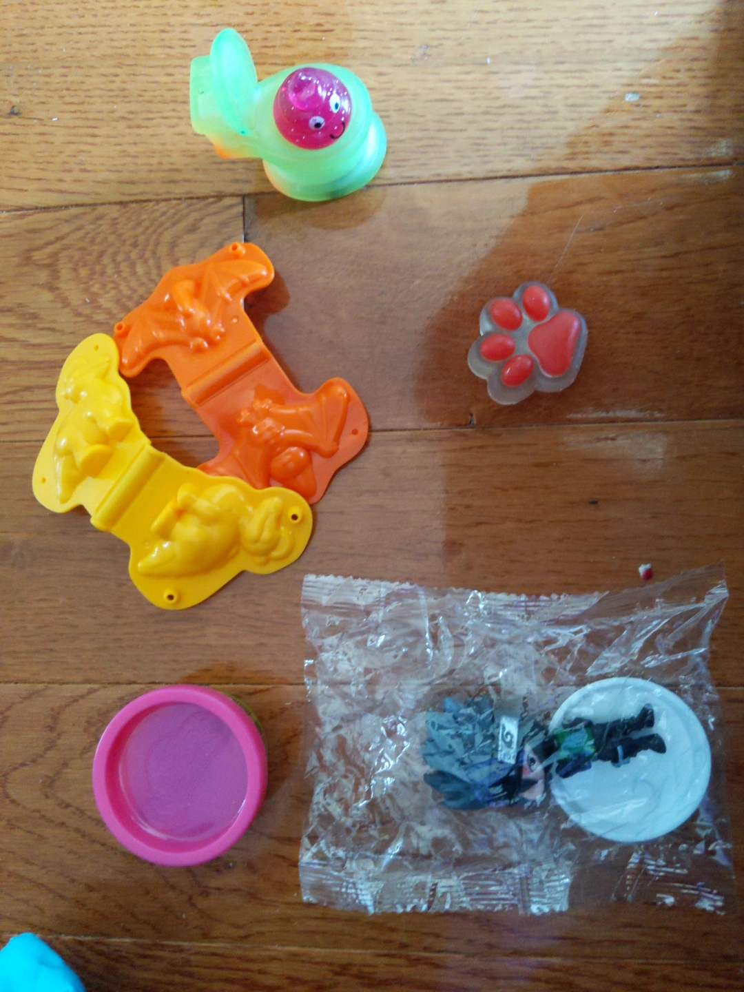 Play-Doh set includes two animal-shaped cookie cutters, a container of Play-Doh, a small figurine in a plastic bag, and a small, translucent figurine in a toilet.plus a squishy. each is 1.20$ all 5$ cash only porch pick up,no delivery,no shipping.