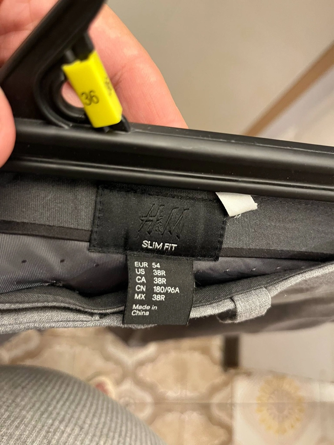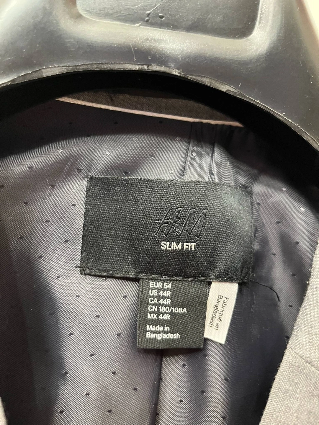 Grey suit, slim fit. Jacket and pants included. Size 54R EUR / 44R CA. Made in Bangladesh and China.