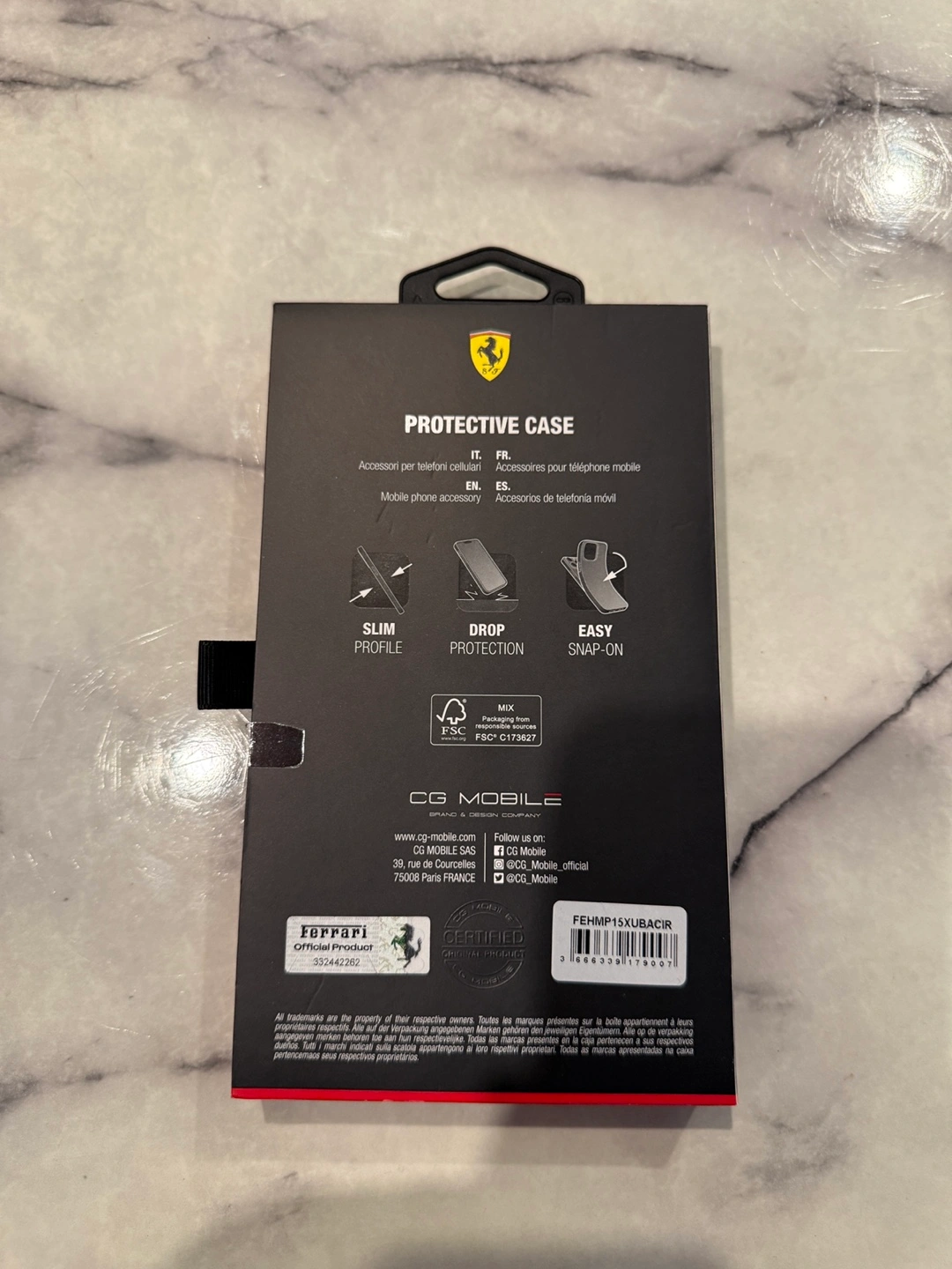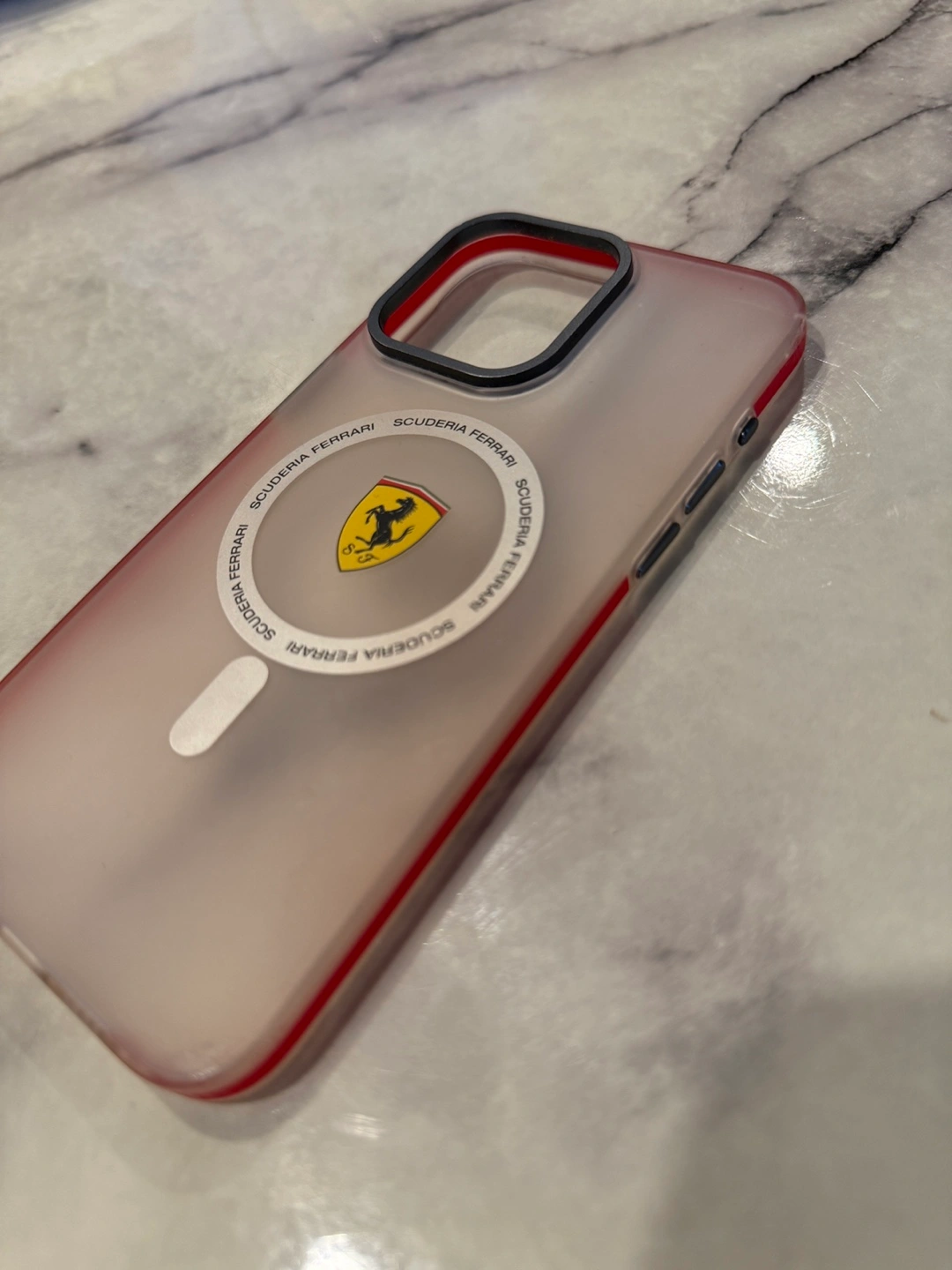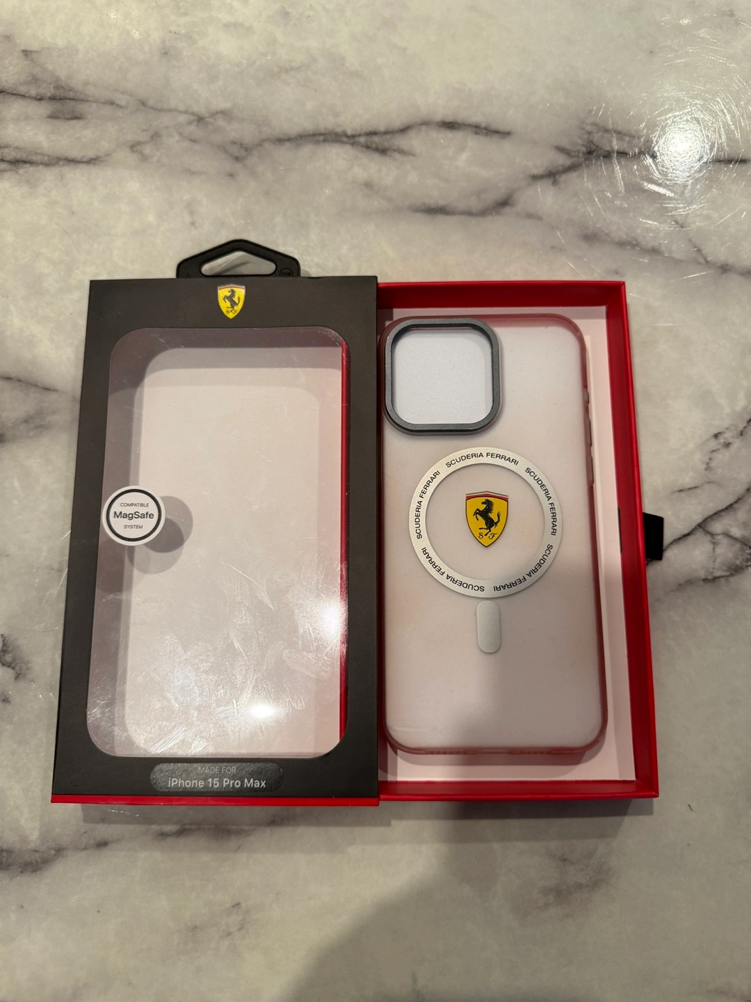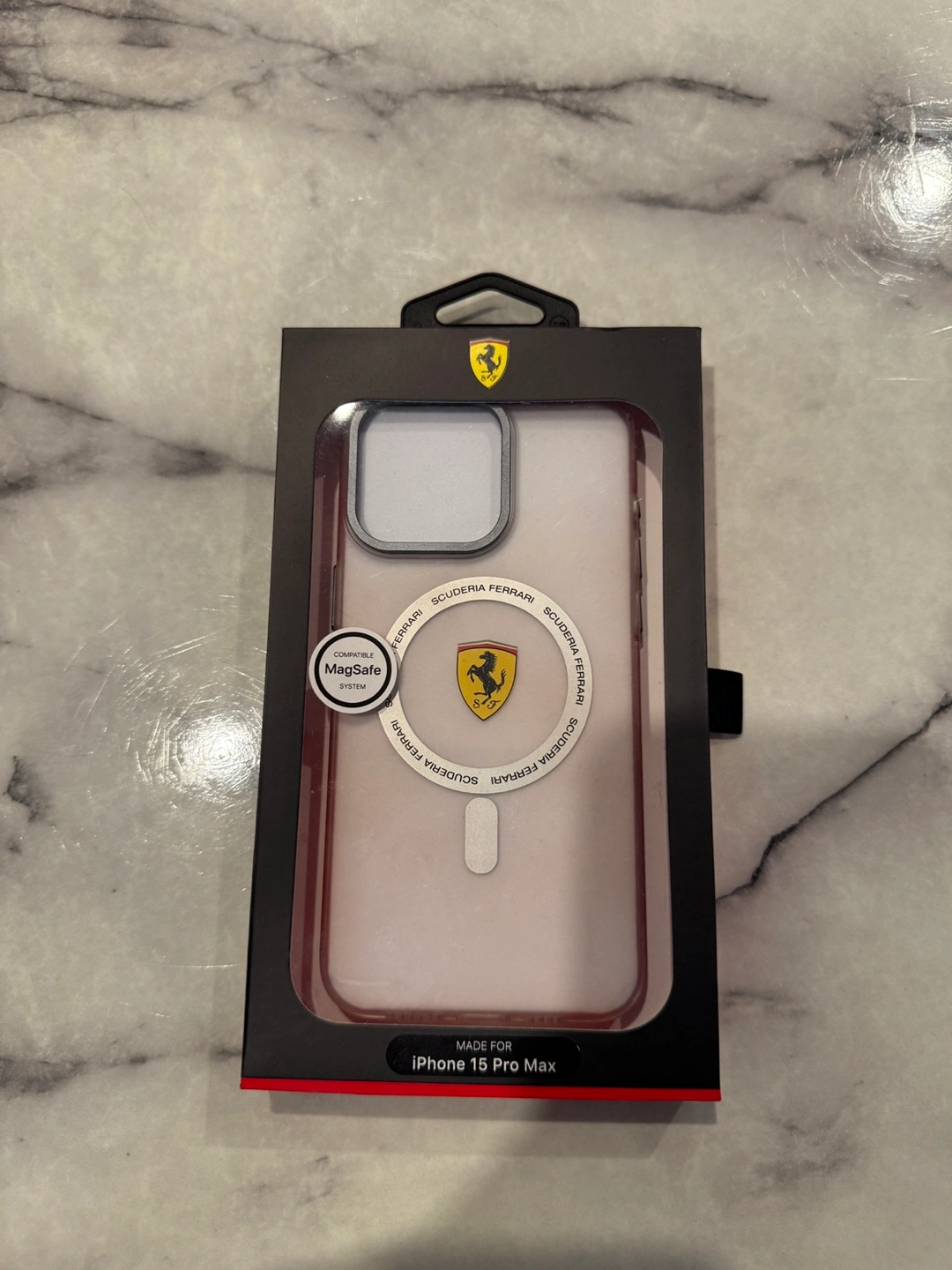 Brand new, in box. Protective case. Slim profile. MagSafe compatible. Features Scuderia Ferrari branding. For iPhone 15 Pro Max.