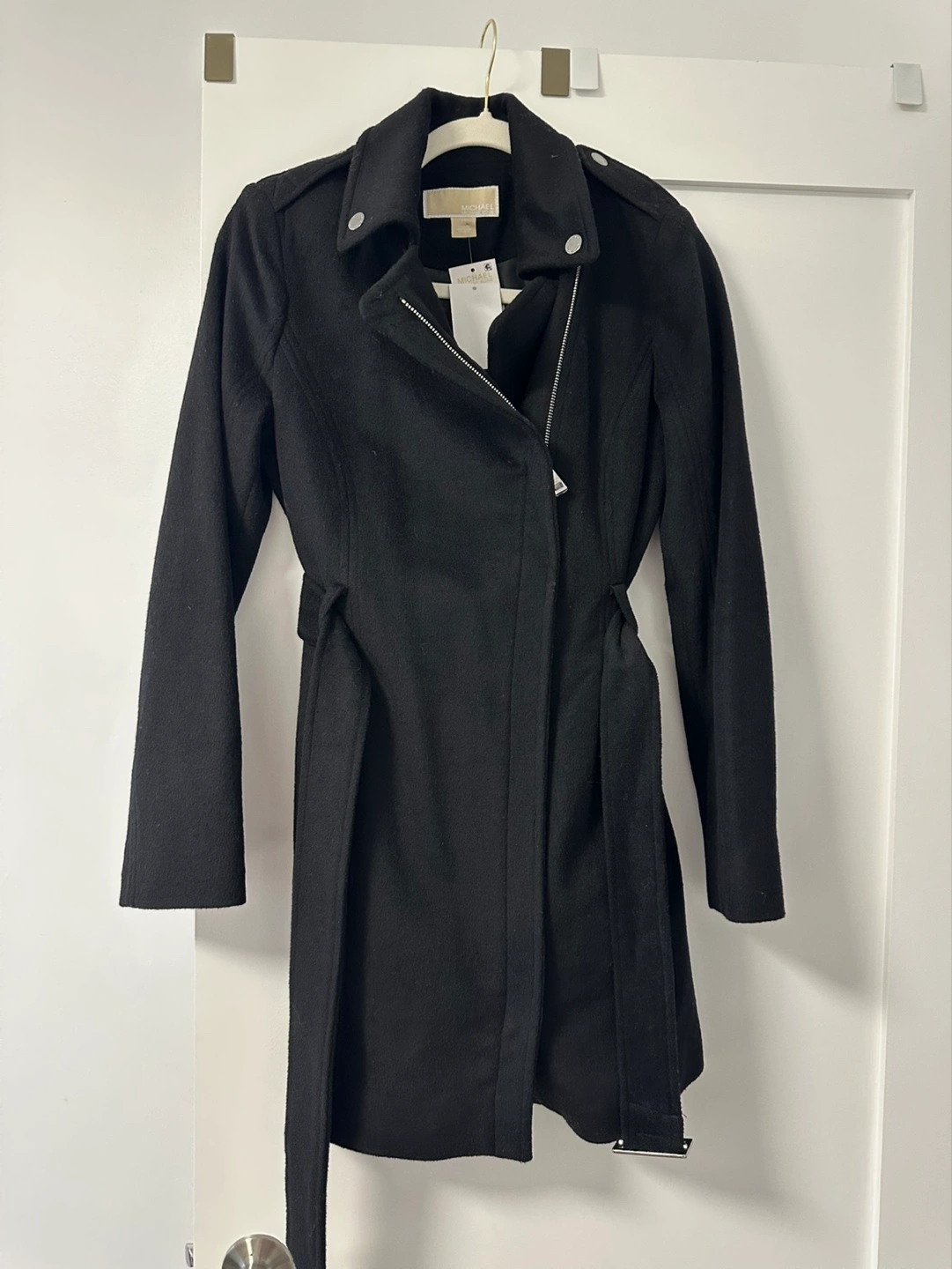 Black wool blend coat. Asymmetrical zipper closure. Belted waist. Brand New with tags on. Hardware still has plastic on. Bought it 2 yeara ago from the outlets but never got the chance to wear it.
