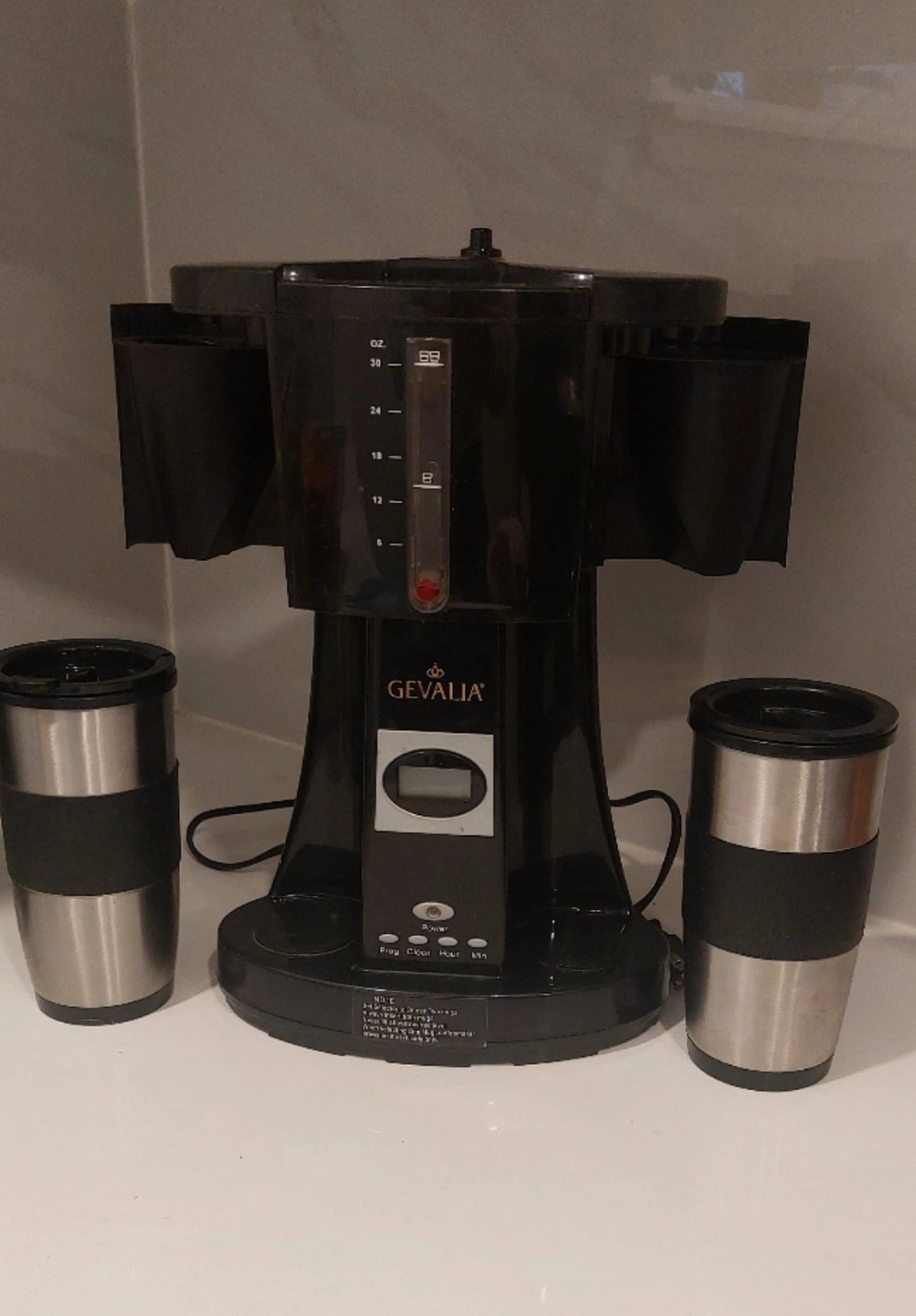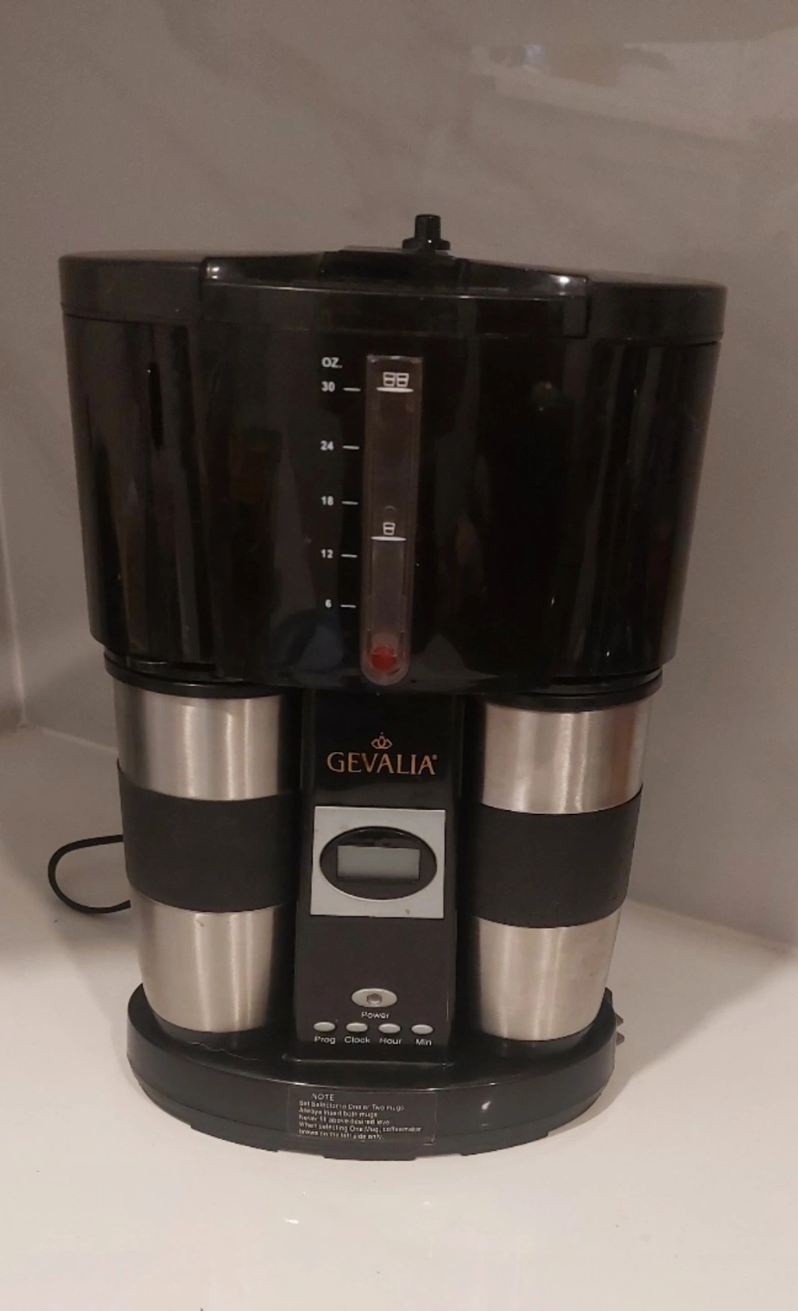 Black coffee maker. Makes two cups simultaneously. Includes two stainless steel travel mugs. Programmable timer. Used condition. It comes with one filter!