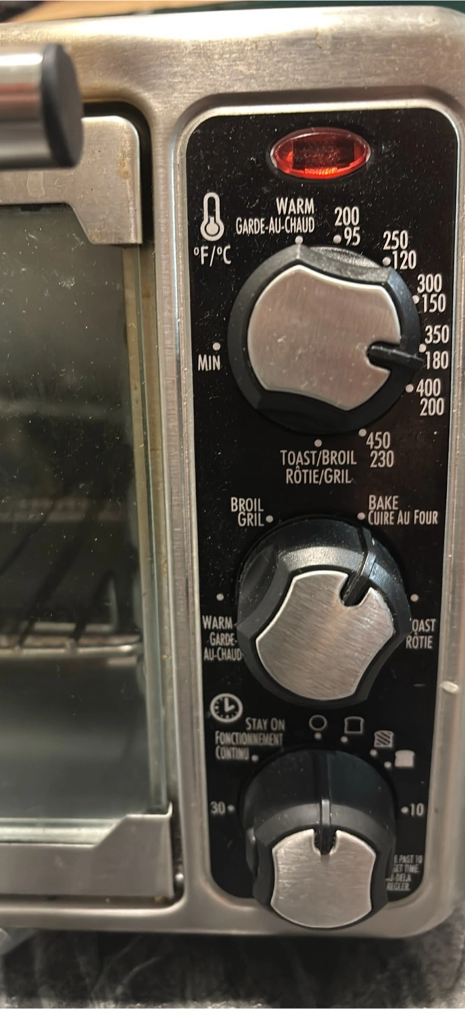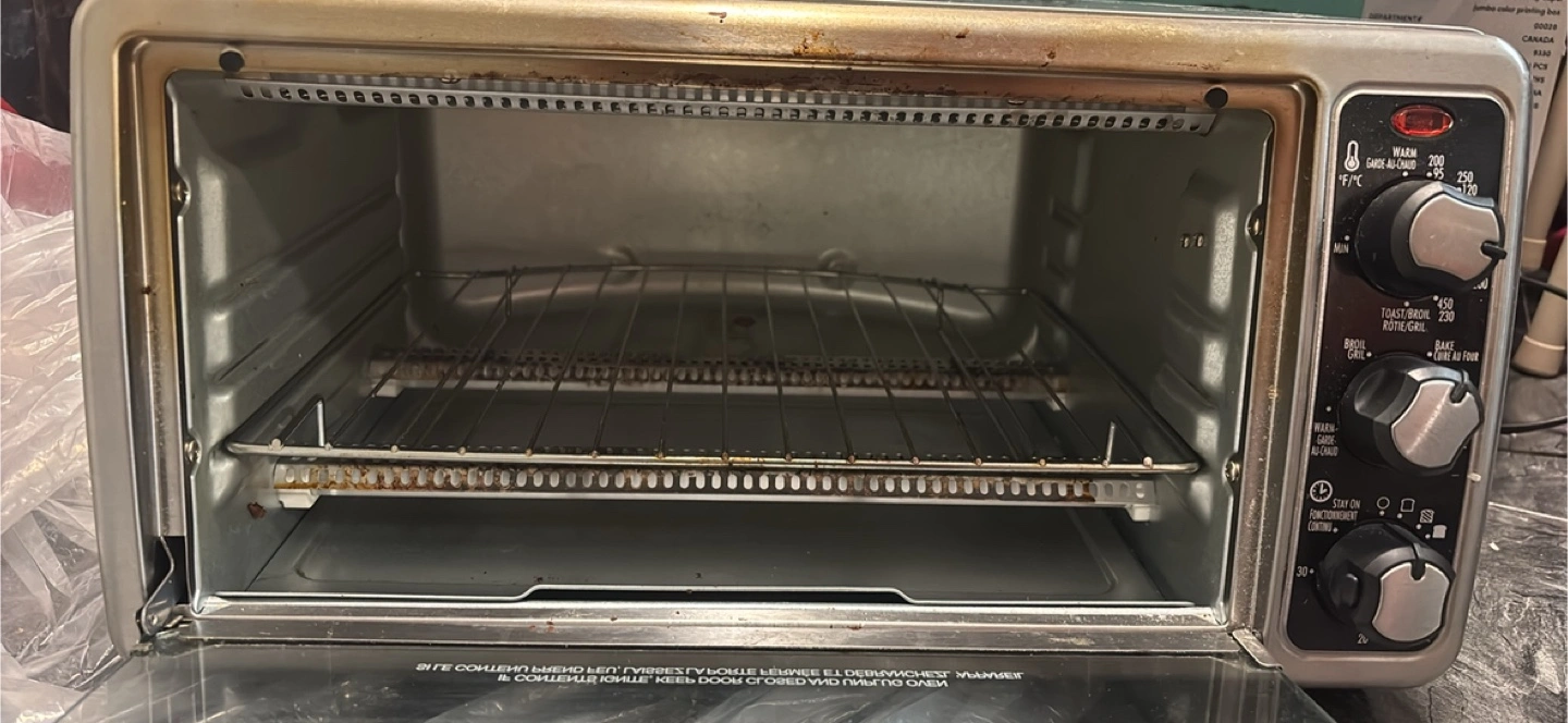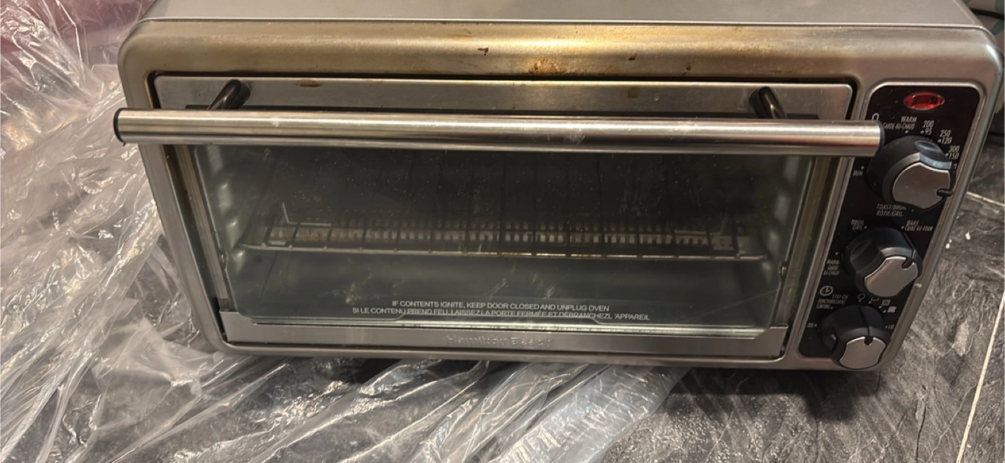 Stainless steel toaster oven. Features bake, broil, toast, and warm settings. Includes a baking rack. Shows some minor signs of use.