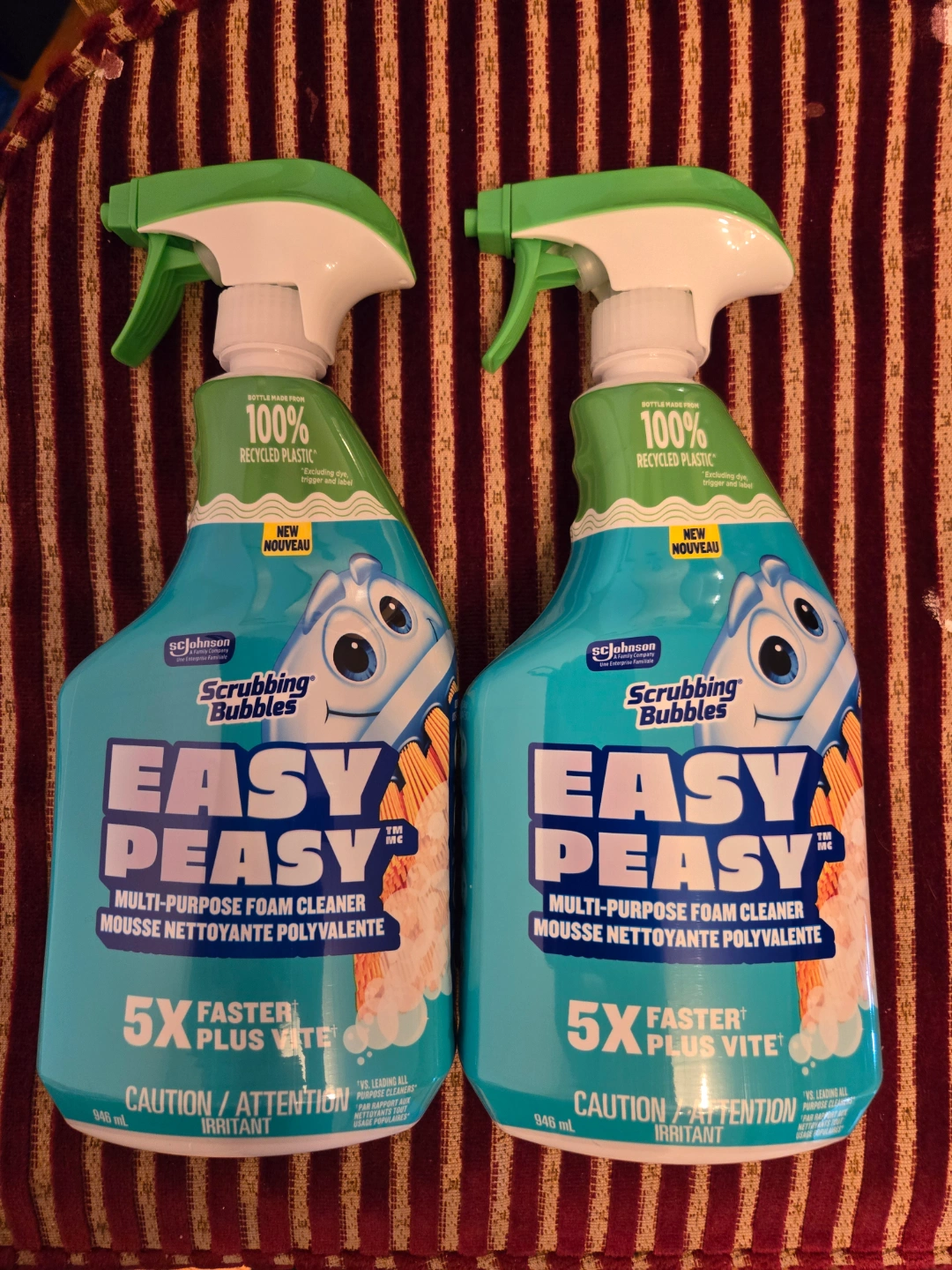 Two bottles of Scrubbing Bubbles Easy Peasy multi-purpose foam cleaner. 946 ml each. Bottle made from 100% recycled plastic.