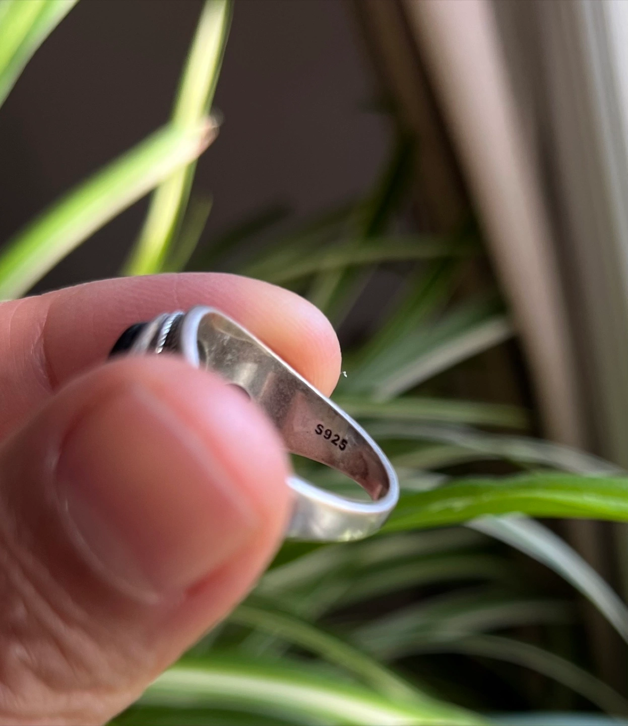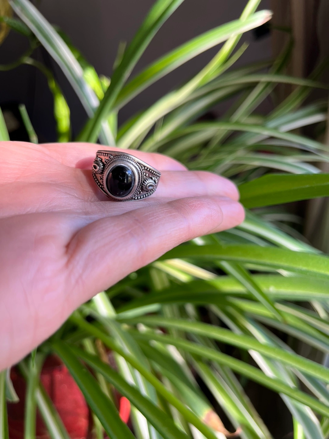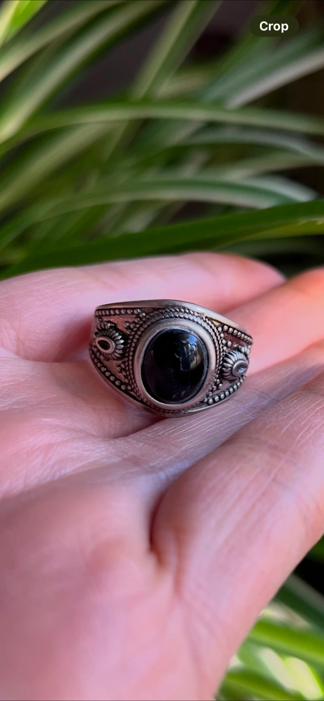 Silver ring features a black oval natural gemstone. Intricate detailing around the stone. Looks great on! Size 9