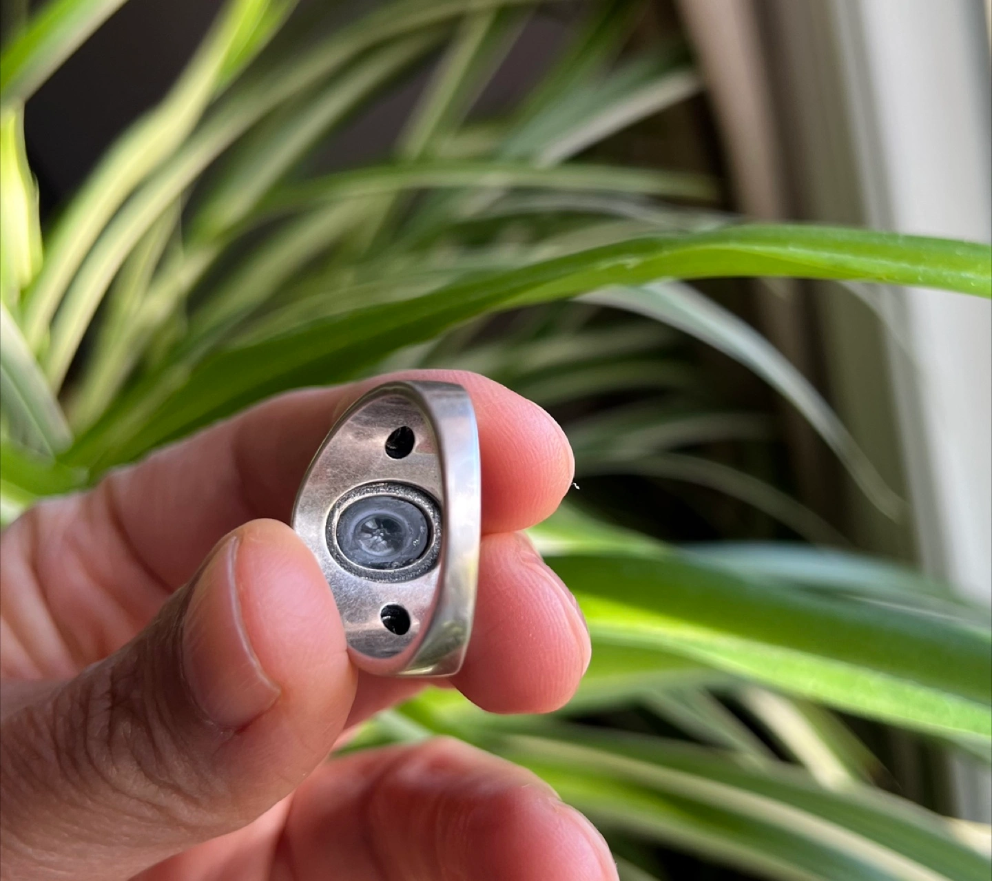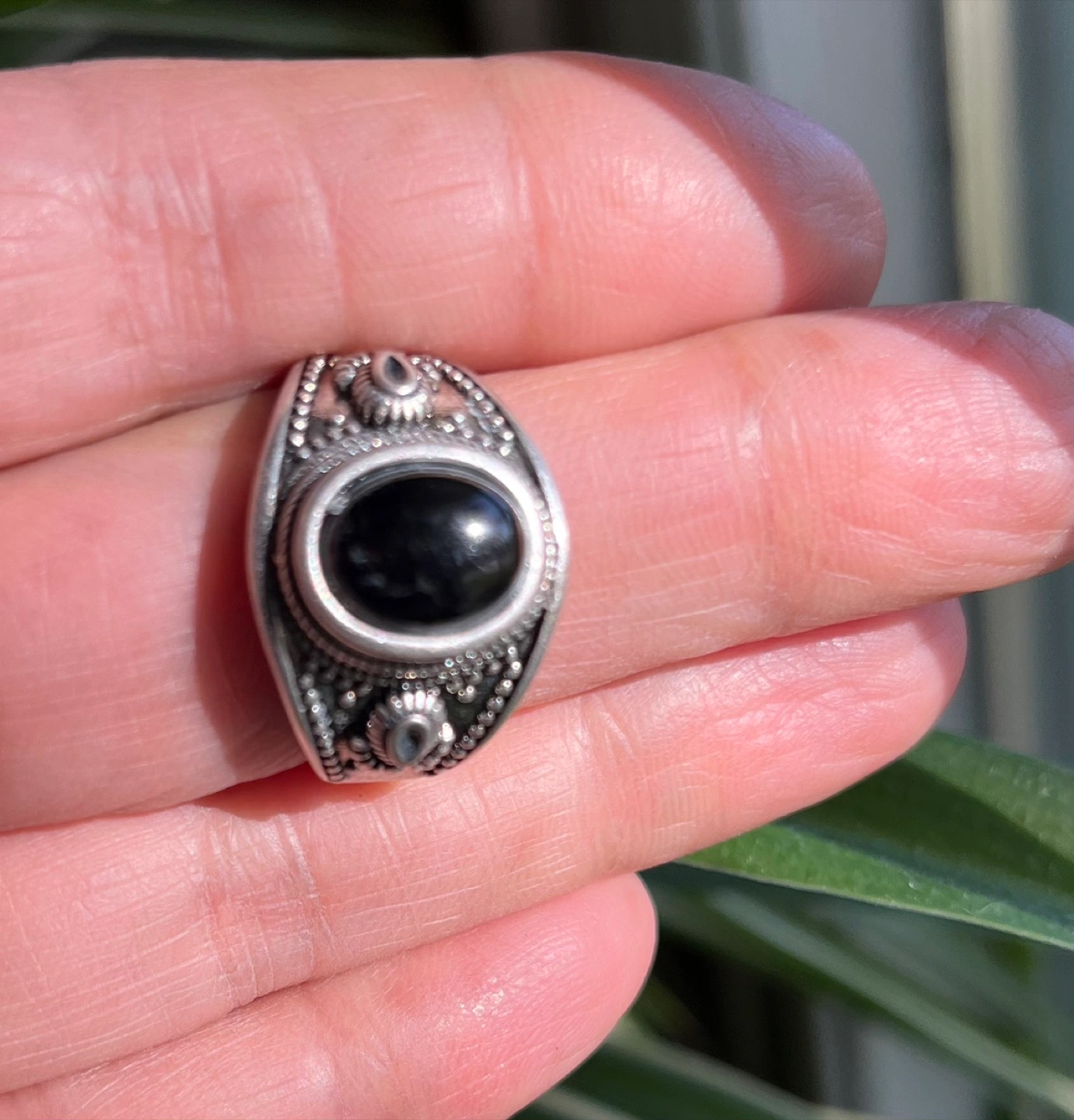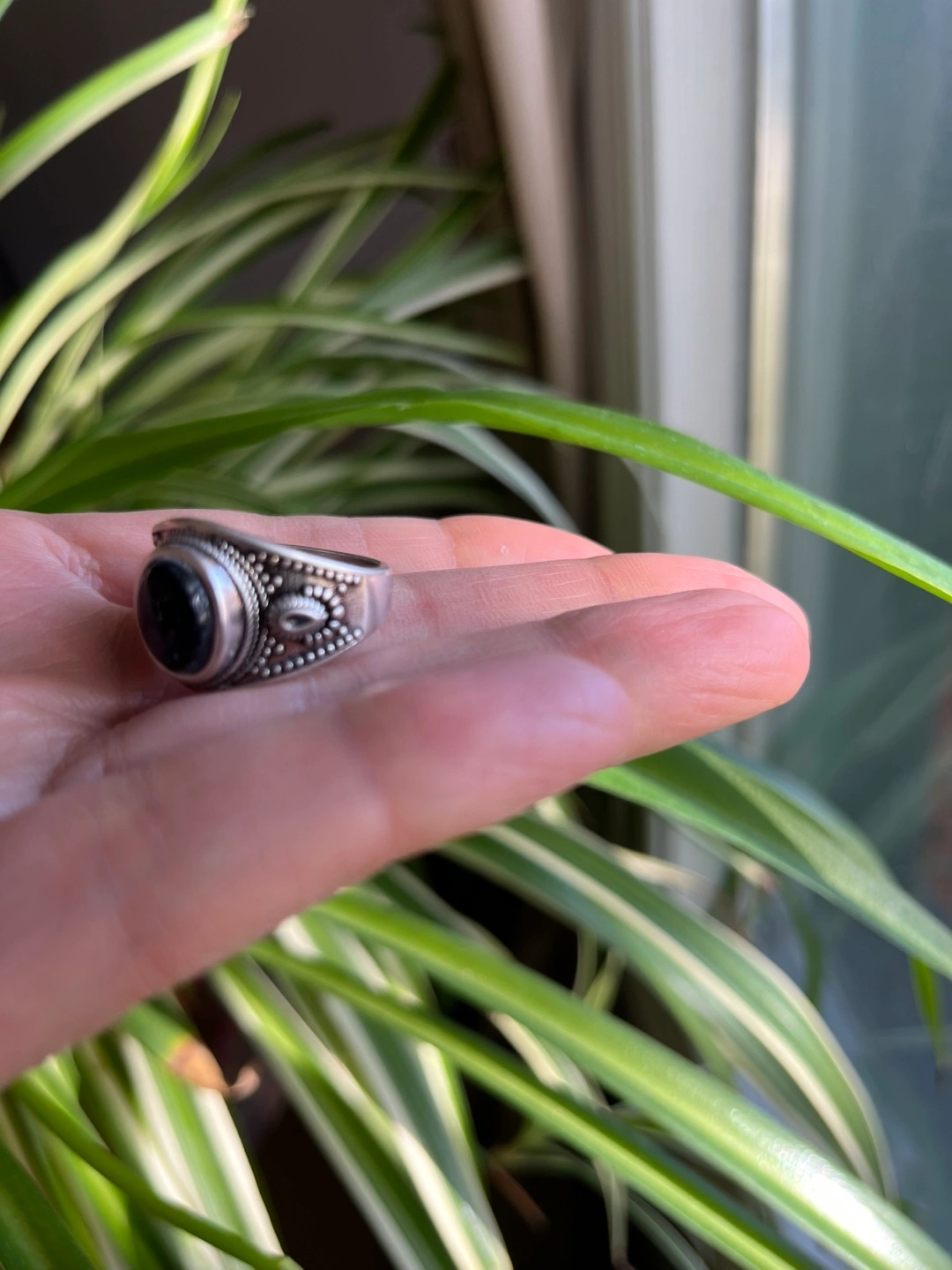 Silver ring features a black oval natural gemstone. Intricate detailing around the stone. Looks great on! Size 9