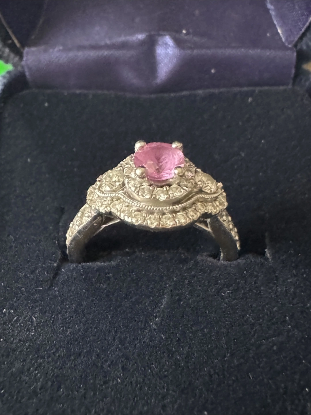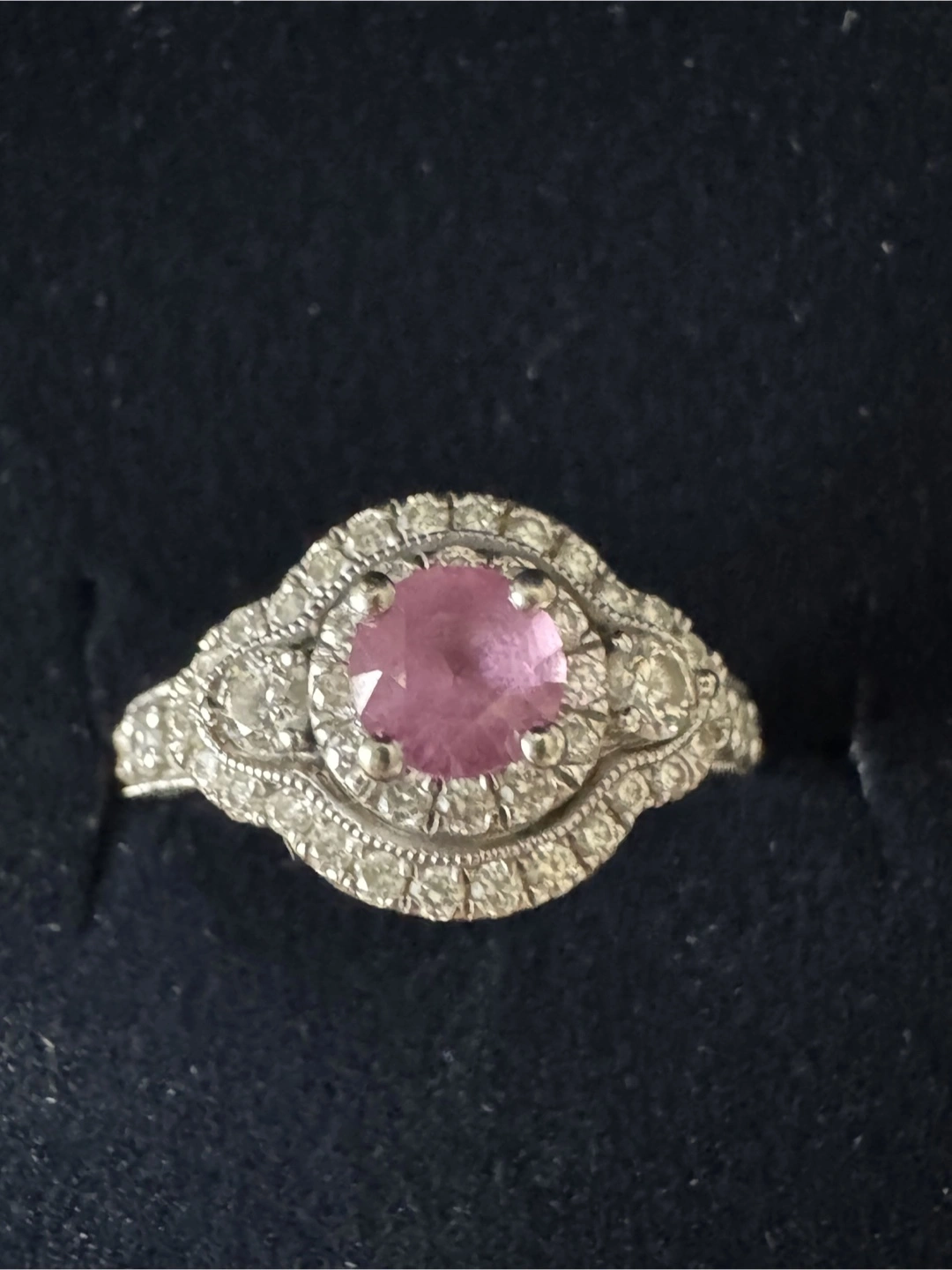 Exquisite Custom-Made One Carat Pink Sapphire with Diamond Chips Center Stone: 1-carat natural pink sapphire Accent Stones: Dazzling diamond chips, totaling approximately 0.25 carats Metal: Premium 14k white gold, polished to perfection Design: Unique, custom-crafted band for a one-of-a-kind look Asking $2,000