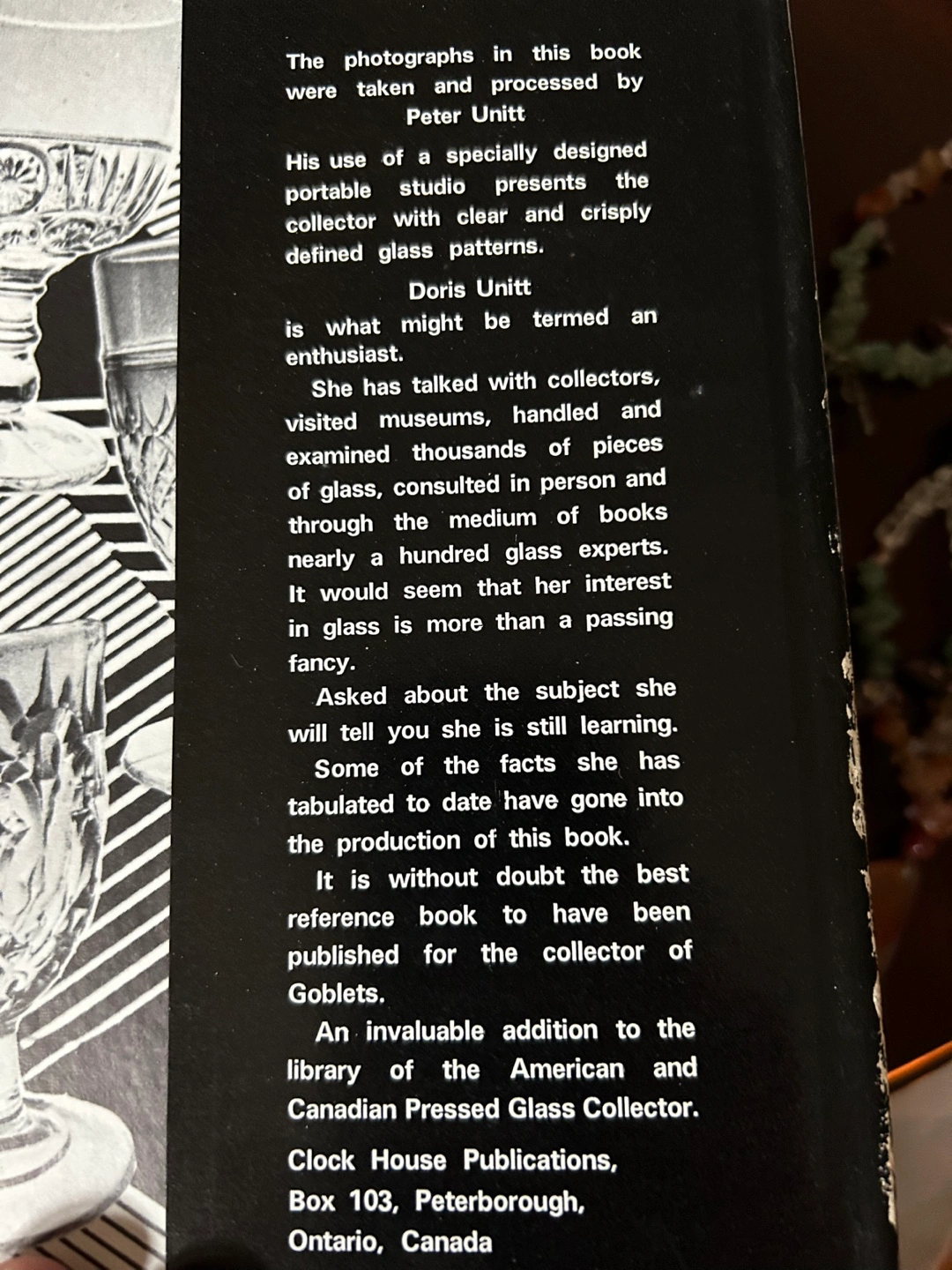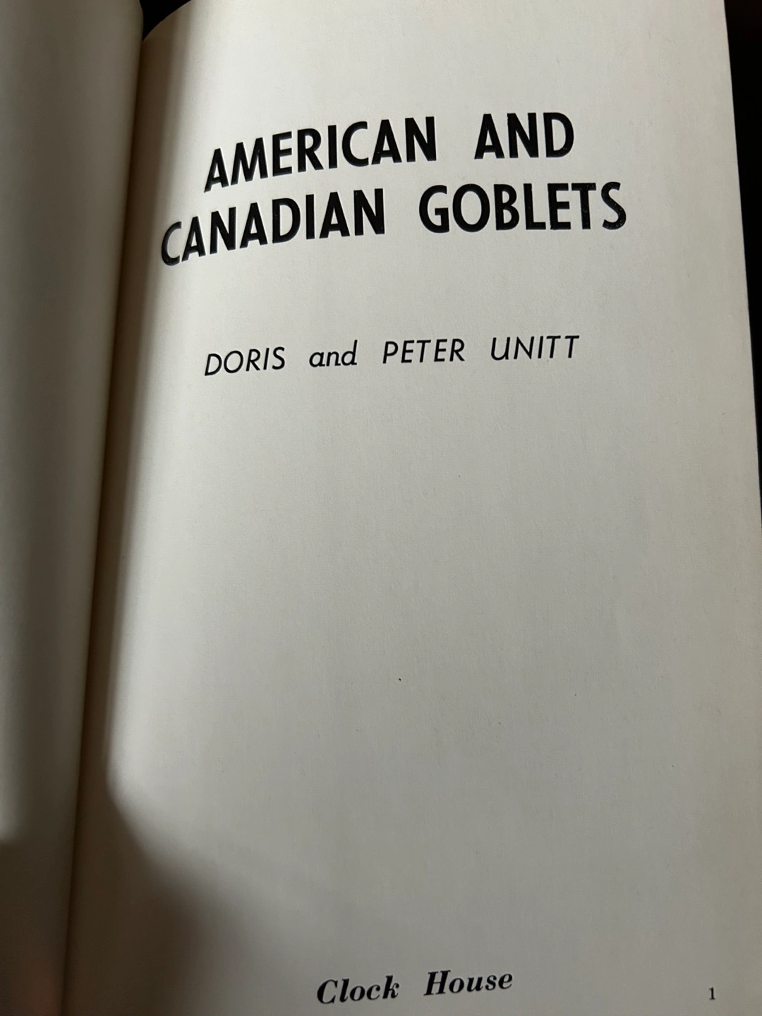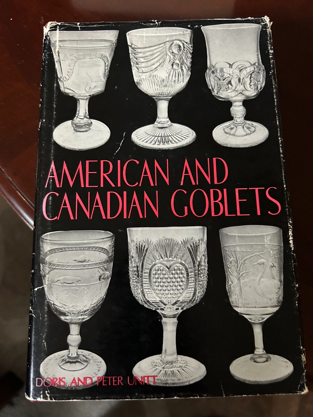 Book American and Canadian Goblets HC vintage reference price guide collectible antiques 1970 4.00 American and Canadian Goblets Book by Doris Unitt and Peter Unitt Flexible re pickup Elmsdale Road M4J 3M3 Donlands O'Connor East York Don Mills south exit off DVP American and Canadian Goblets Book by Doris Unitt and Peter Unitt For over 30 years "American and Canadian Goblets" by Doris and Peter Unitt has been considered the best reference book ever written about Antique Pressed Glass Goblets. This book shows over 1,000 clear, sharp photographs of different patterns of antique pressed glass goblets Hard cover in excellent condition Profusely illustrated