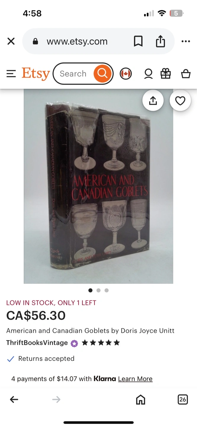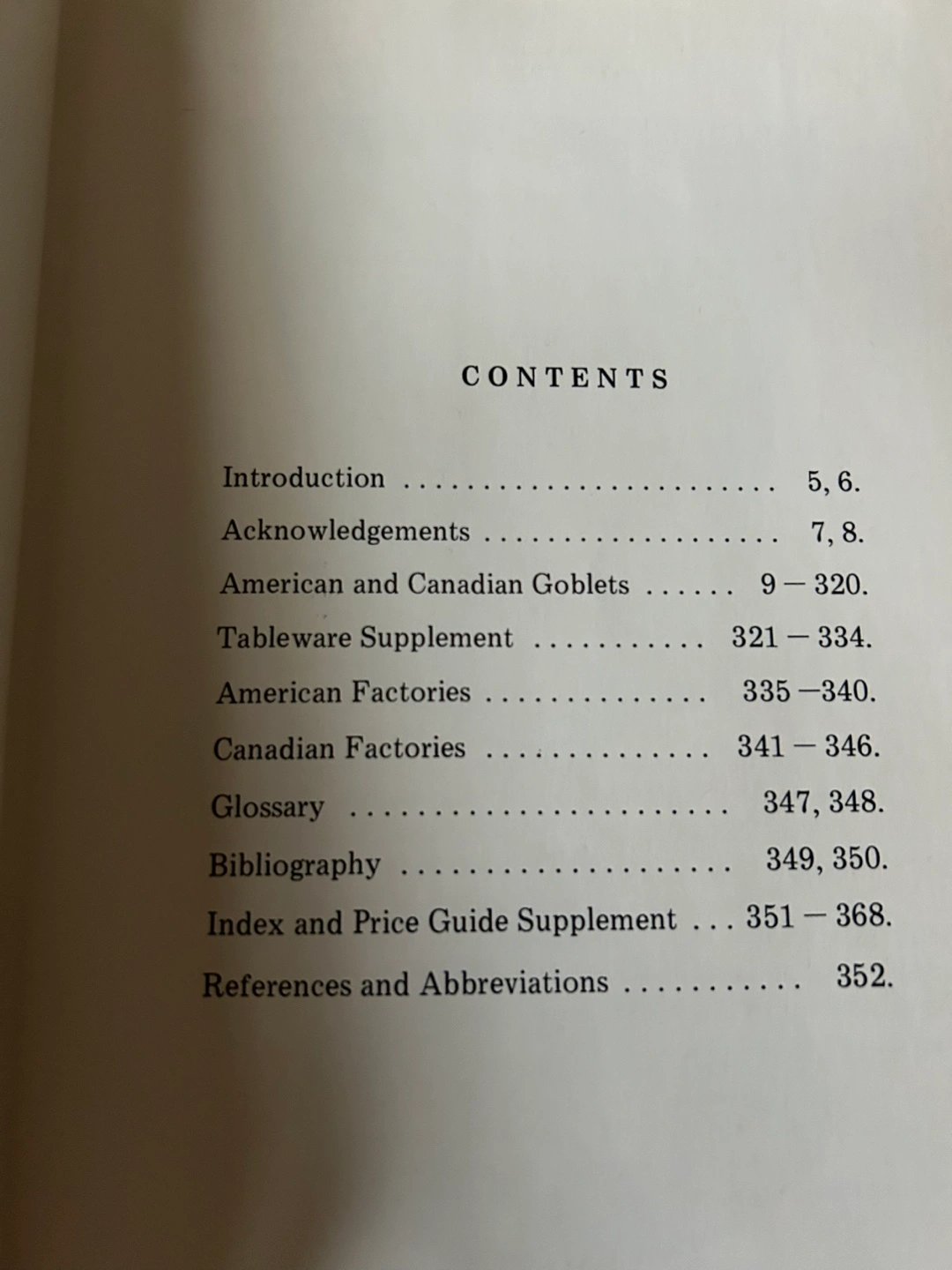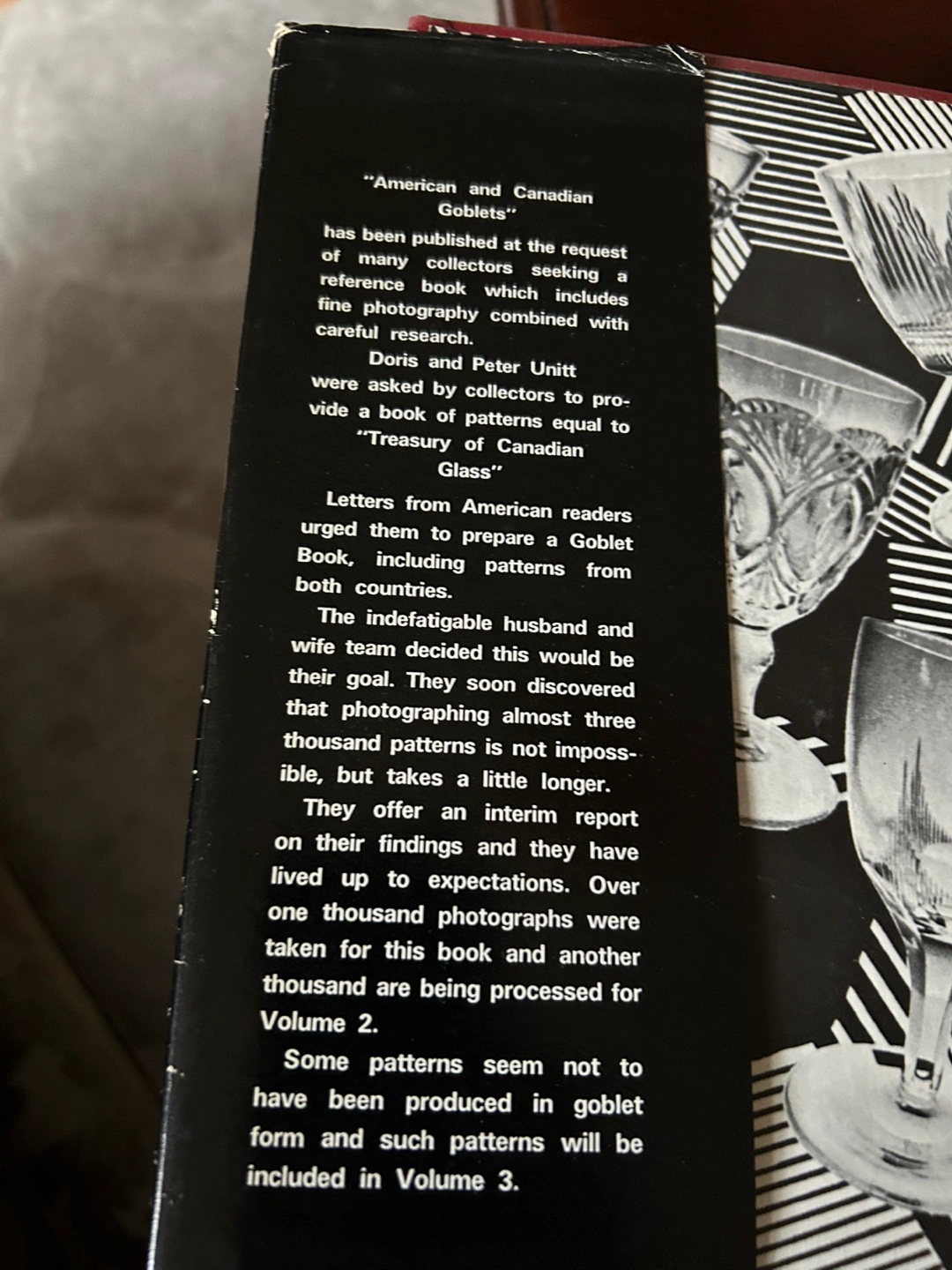 Book American and Canadian Goblets HC vintage reference price guide collectible antiques 1970 4.00 American and Canadian Goblets Book by Doris Unitt and Peter Unitt Flexible re pickup Elmsdale Road M4J 3M3 Donlands O'Connor East York Don Mills south exit off DVP American and Canadian Goblets Book by Doris Unitt and Peter Unitt For over 30 years "American and Canadian Goblets" by Doris and Peter Unitt has been considered the best reference book ever written about Antique Pressed Glass Goblets. This book shows over 1,000 clear, sharp photographs of different patterns of antique pressed glass goblets Hard cover in excellent condition Profusely illustrated