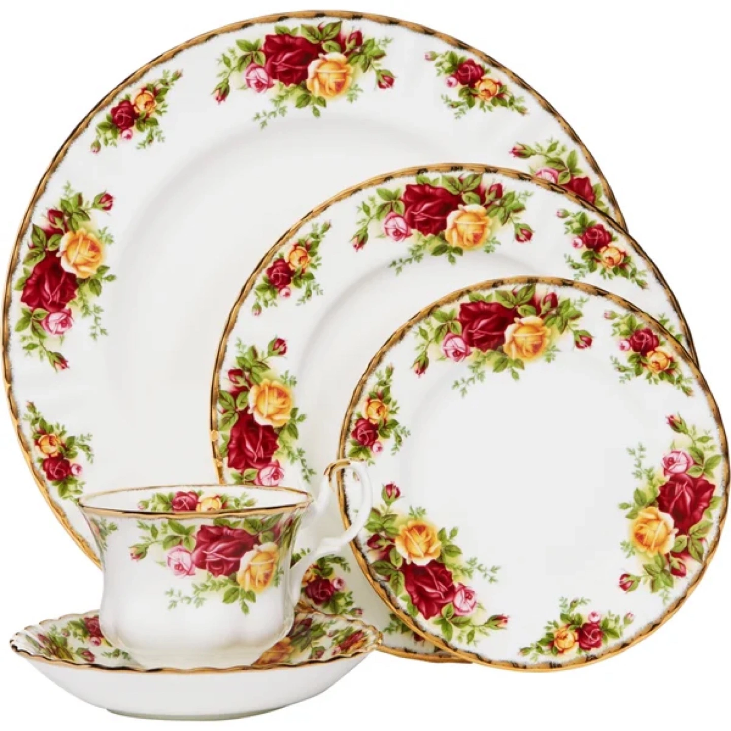 New in box. Twenty-piece fine porcelain dinnerware set. Features Old Country Roses pattern. Includes dinner plates, salad plates, teacups, and saucers.