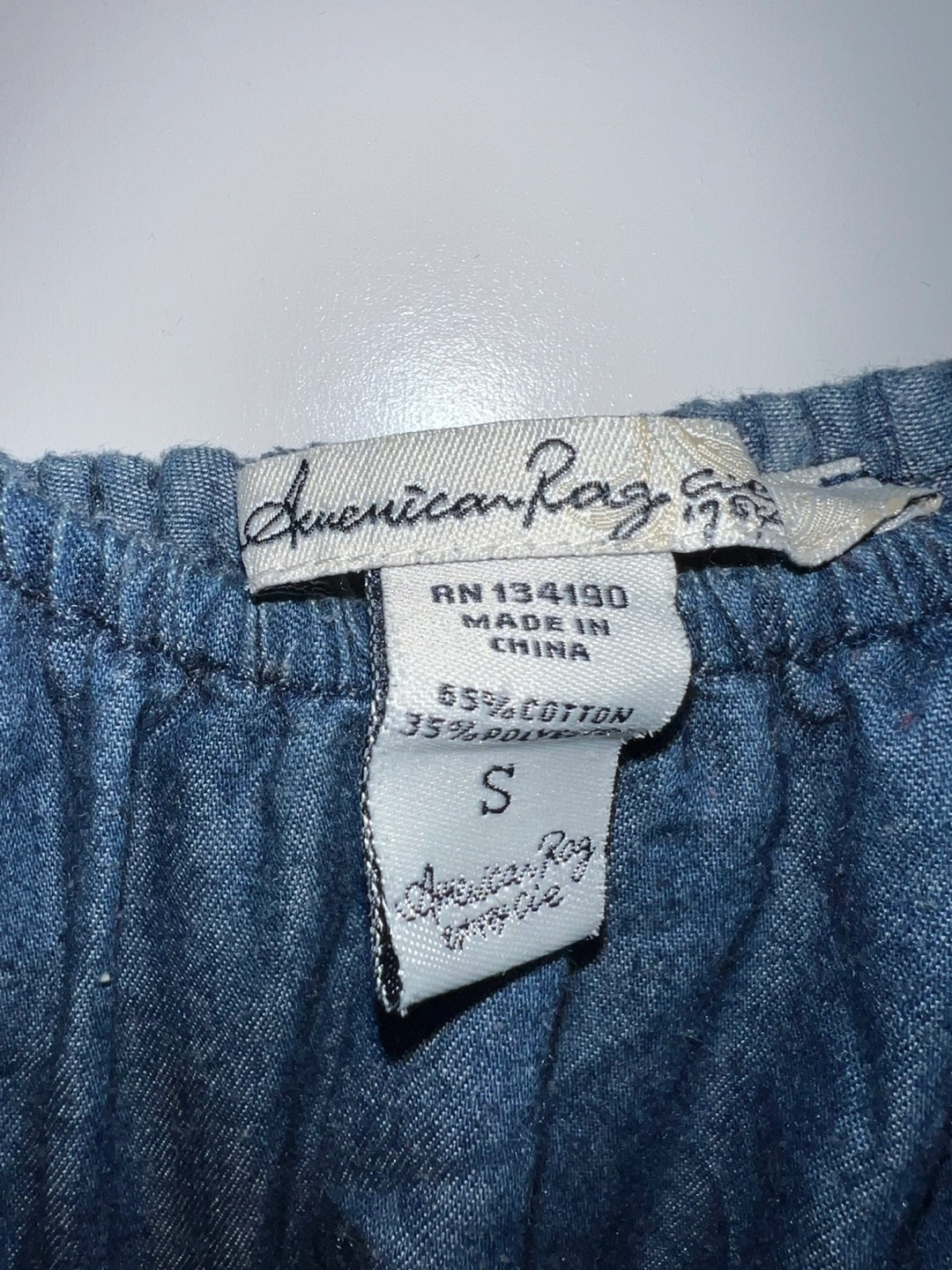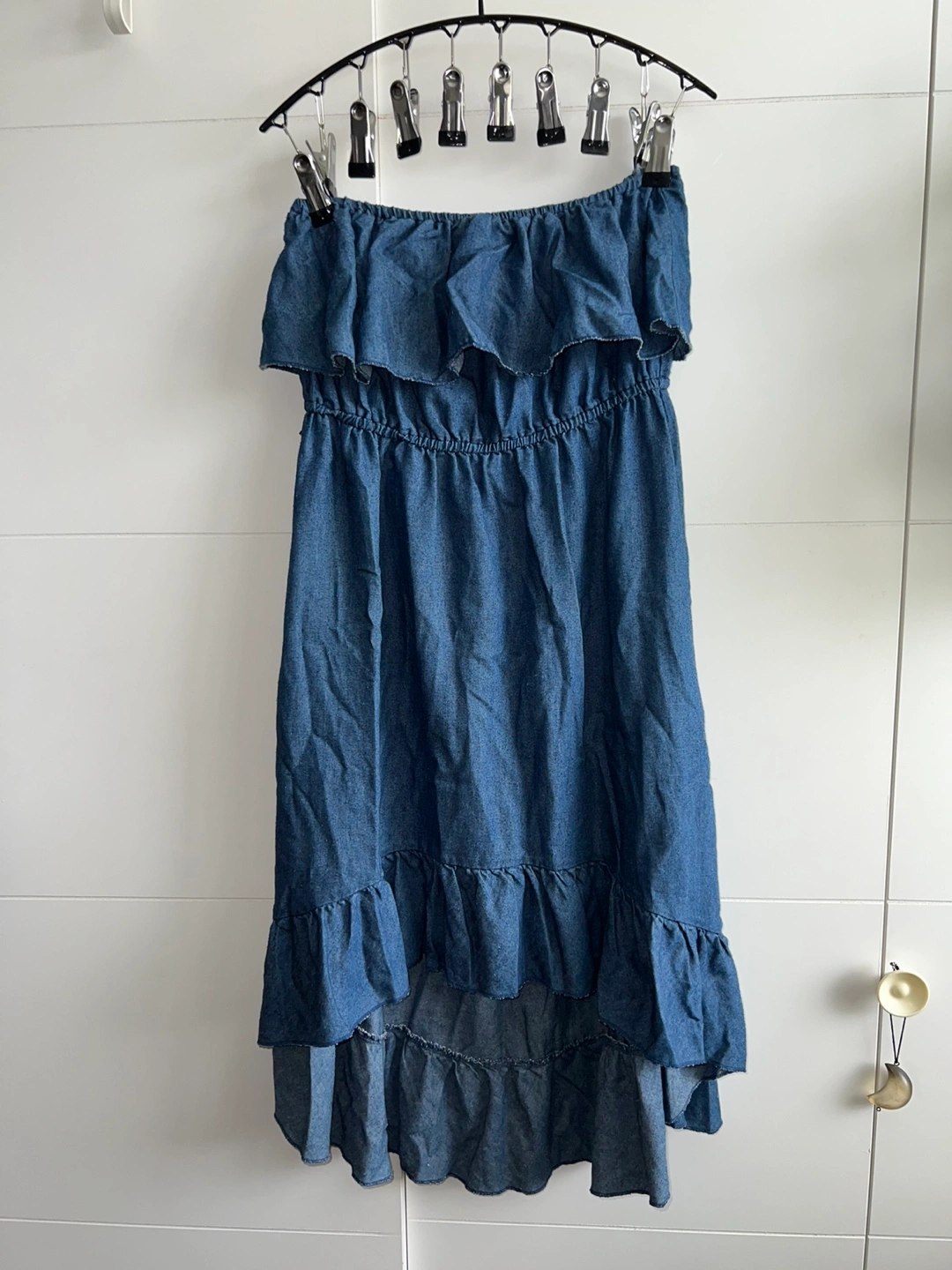 Cute denim dress. Strapless with ruffles. High-low hemline. Size small.