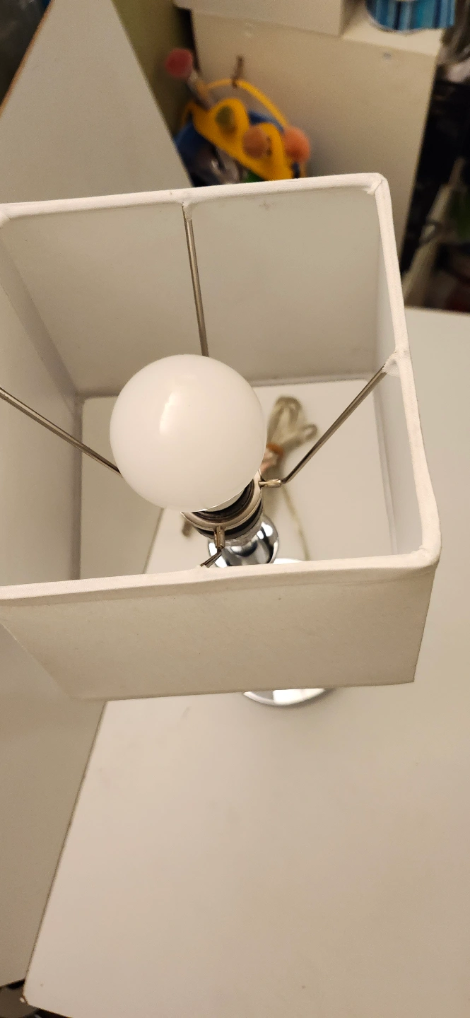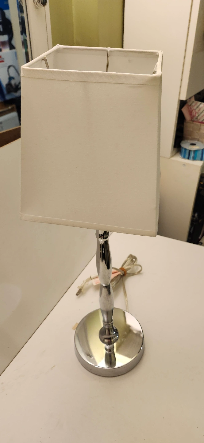 Excellent working condition. Small chrome table lamp. Features a square off-white shade. Simple design, ideal for a bedside table. Electrical cord included. price only cash only pickup no delivery. MEET UP ON 801 O'CONNOR DRIVE EAST YORK. OUTSIDE TD CANADA TRUST DOOR.