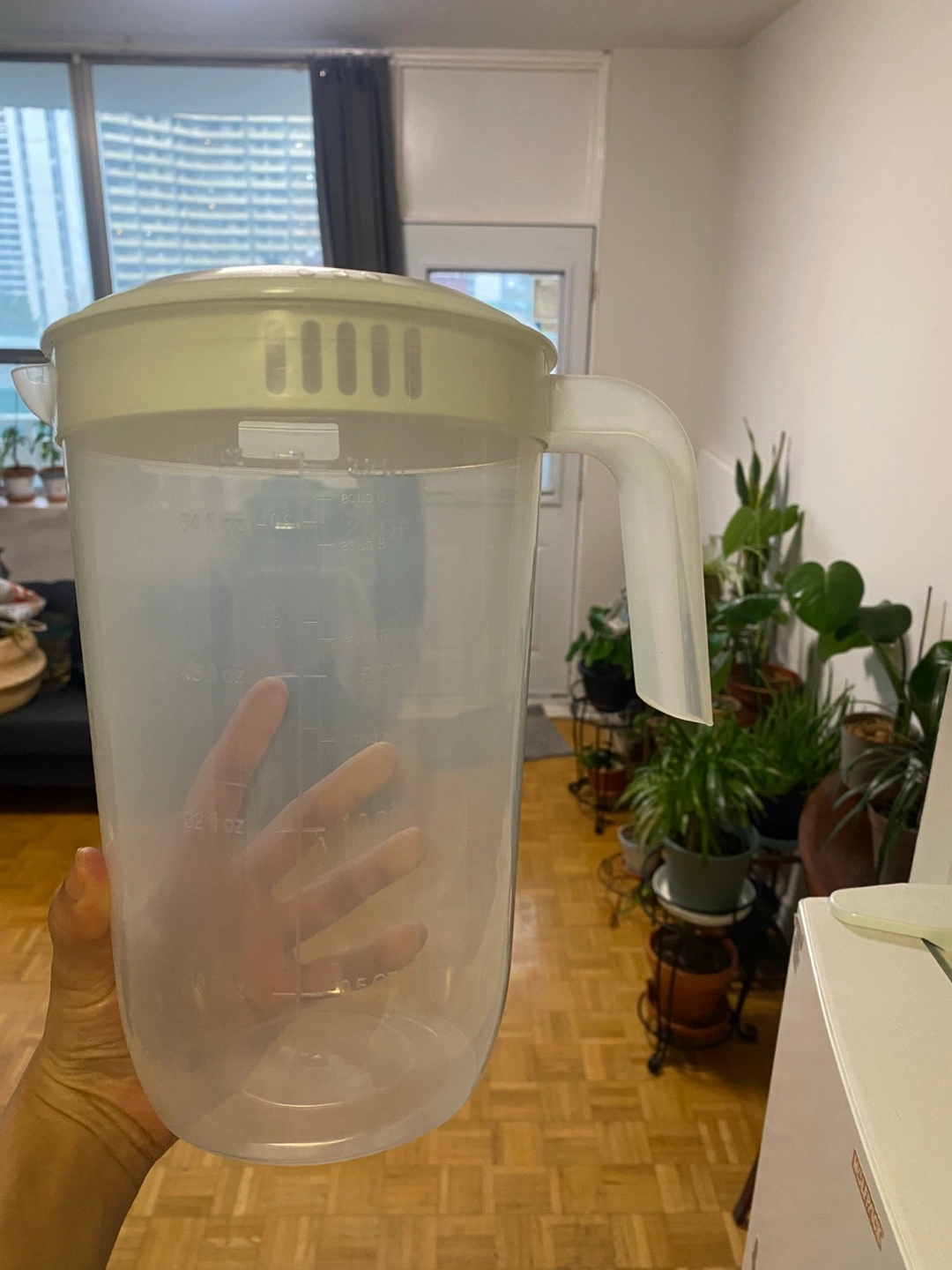 Clear plastic pitcher. Features a removable lid and measurement markings in ounces and liters. Good for water, juice, or other beverages.