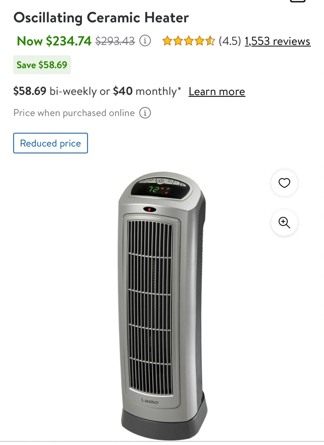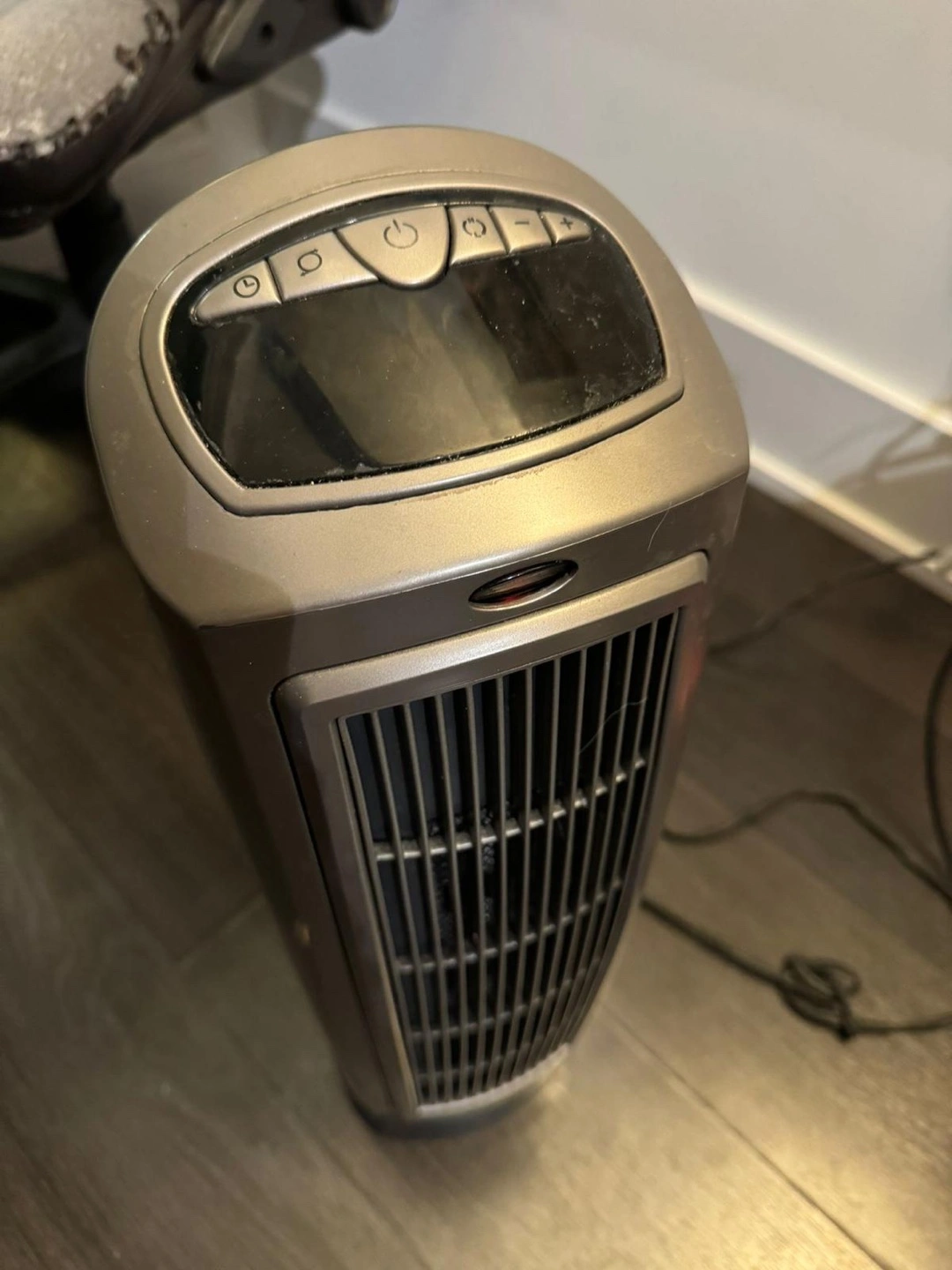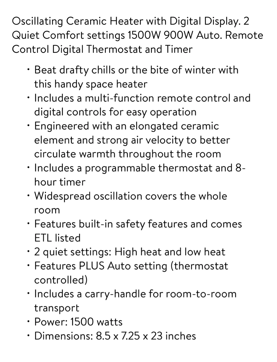 Used Lasko oscillating ceramic heater. Features digital thermostat and timer. Multiple heat settings. Good for small to medium rooms. Works great! Heats up the room really fast!