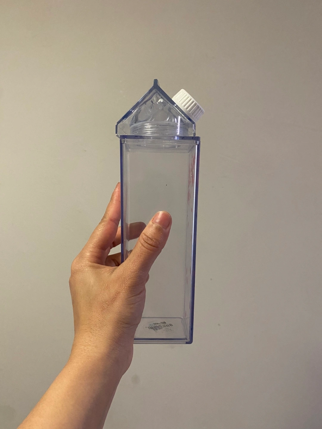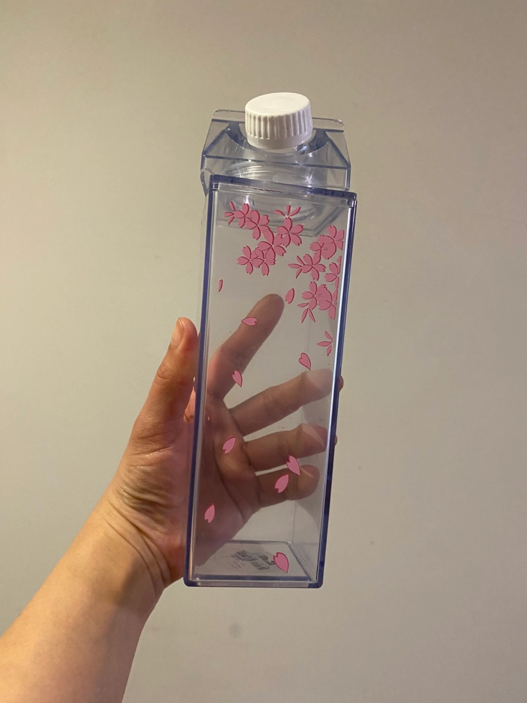 Reusable water bottle. Clear plastic. Shaped like a milk carton. Pink cherry blossom print. White screw-on cap.