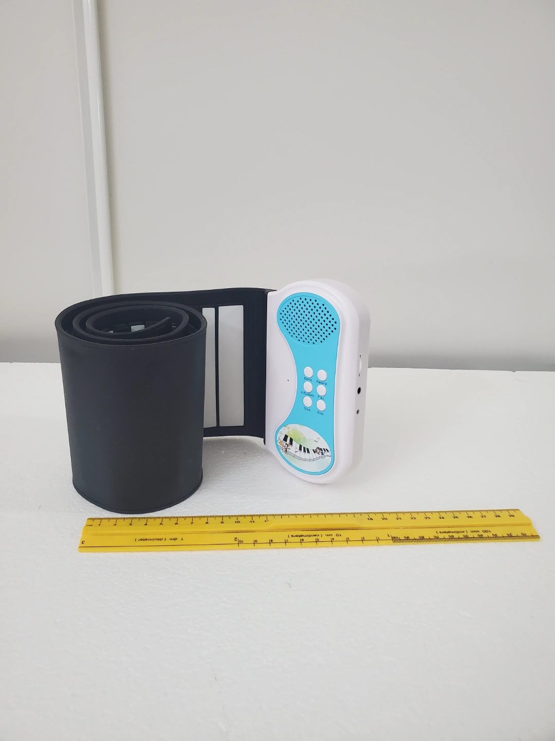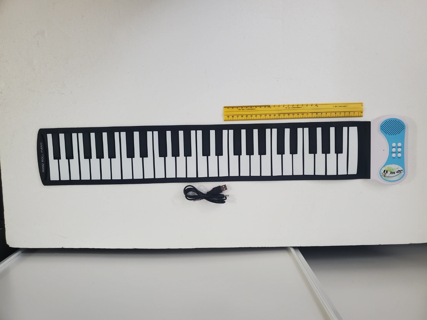 Portable roll-up piano keyboard. Includes a small speaker unit with controls. Features record, play, and tone functions. Volume control on side. Connects via USB or takes 4x AAA batteries. β 27 inches wide β Comes with manual β BUNDLE WITH OTHER ITEMS AND $AVE π₯