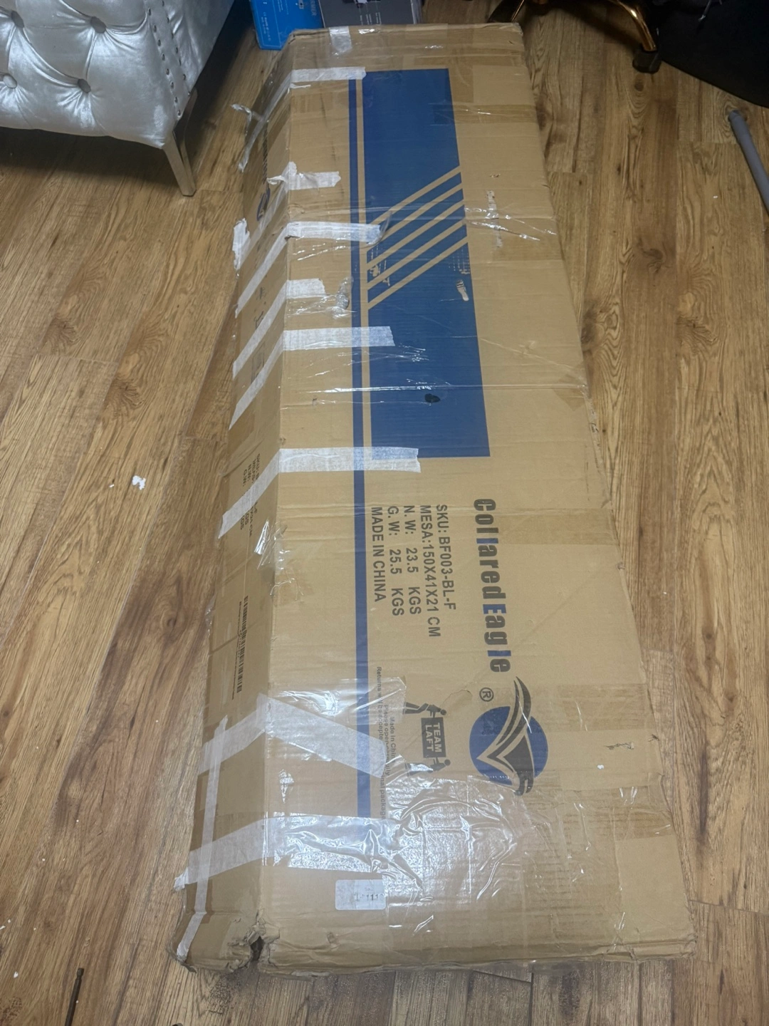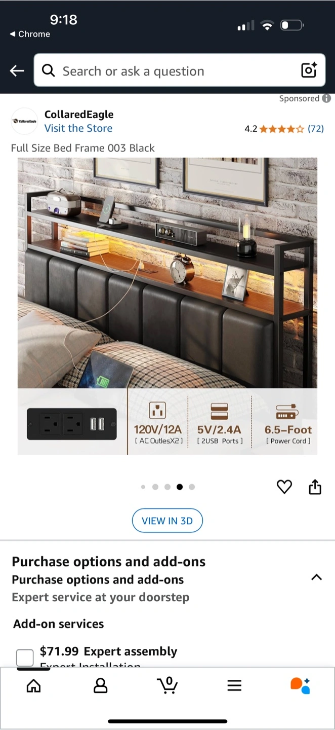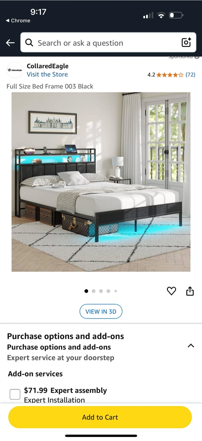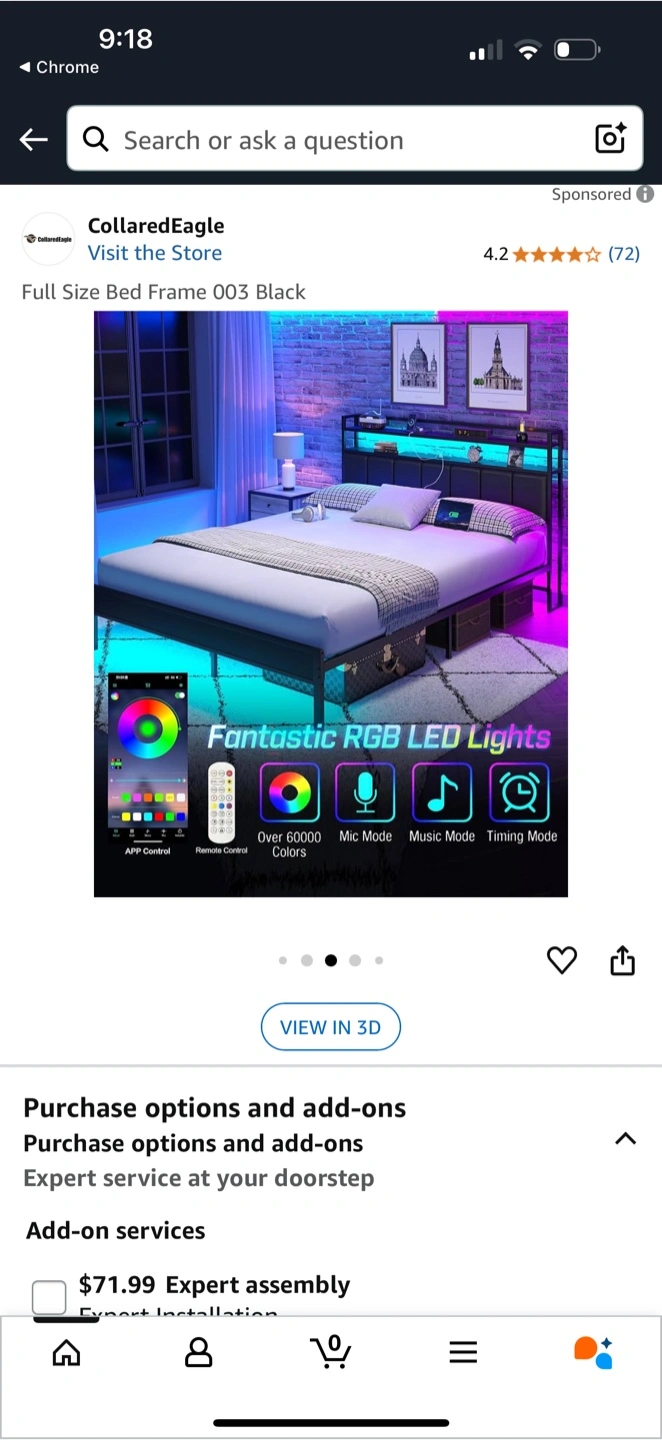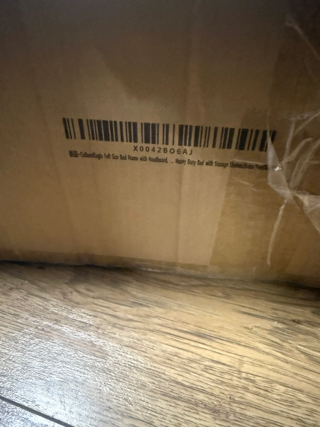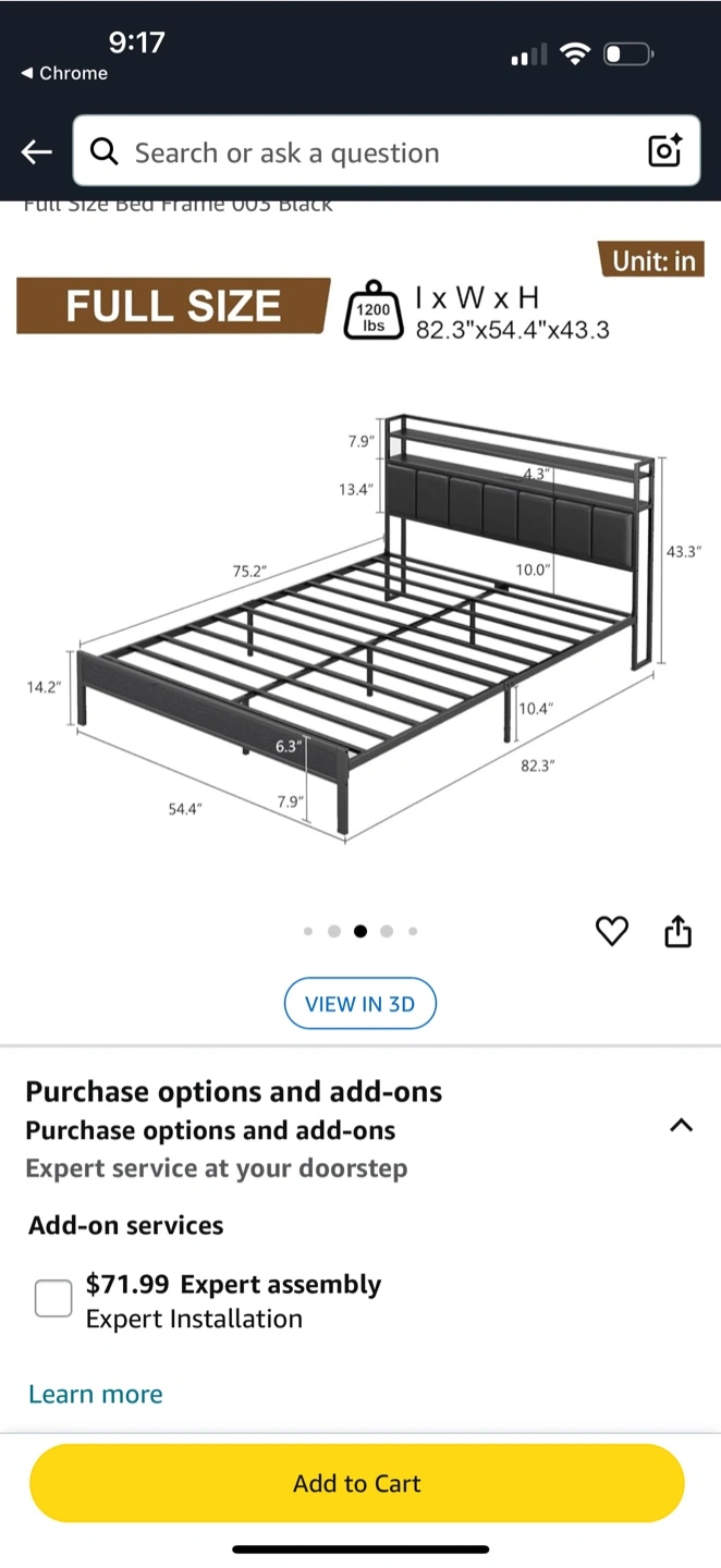 Full size bed frame. Black metal frame with LED lights. Includes headboard with built-in shelf. New, still in original packaging. Easy assembly. Dimensions in second photo Reference https://a.co/d/6h89p7m