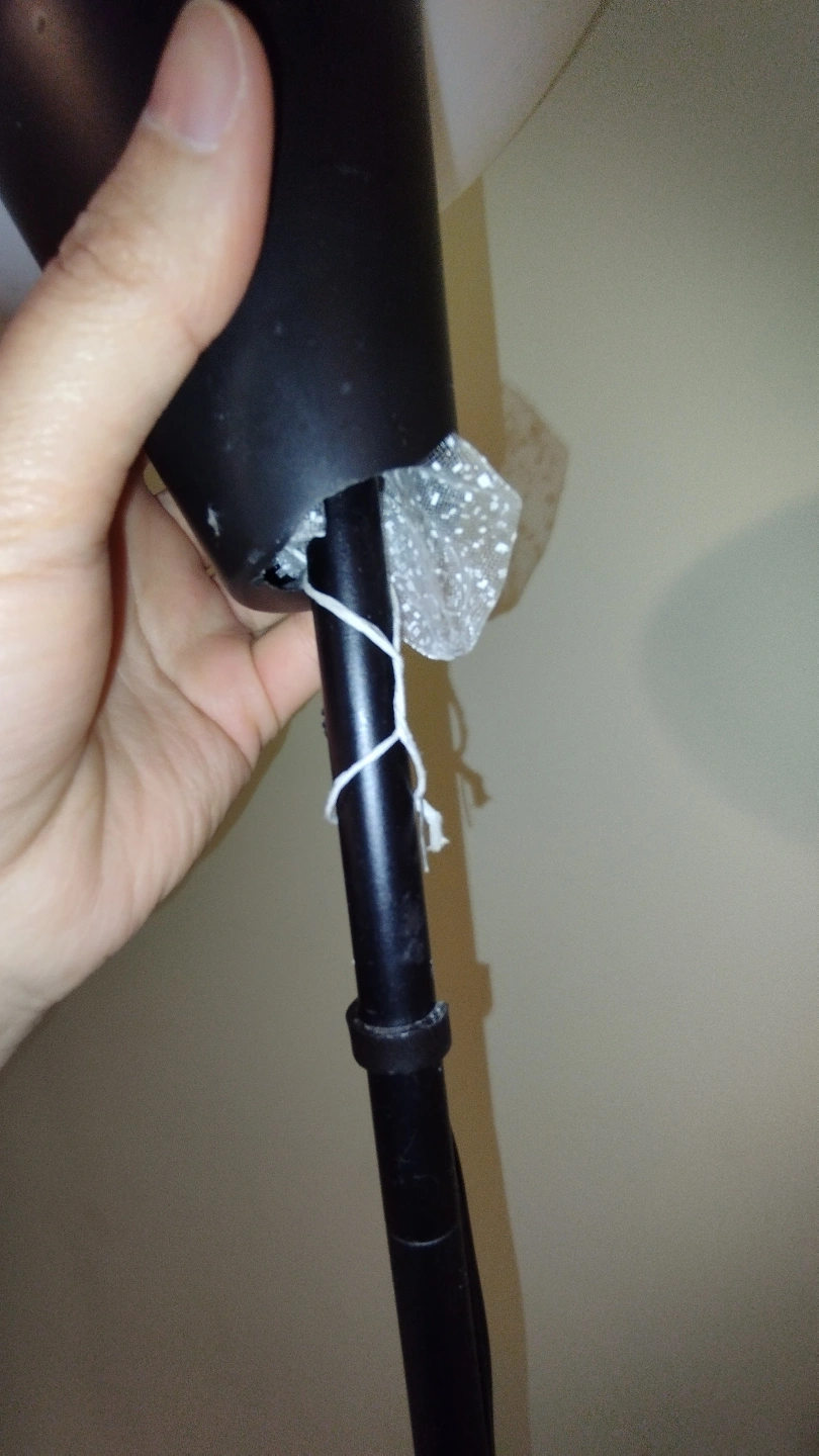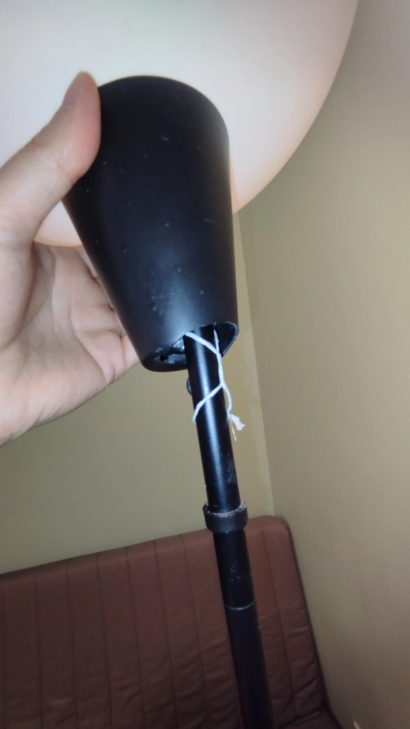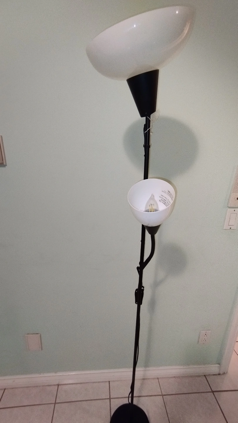 Black metal floor lamp. Two white shades. Adjustable height. Good condition, minor wear. on the main bowl. Need bulbs as well. Actually great works. If you are creative, you can fix easily. Can be divided into pieces for carrying. Pick up near to the Marine Drive skytrain station.