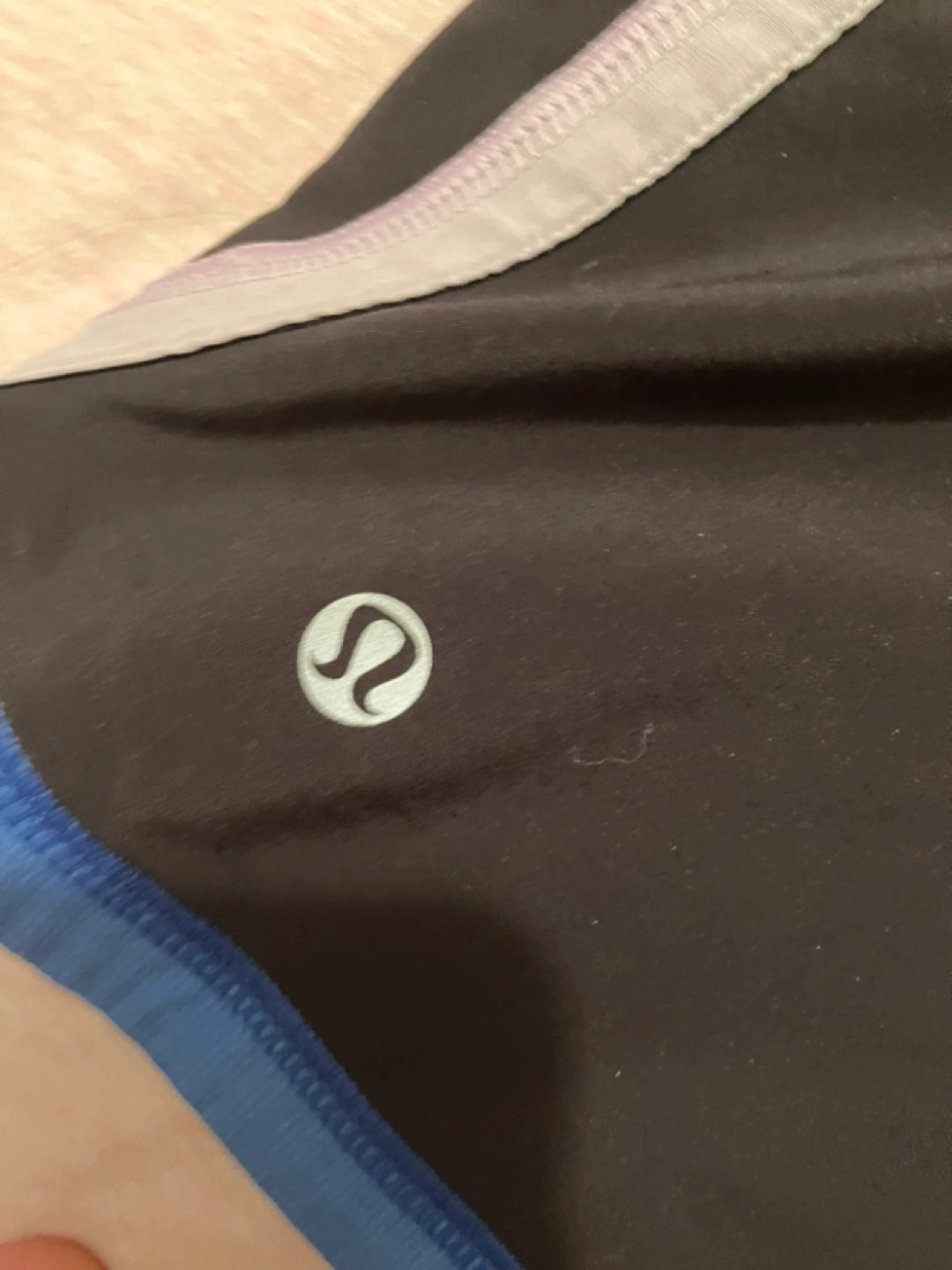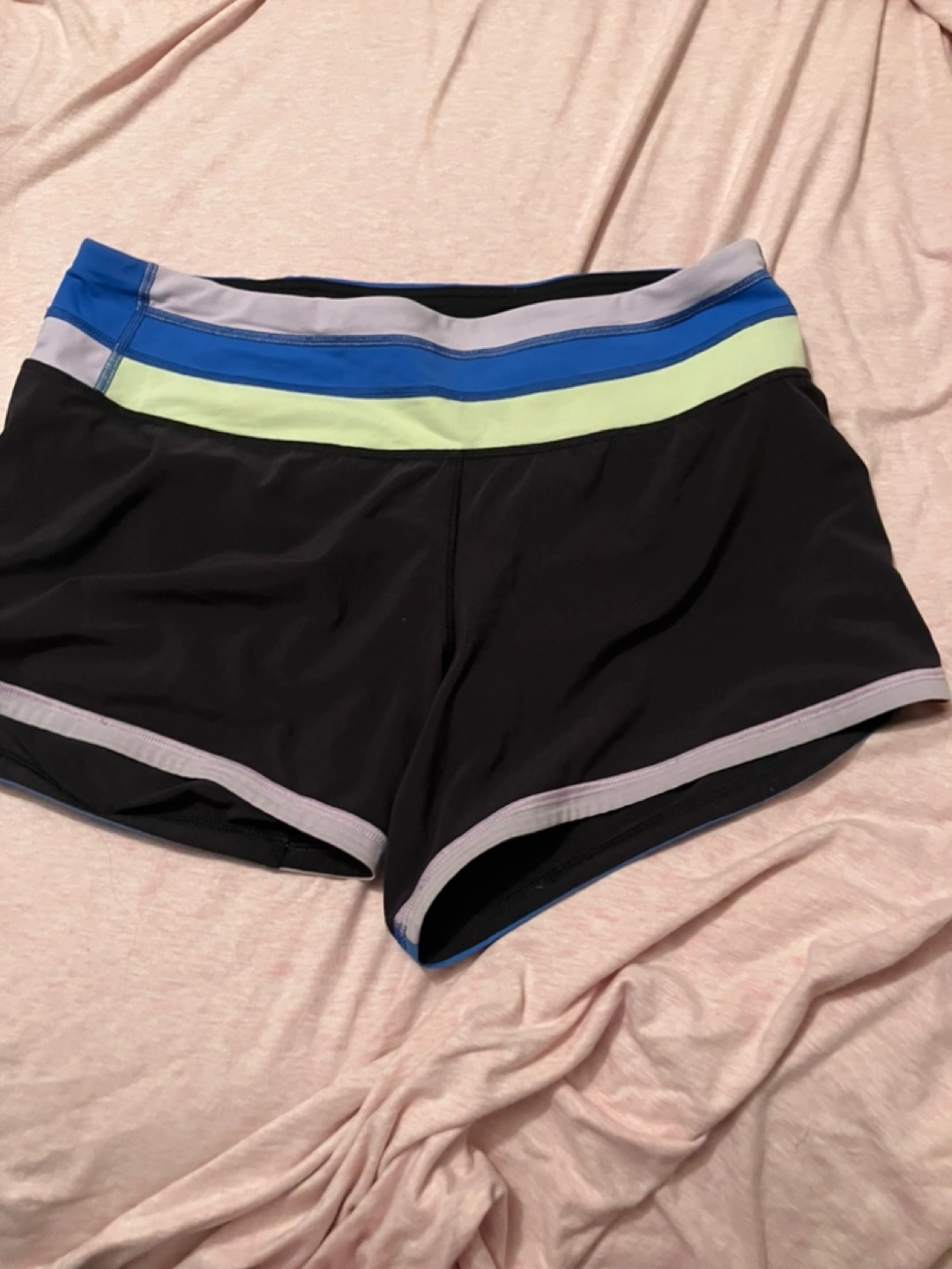 Women's athletic running shorts. Black, blue, and purple accents. Size 4. Back zipper pocket.