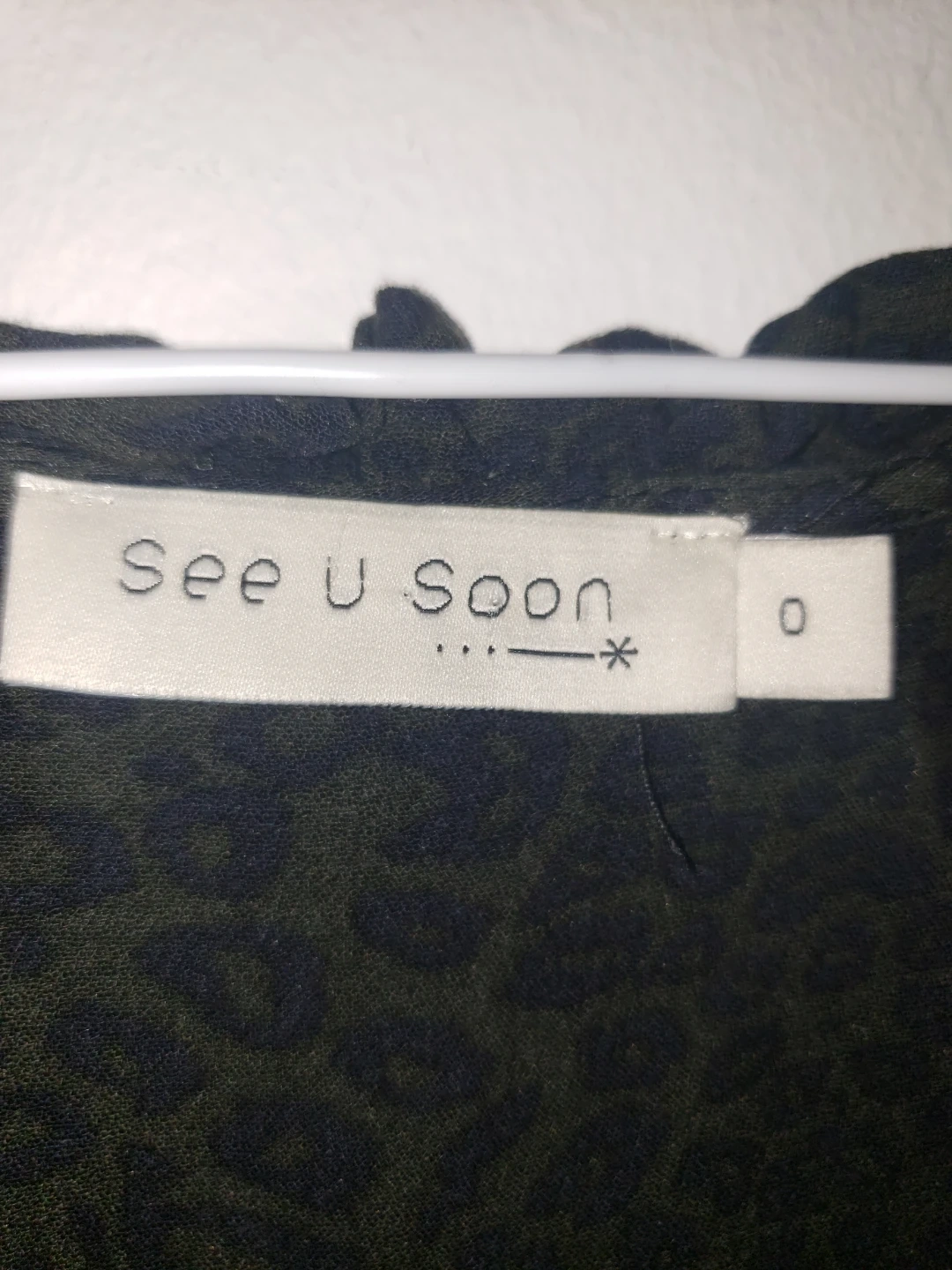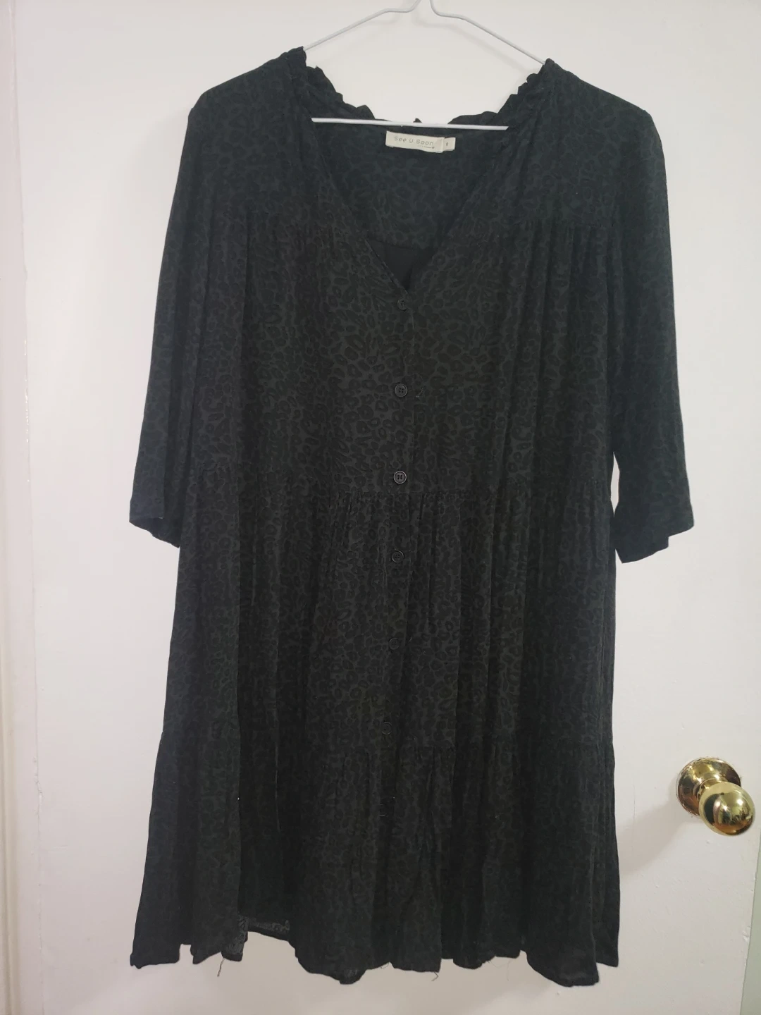 Adorable mini dress. Dark green leopard print. Three quarter sleeves. Button front. Size 0.