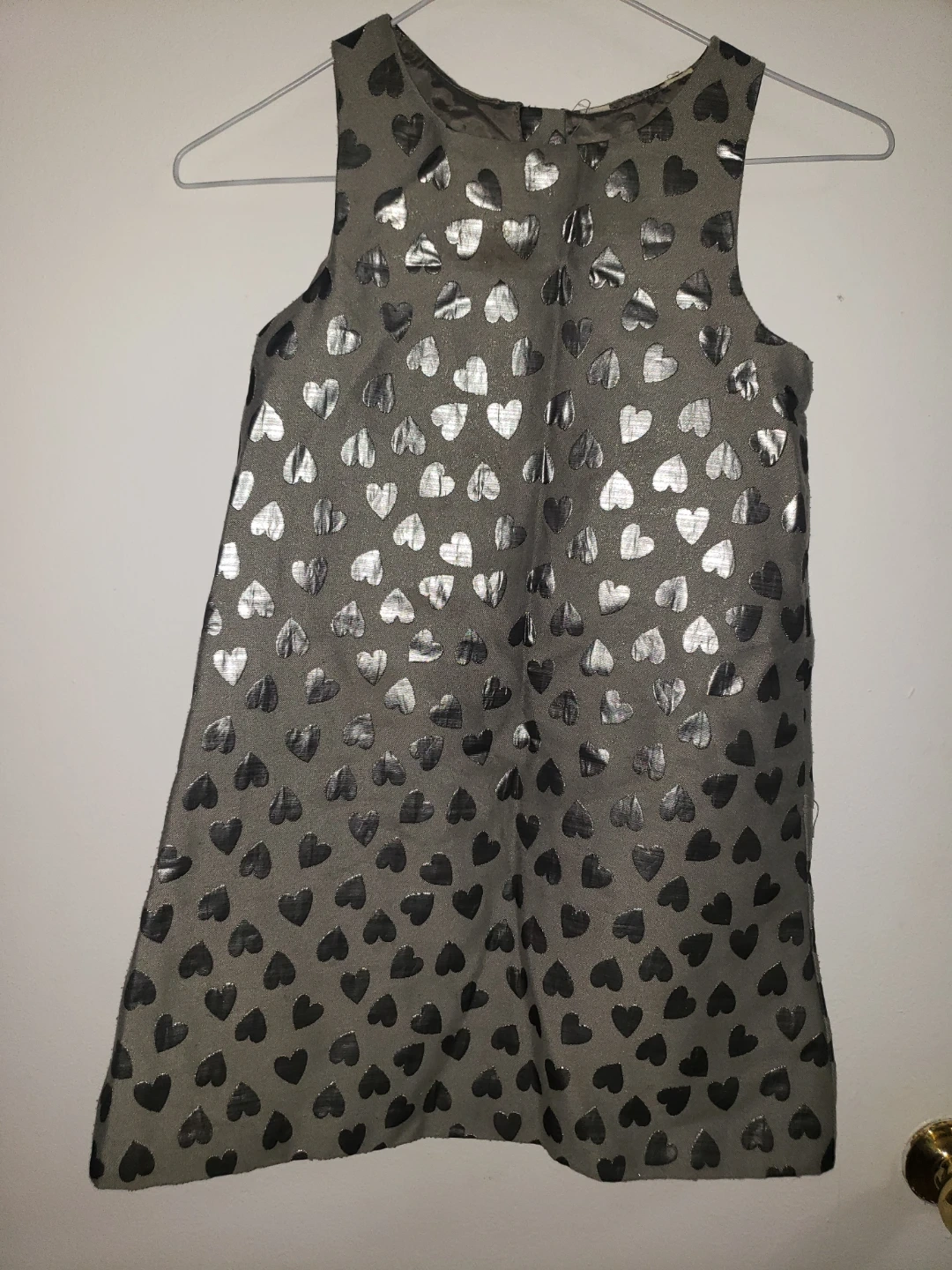 Adorable sleeveless dress. Features an olive green base with a silver heart print. Great for a party or special occasion. Size not specified.