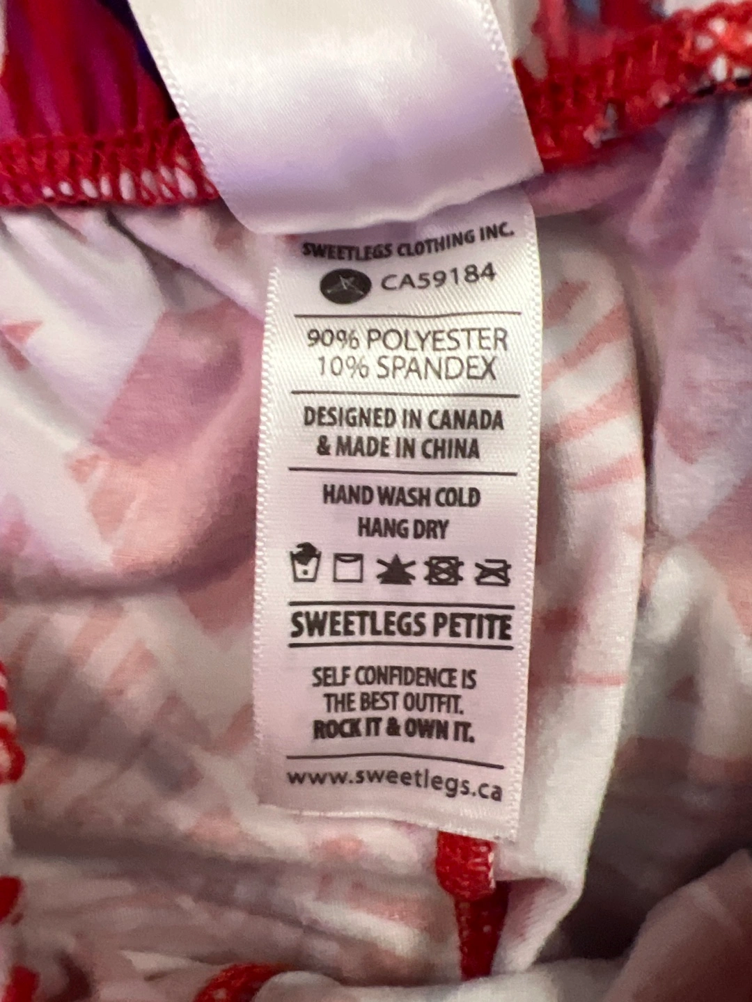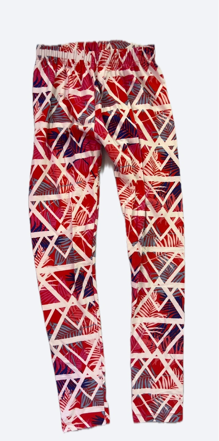 Women's petite leggings. Red, white, and blue tropical print. Geometric design.