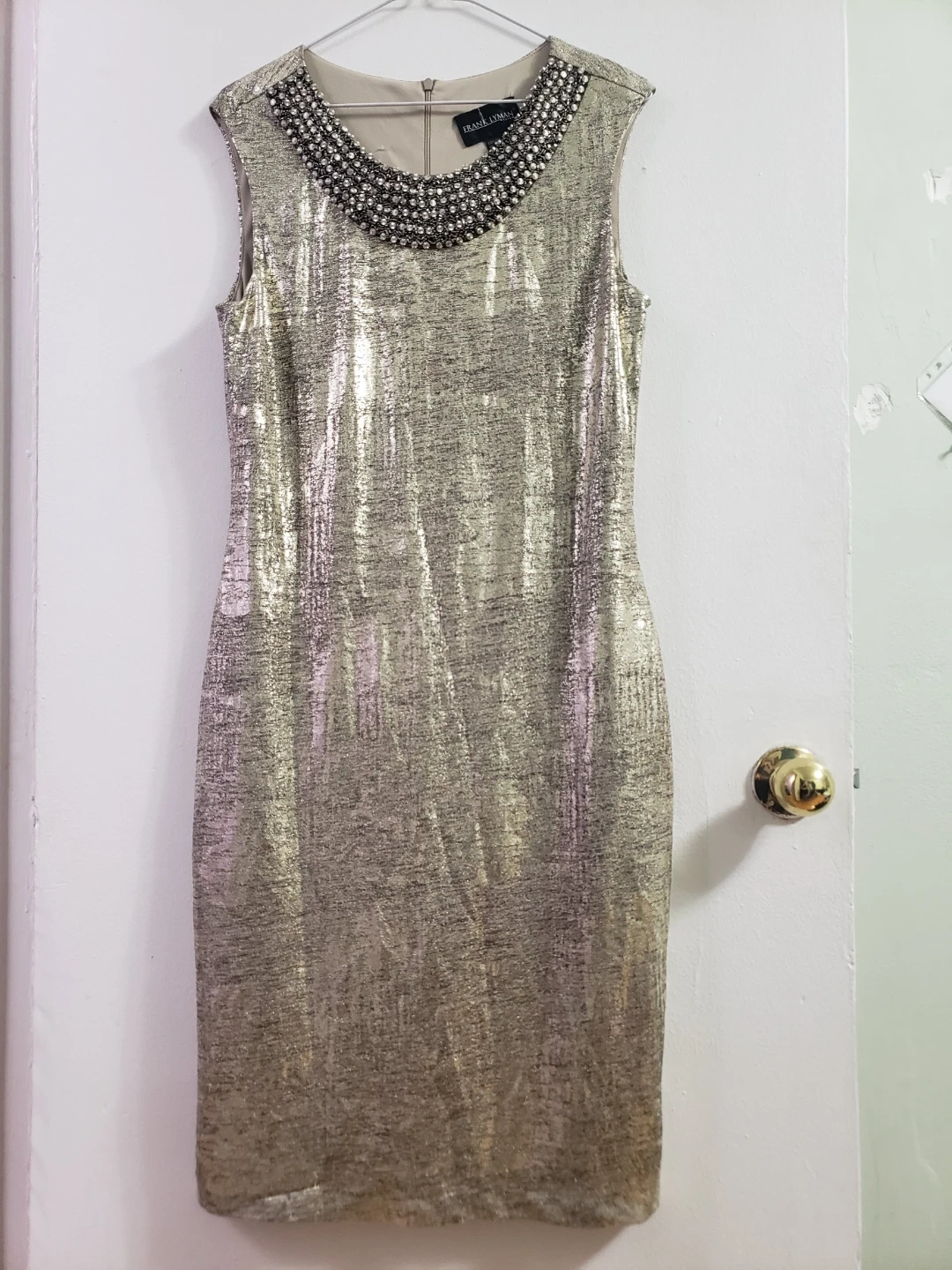 Stunning metallic gold sleeveless dress. Features a beautiful beaded neckline. Perfect for a special occasion.