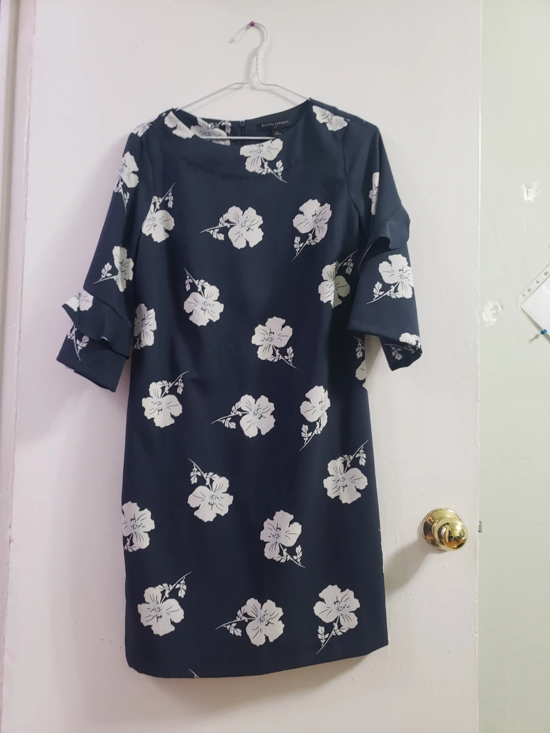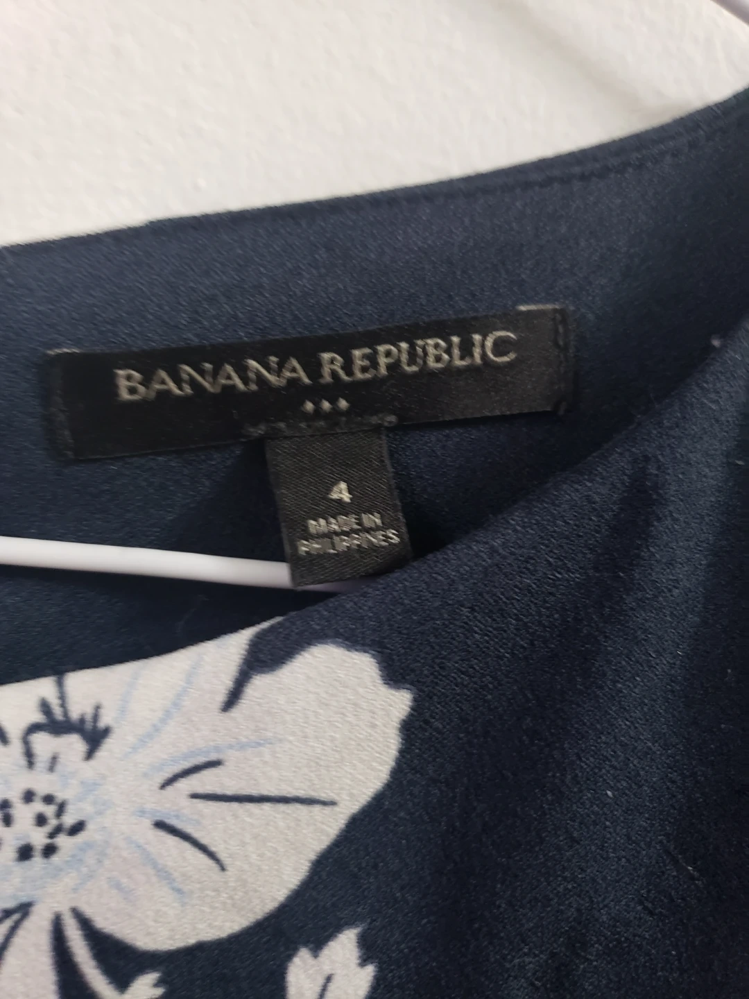 Beautiful navy blue floral dress. Size 4. Three-quarter sleeves. Made in Philippines.