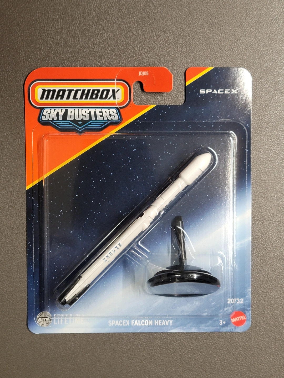 Matchbox Sky Busters SpaceX Falcon Heavy model rocket. Collectible die-cast model with stand. Part of the Matchbox collection.