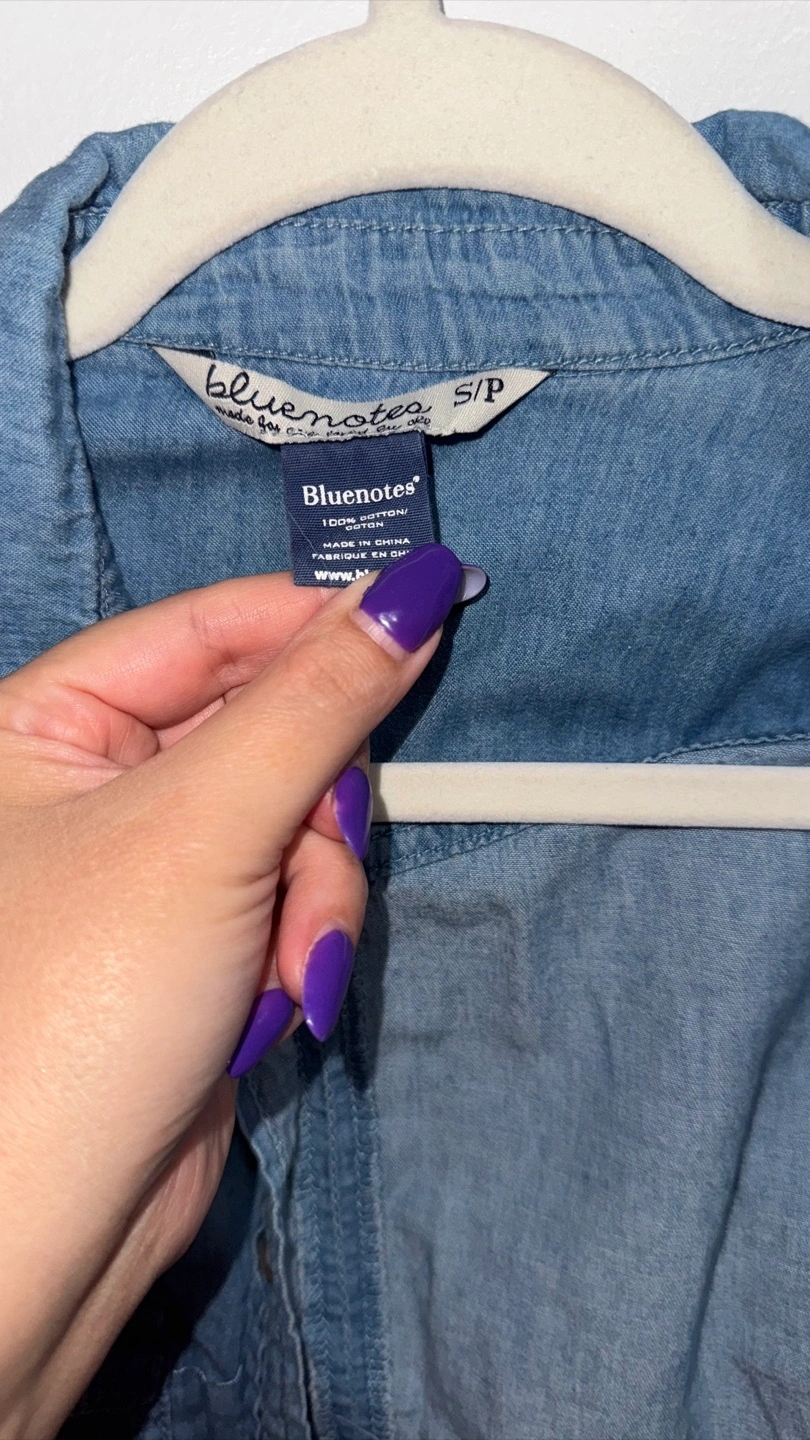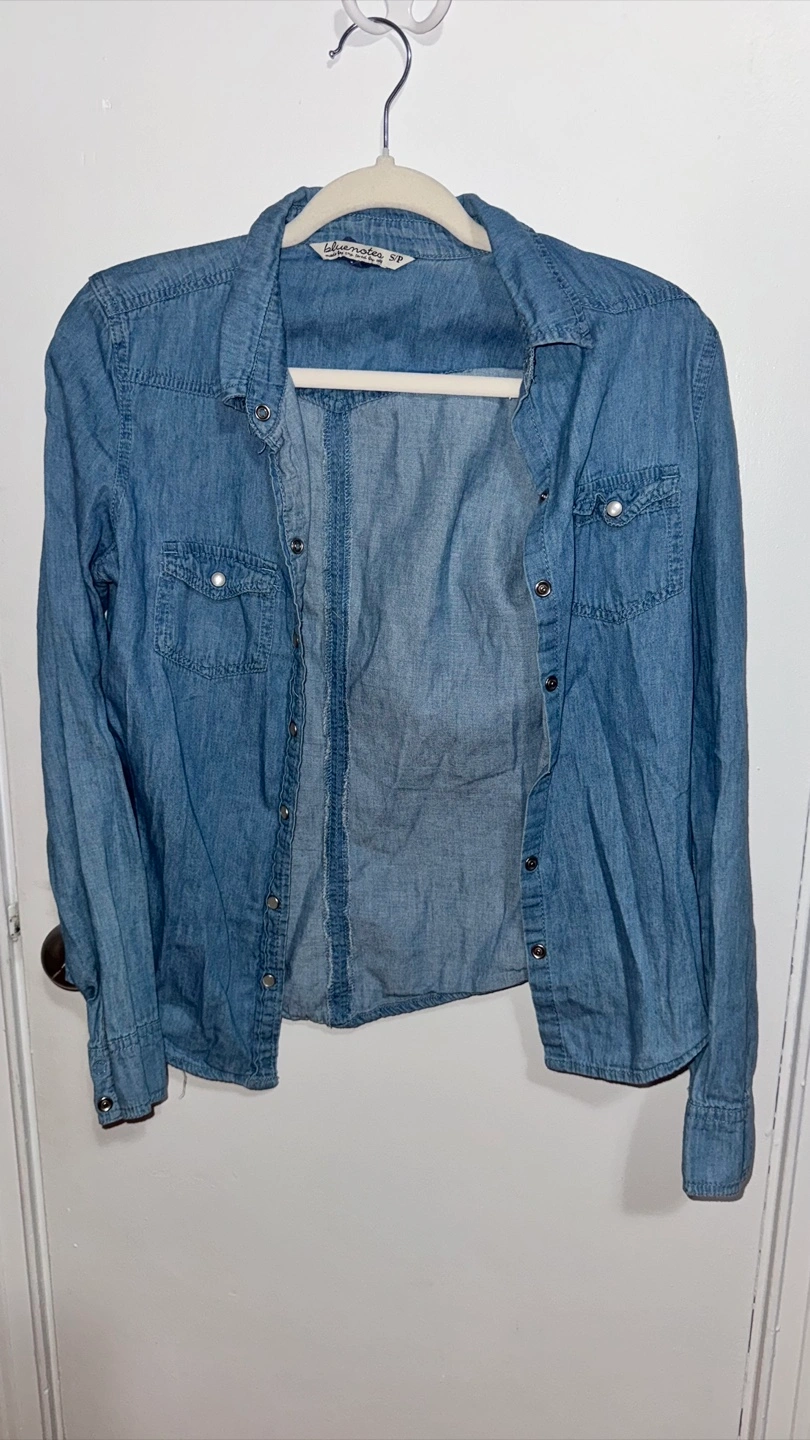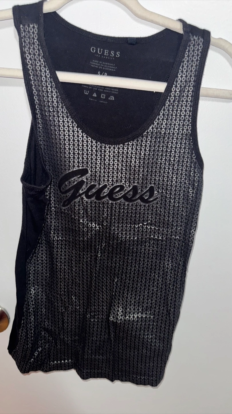 Bundle includes a black GUESS tank top with sequin detail and a light wash Bluenotes denim button-up shirt. Both items are women's clothing. Size small. $15 for both $10 each