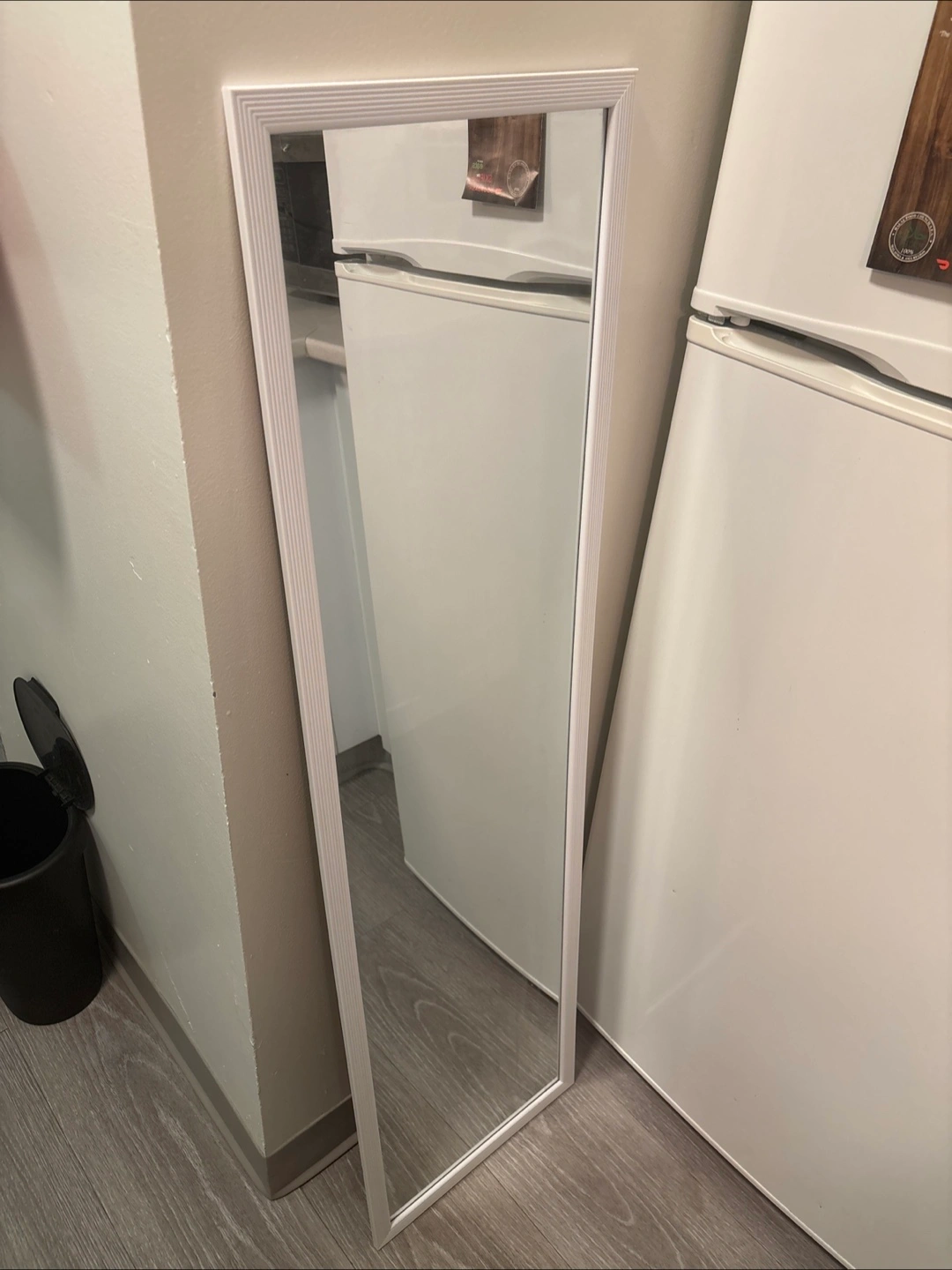 Tall, rectangular mirror. White frame. Great for a bedroom or hallway. Lightweight and easy to hang.