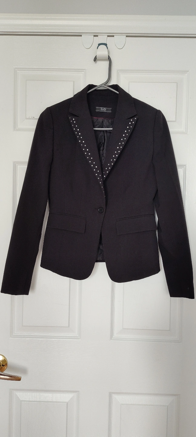 Stylish black blazer. Features silver studs along the collar. Single button closure. Great for work or special occasions. Check out my other listing. There may be something else you're also interested.
