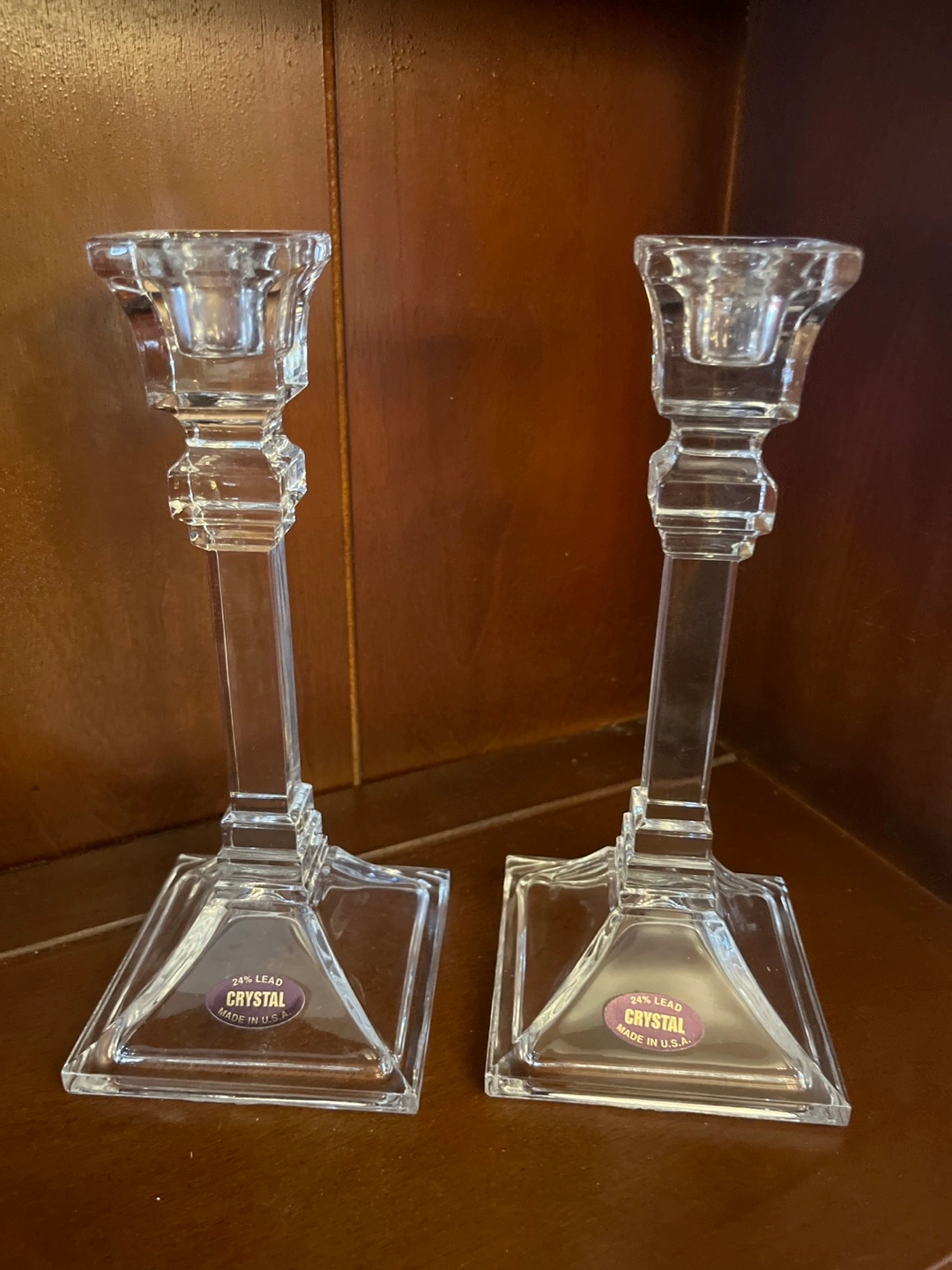 Elegant pair of crystal candle holders. Square bases and ornate detailing. 24% lead crystal. Made in the U.S.A.