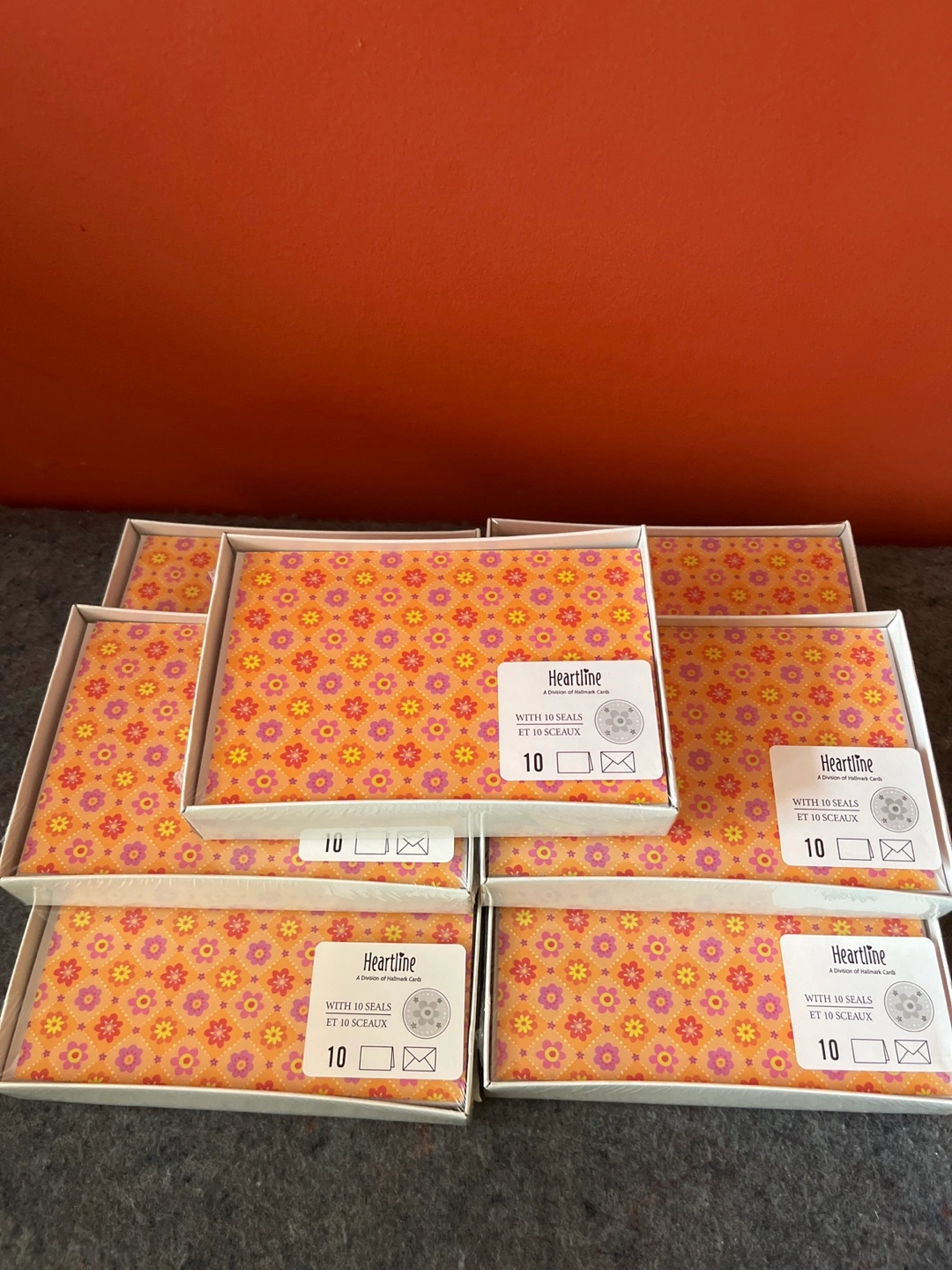 Ten blank notecards and envelopes. Orange floral pattern. Comes in a box. Perfect for personal correspondence. 7 packages. $15 for all