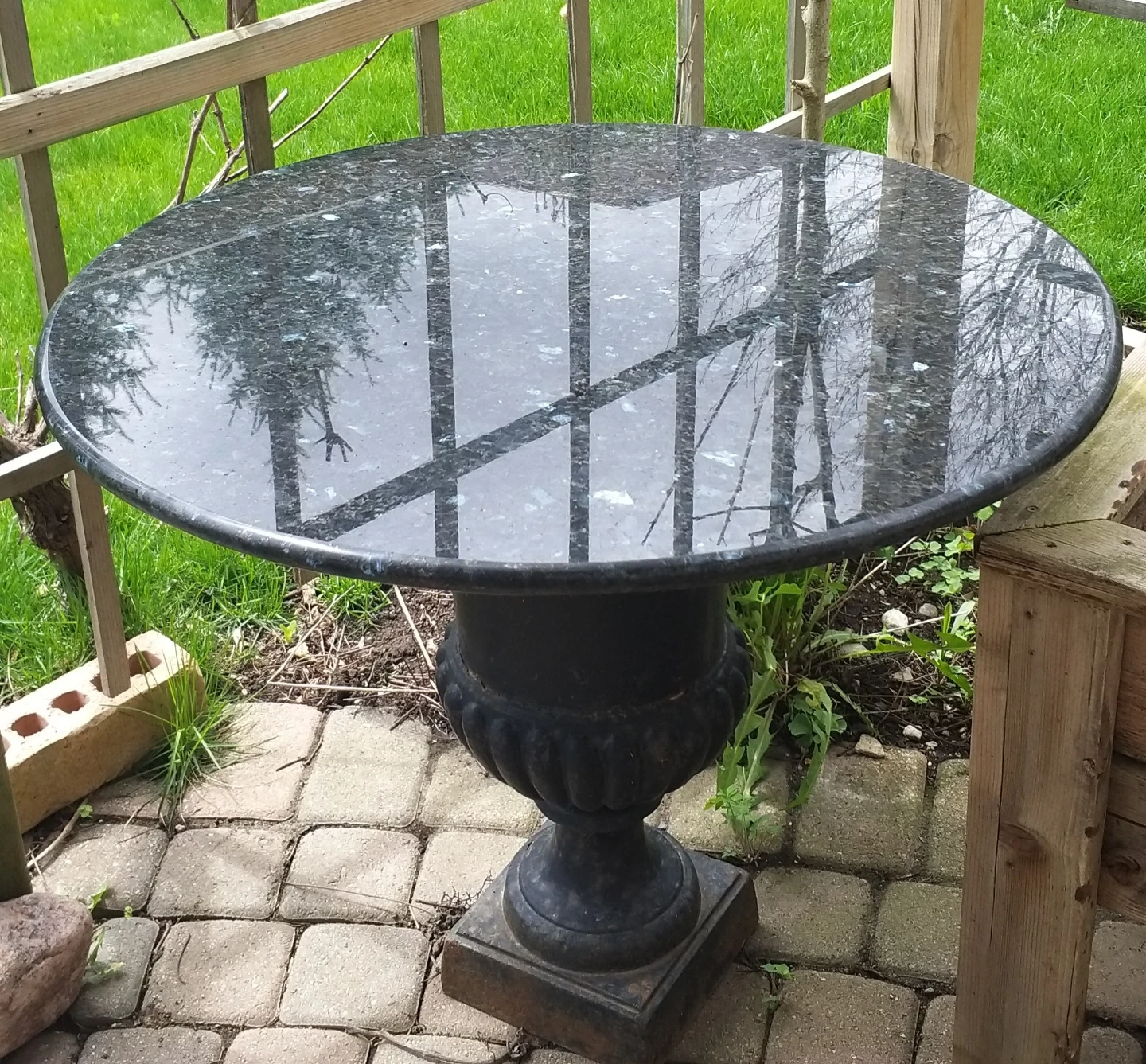 Round granite tabletop. Cast iron pedestal base. Perfect for your patio or garden. Some surface rust on the base.