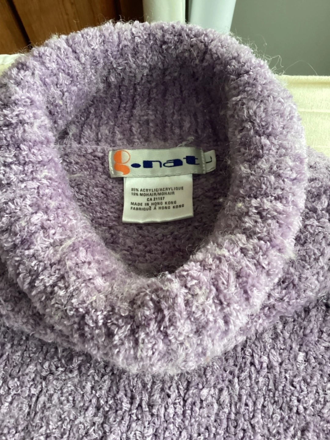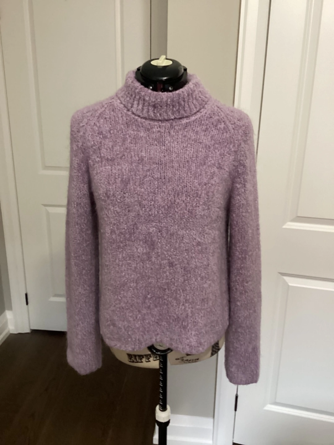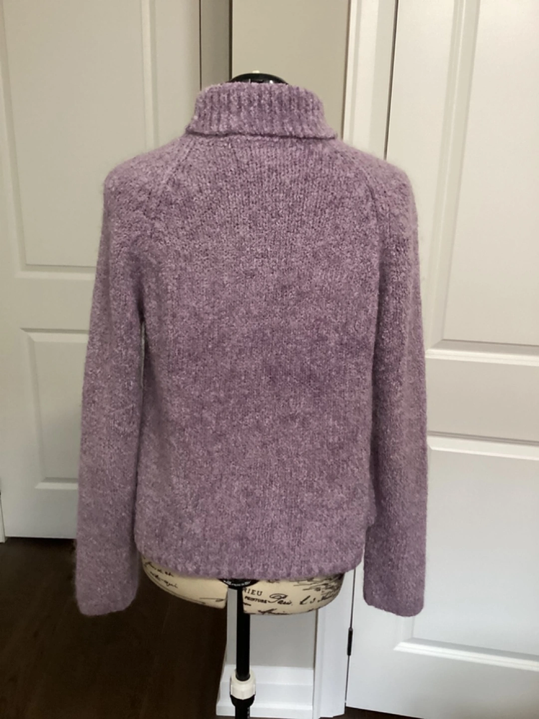 Ladies Turtleneck Sweater, beautiful lavender colour, 85% Acrylic 15% Mohair, Size Large, $10 or best offer. Chest 37” Bottom width 40” Centre back length 21 1/2”