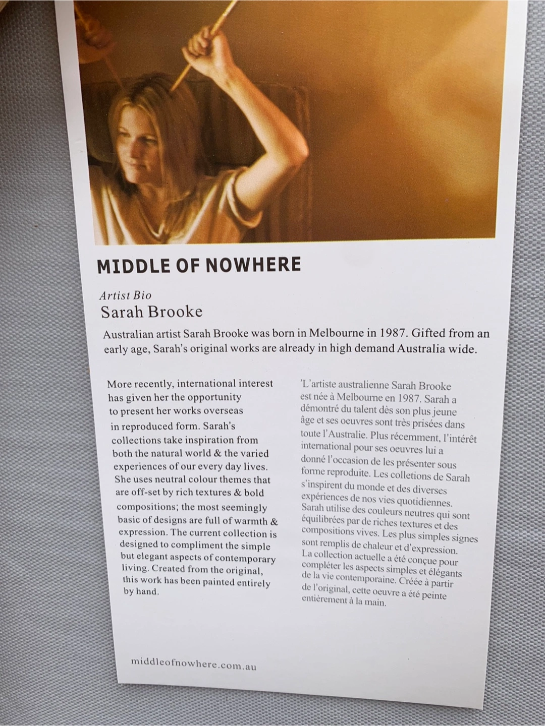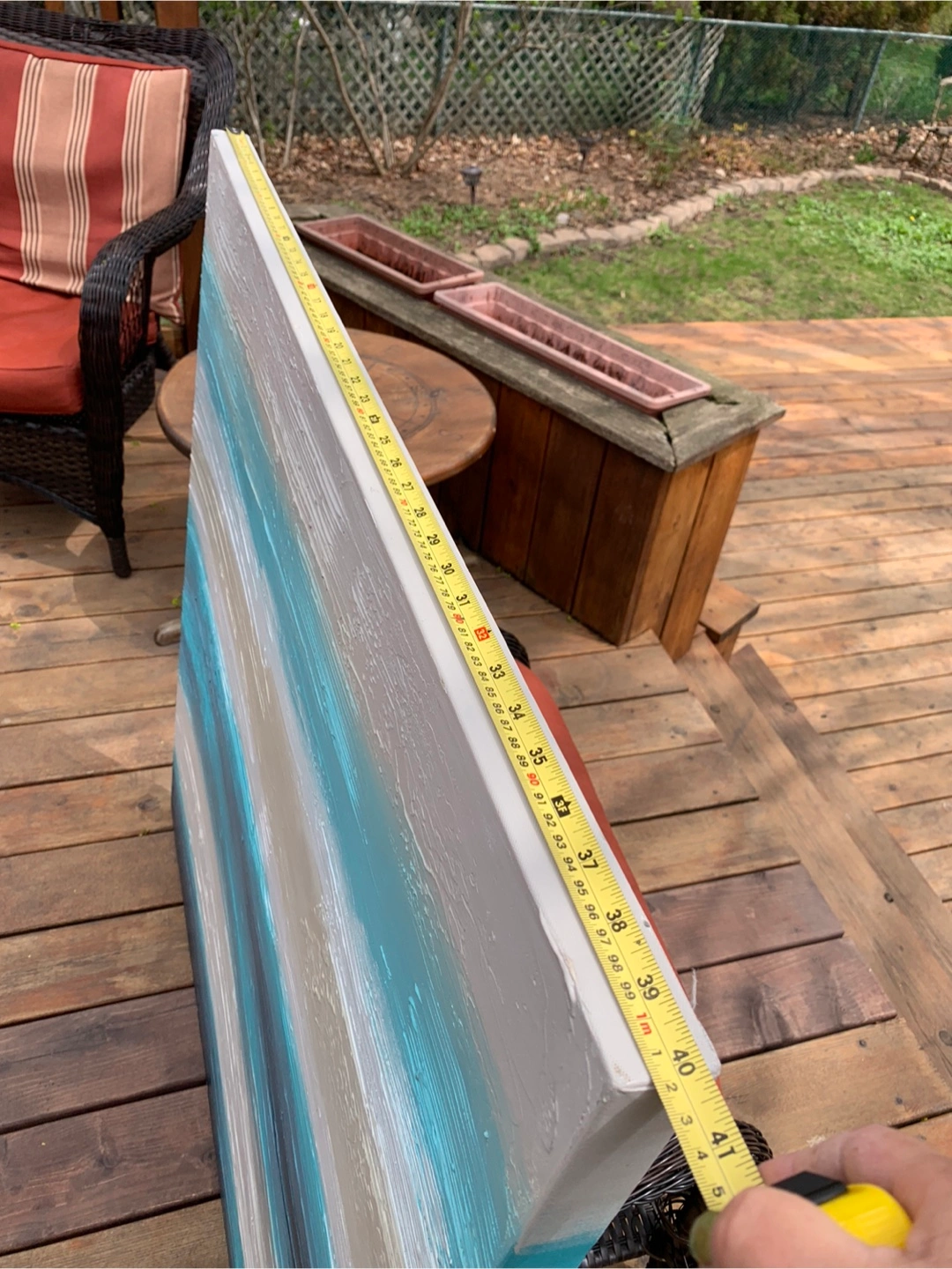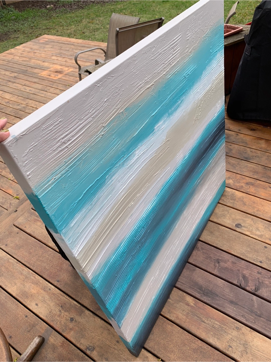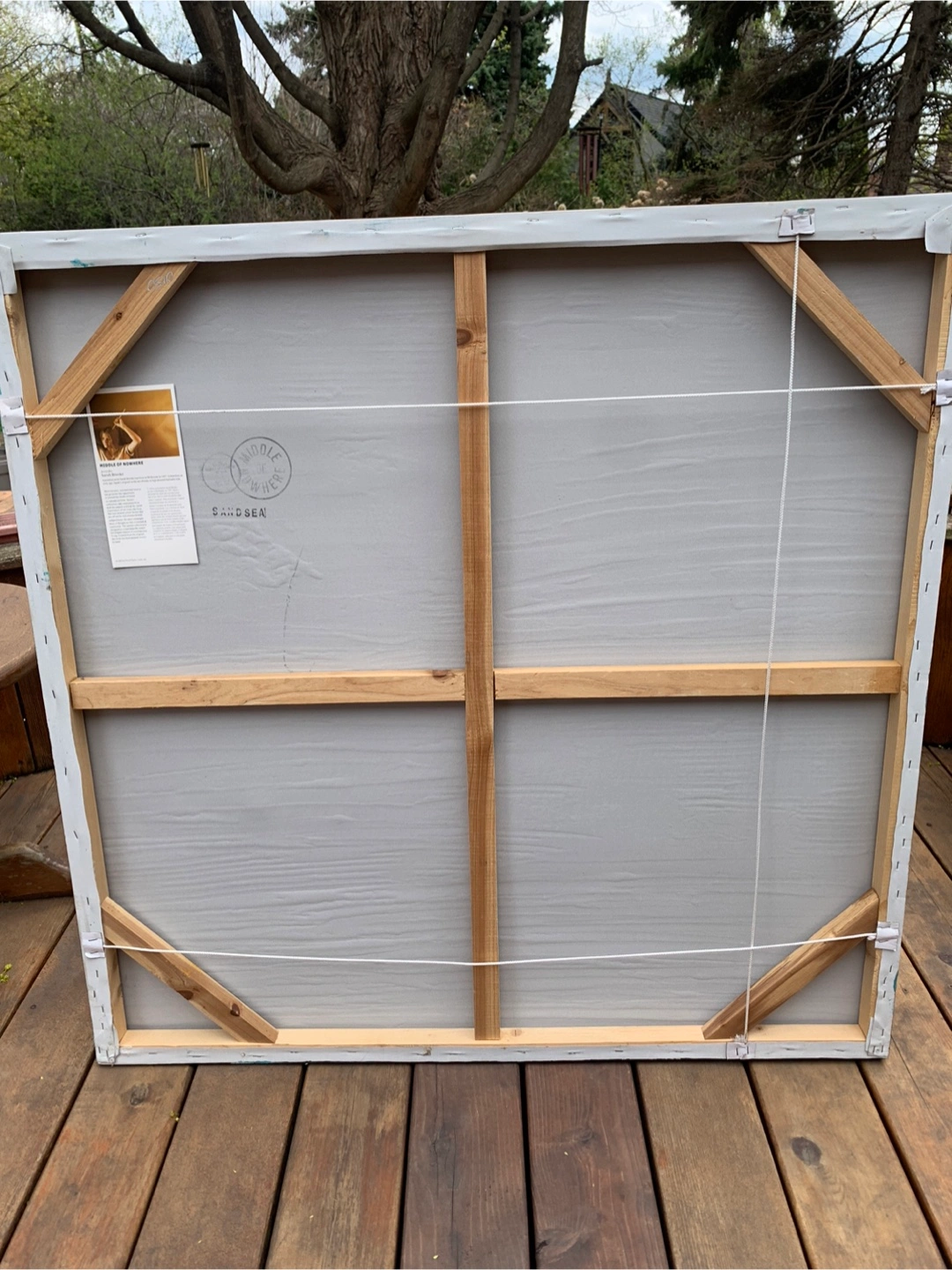 Gorgeous large abstract hand-painted reproduction painting by Sarah Brooke from Australia. Colours feature beach vibes of blue, teal and beige tones. Textured palette knife style. Canvas stretched on wooden frame. It is 40” x 40”. Comes with artist's card on the back and is stamped from her Middle of Nowhere series entitled SANDSEA. A very calming piece of art work to be enjoyed. Cash only please.