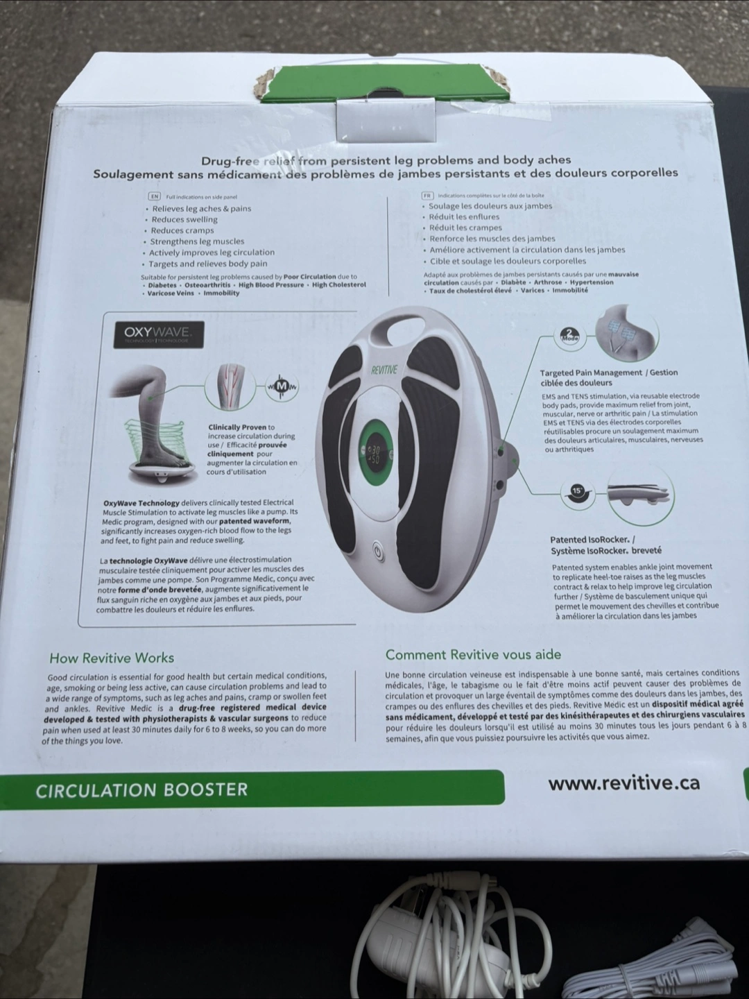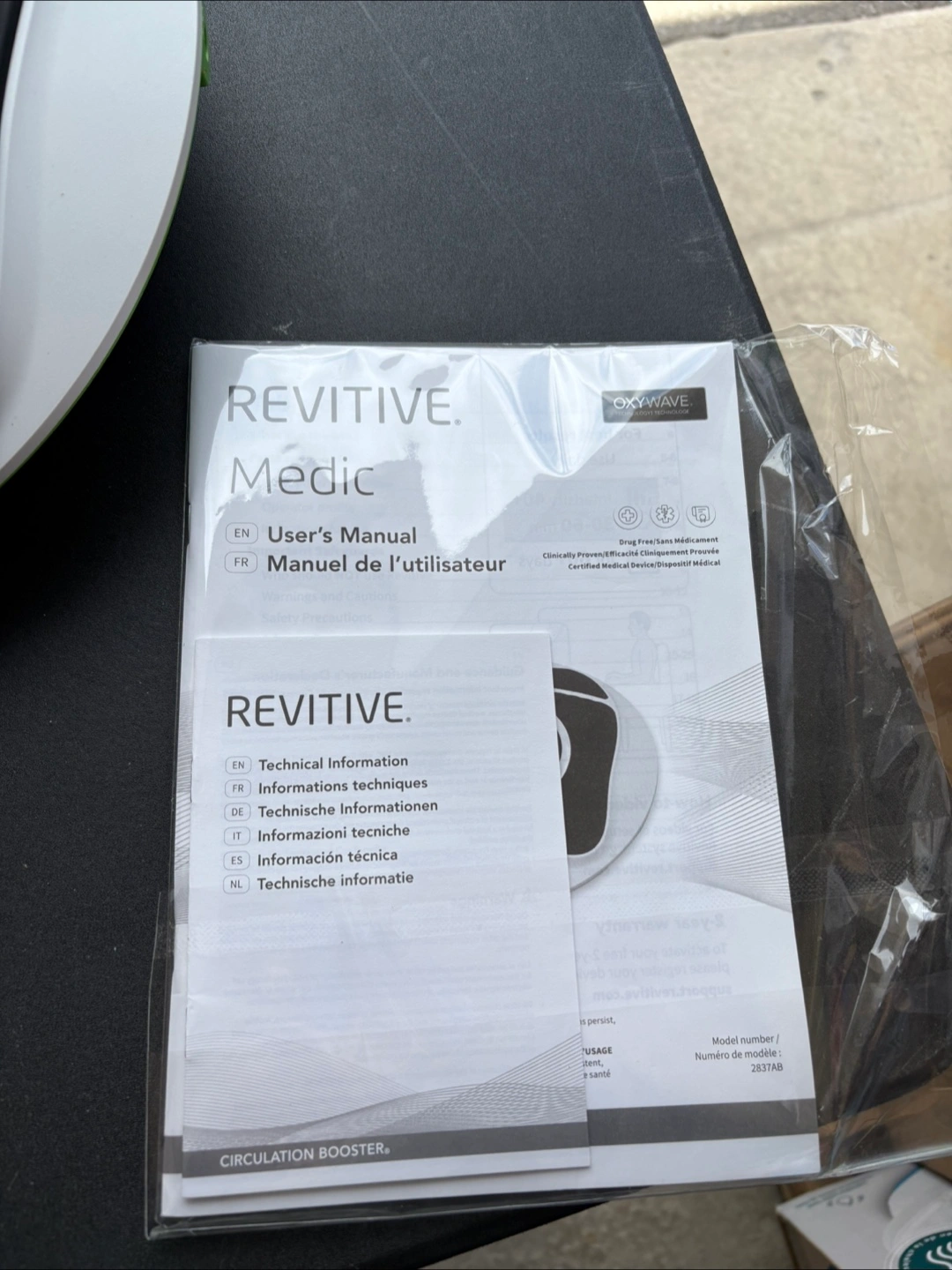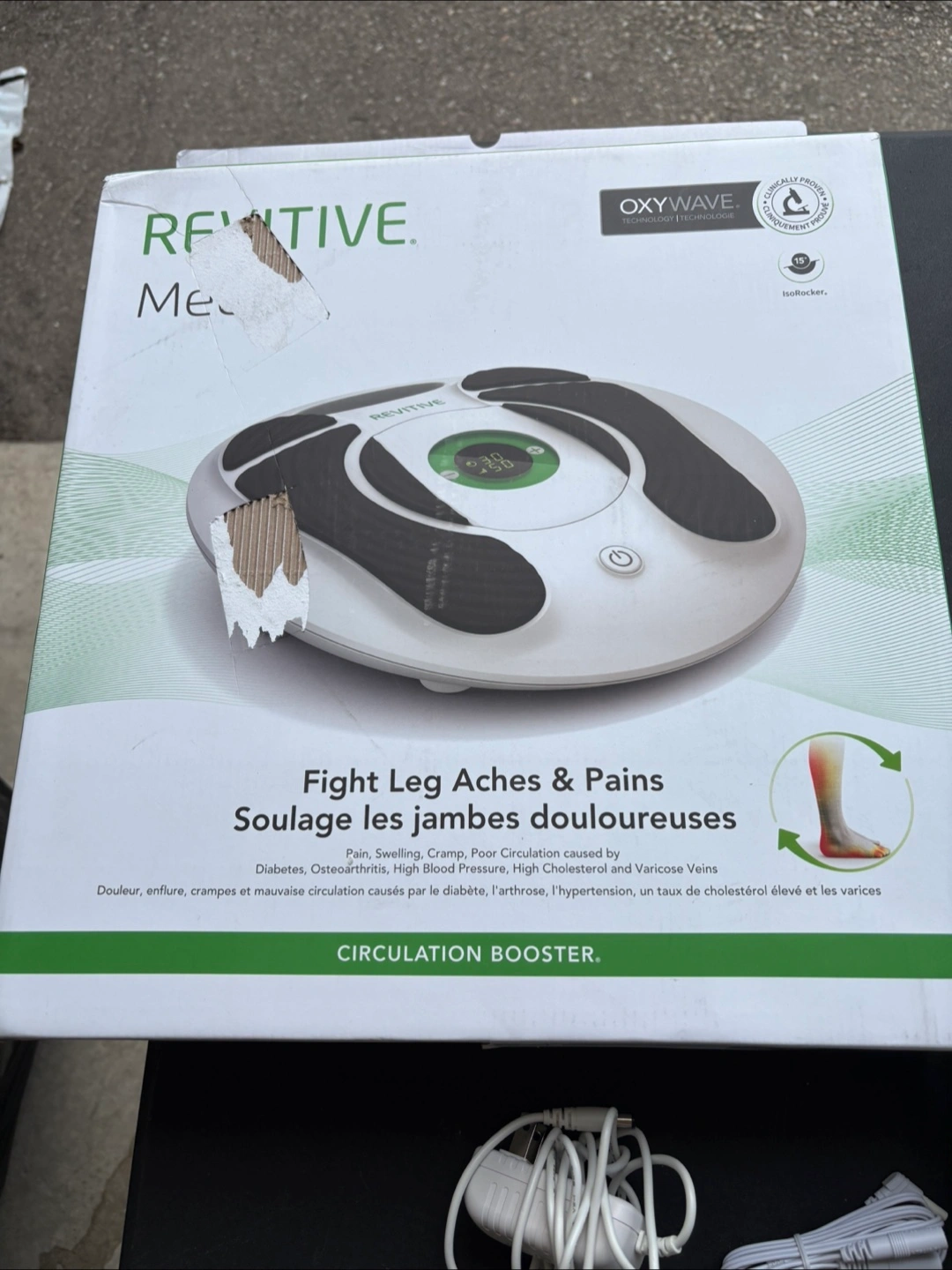 Description: Selling a brand new, never used Revitive Medic Circulation Booster. Everything is included: • Original box • Remote control • Power adapter • Electrode pads (sealed) • User manuals Perfect for improving blood circulation and relieving: • Leg pain, swelling & cramps • Discomfort from diabetes, arthritis, high blood pressure, and varicose veins Clinically proven with OxyWave Technology. Retails for over $300+ CAD.