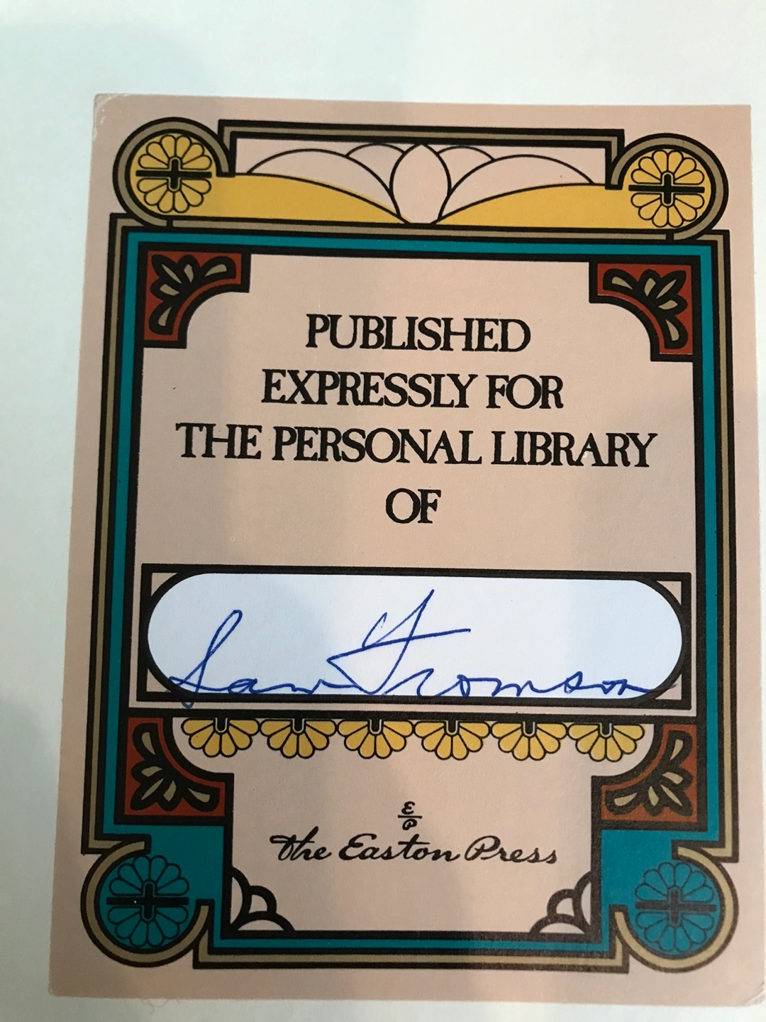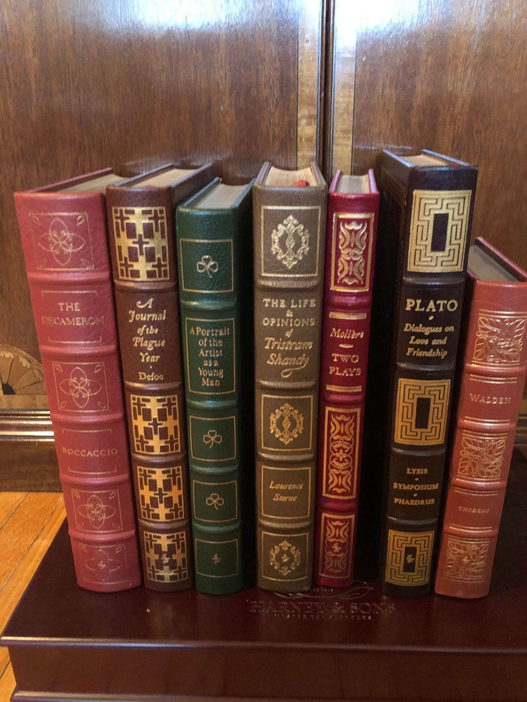 Collection of classic literature titles. Titles include Boccaccio (SOLD), Defoe, Wilde, Sterne, Molière, Plato, and Thoreau. Bound in leather, silk moiré end pages, satin ribbon, beautiful illustrations, 22K gold accents and gilded page ends. Each book has a name plate of owner (see photo). You could put your own over it or simply not care. Beautiful decorator pieces. Each priced individually. Let me know which title you’re interested in and I will give you a price. Two Plays - Molière - 40.00 The Decameron - Boccaccio - SOLD A Journal of the Plague - Defoe - 70.00 Dialogues on Love and Friendship - Plato - not first edition - 25.00 The Life & Opinions of Tristram Shandy - 50.00 Walden - Thoreau - 40.00 A Portrait of the Artist as a Young Man - James Joyce - 40.00
