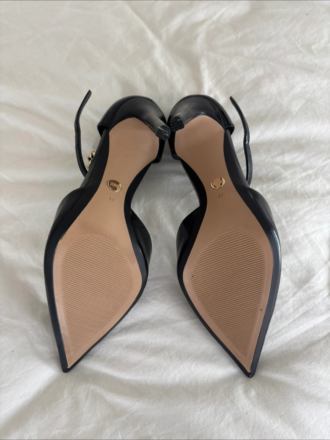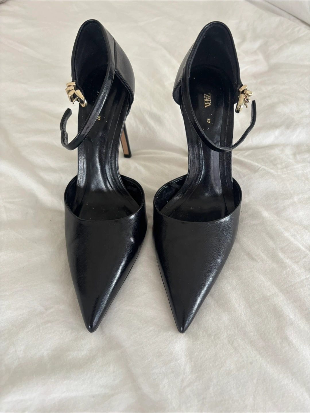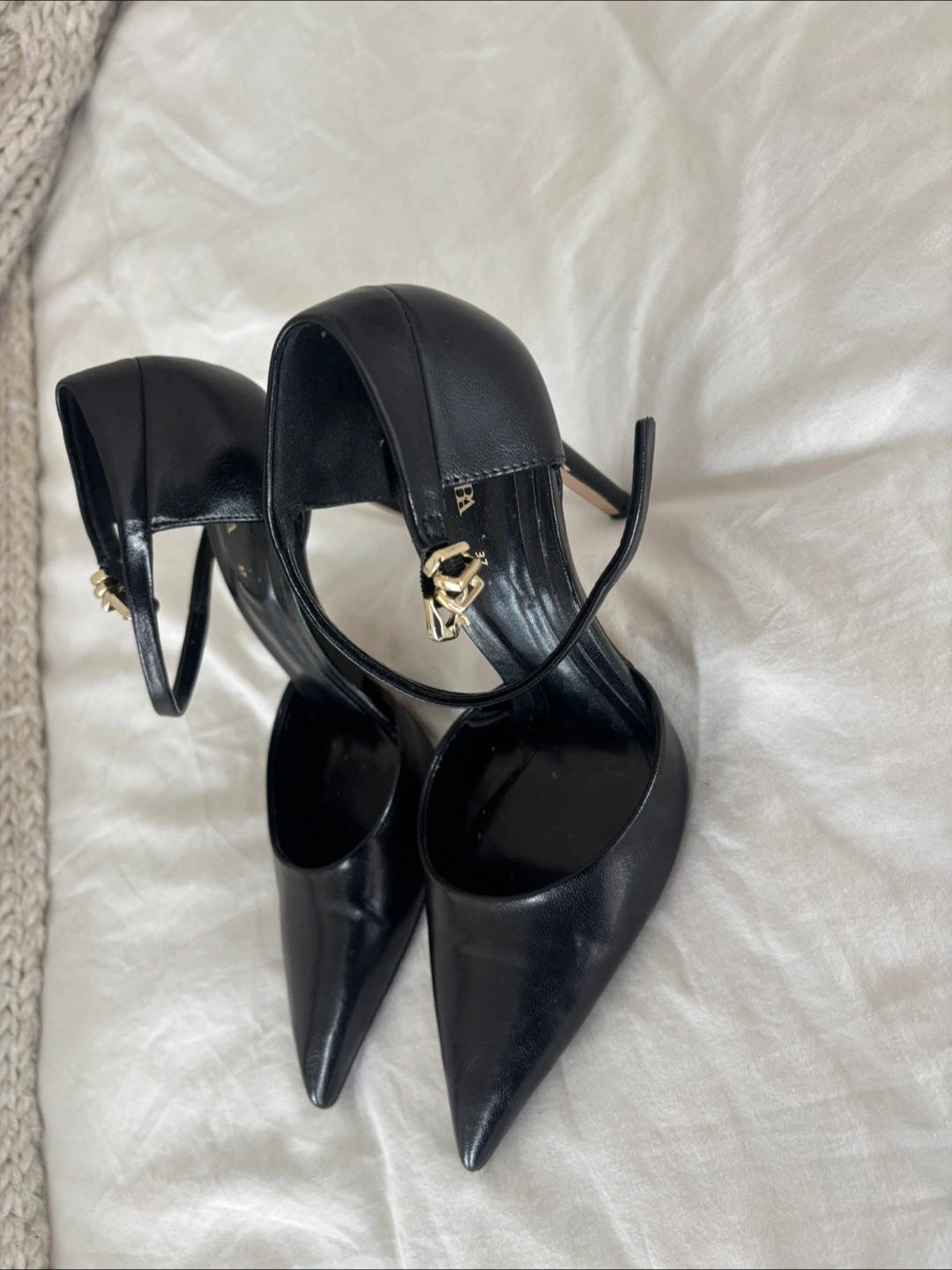 Elegant black leather high heels. Pointed toe and ankle strap with gold accents. Size 37.