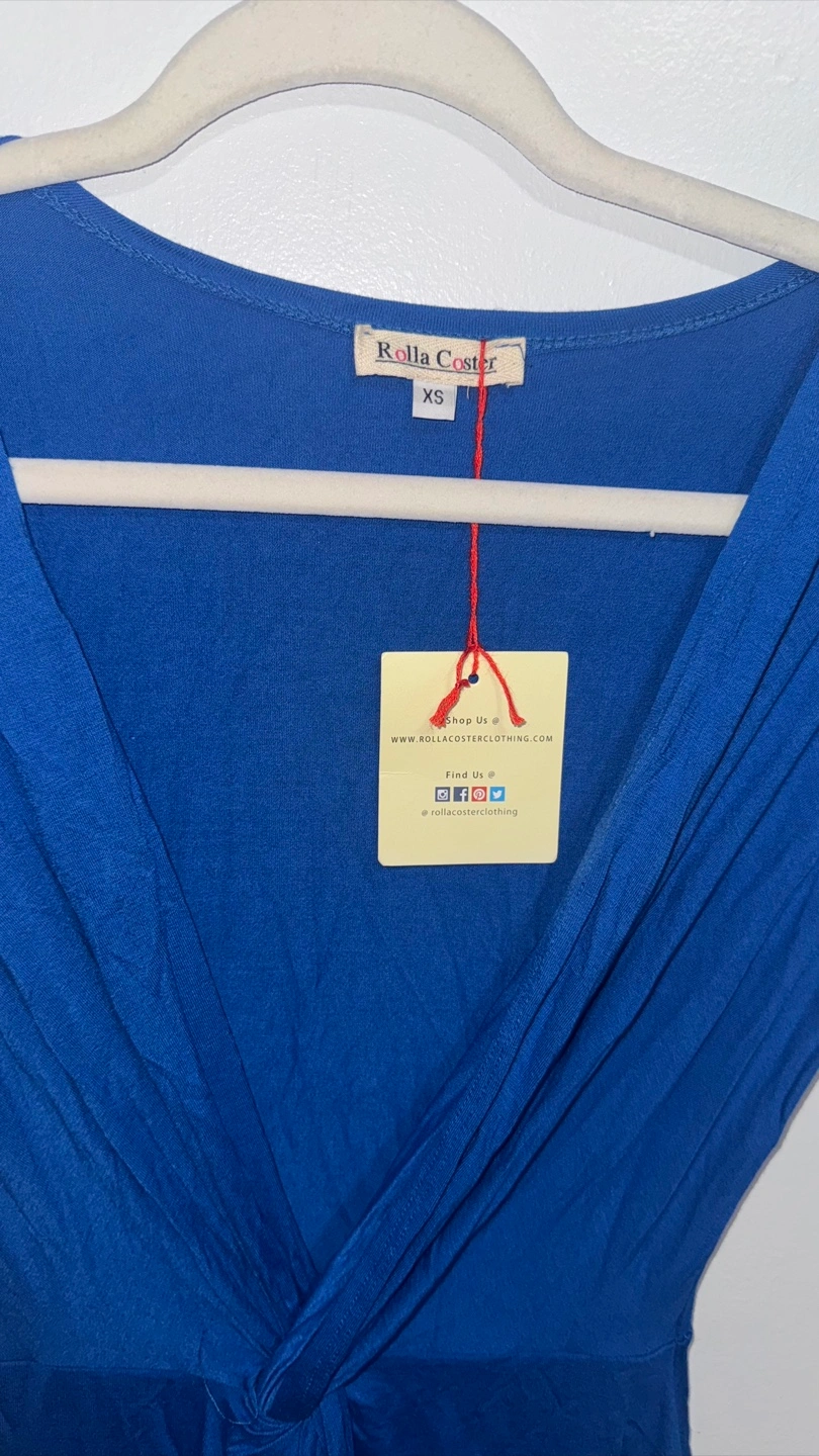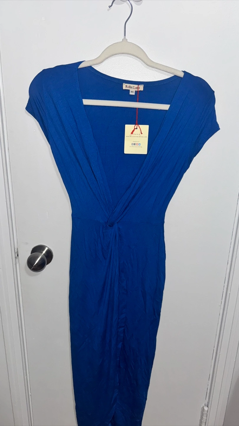 Stunning cobalt blue midi dress. Features a flattering V-neckline and knot detail at the waist. Short sleeves. Size extra small.