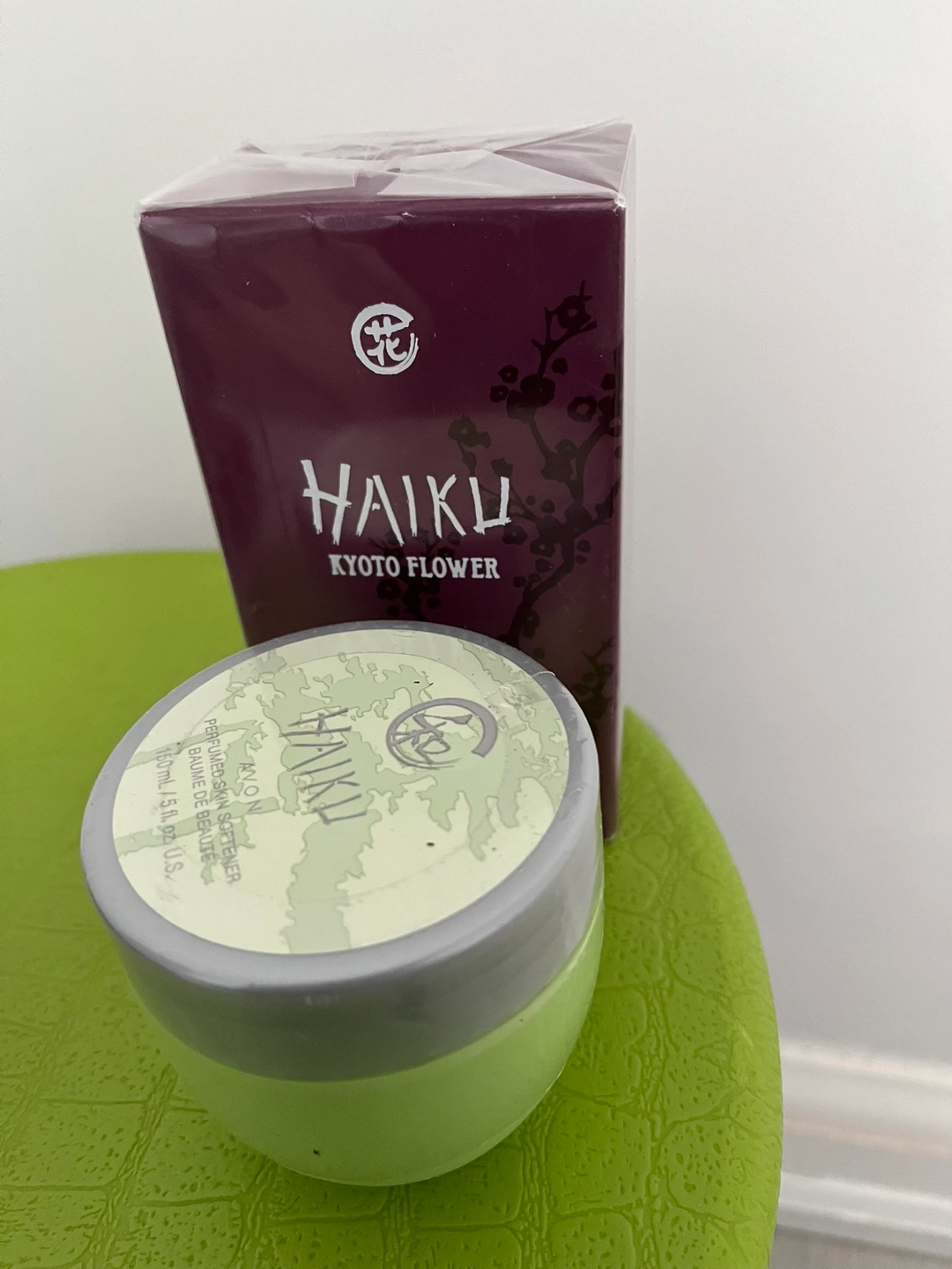 Lightly Haiku Kyoto Flower perfume and body cream. Set includes a small perfume and a jar of body cream. Both are in excellent condition. I have lots of nice gifts to sell from Avon. Check my website Www.Avon.ca/boutique/EmilyT
